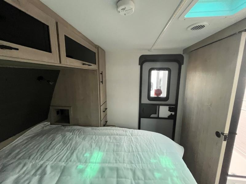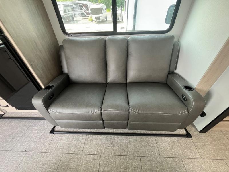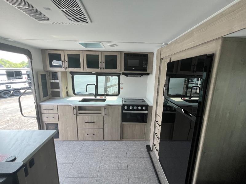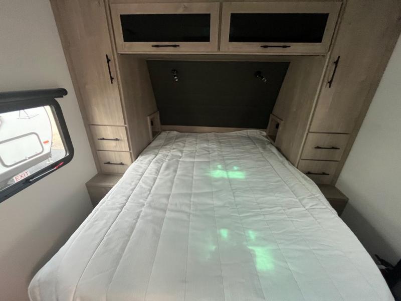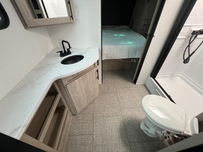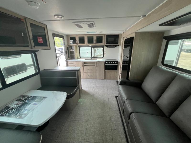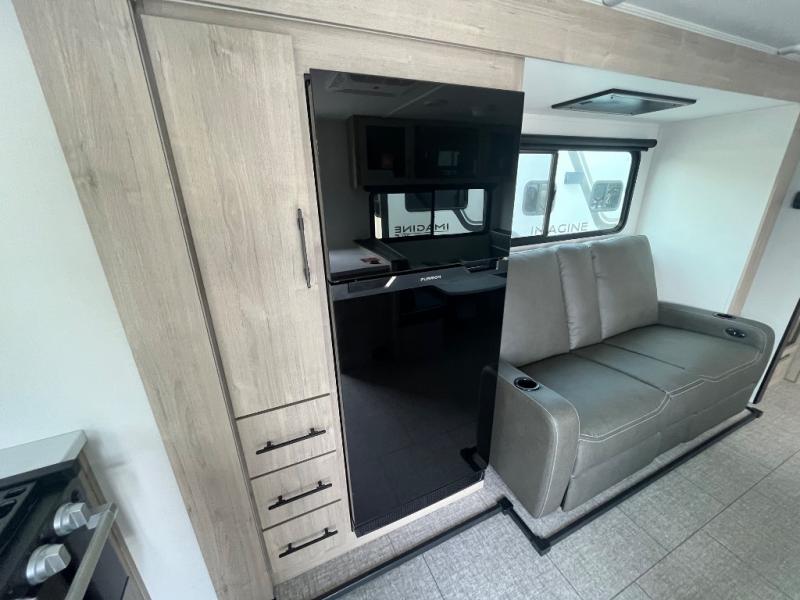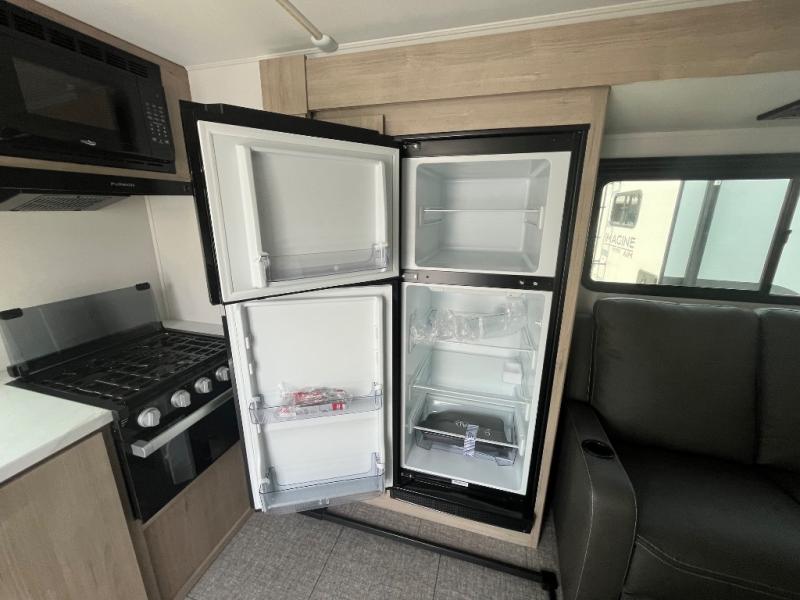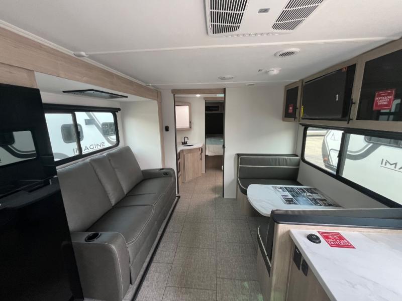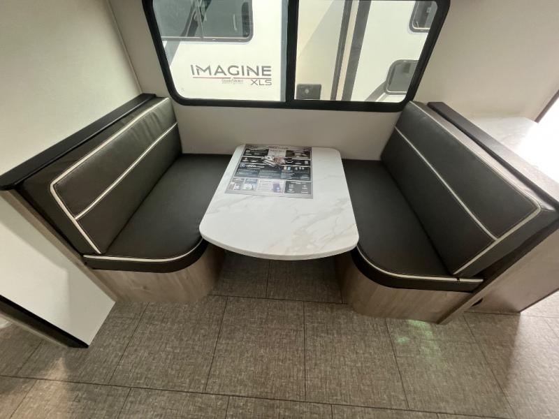 Treat yourself to a weekend of fun in this Imagine XLS travel trailer! Whether it's just you and your spouse, or you've chosen to bring along a group of friends, this trailer will meet the need. The front bedroom can sleep two people on the walk-around queen-size bed. The bedroom is quite functional because it not only contains the second exterior entry door, but it also has a private entrance into the walk-through bathroom since it is located on the other side of the bathroom. The booth dinette is functional too because it can transform from a dining location into a sleeping location, and the theater seating is directly across from the LED TV for easy viewing.