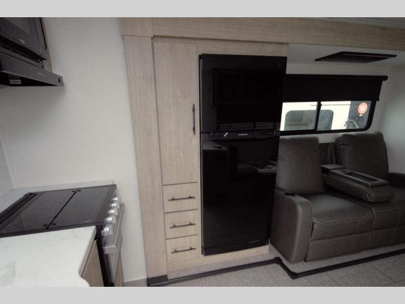 Modern kitchen with 12V 10 cubic foot refrigerator and solid surface countertops