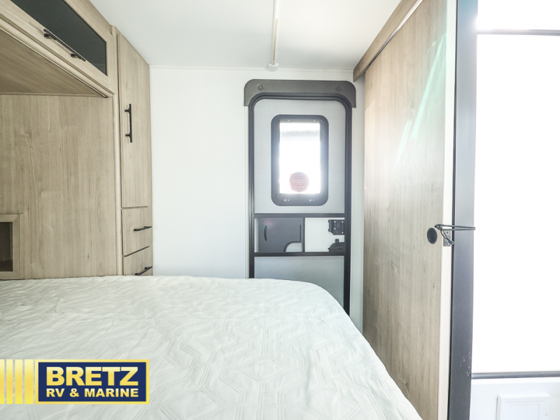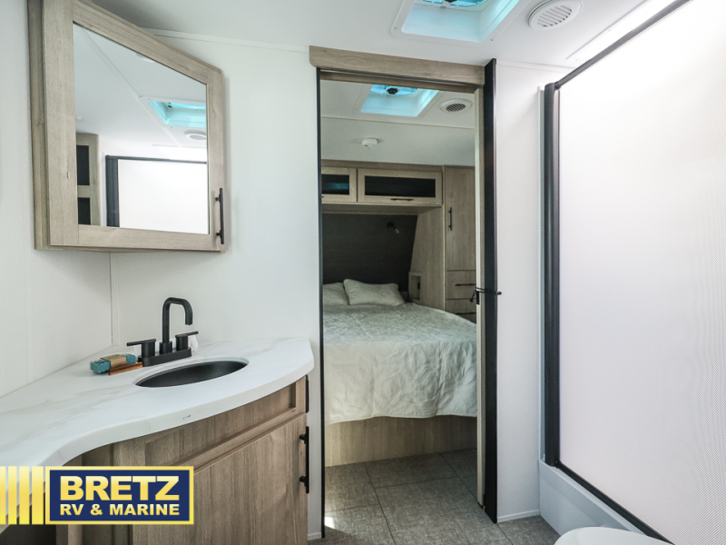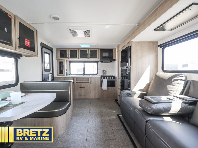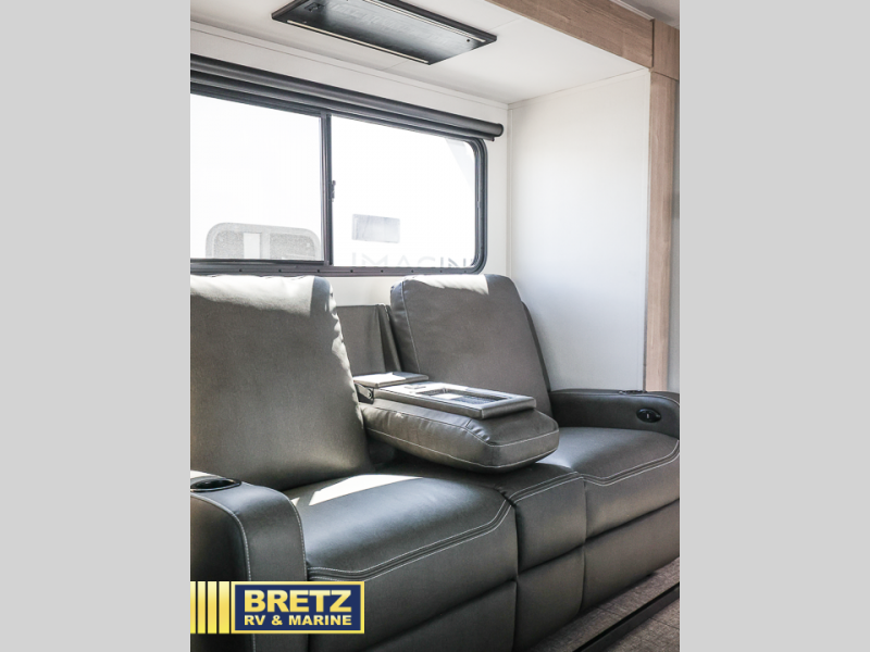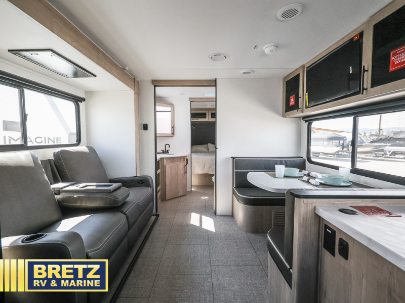 Treat yourself to a weekend of fun in this Imagine XLS travel trailer! Whether it's just you and your spouse, or you've chosen to bring along a group of friends, this trailer will meet the need. The front bedroom can sleep two people on the walk-around queen-size bed. The bedroom is quite functional because it not only contains the second exterior entry door, but it also has a private entrance into the walk-through bathroom since it is located on the other side of the bathroom. The booth dinette is functional too because it can transform from a dining location into a sleeping location, and the theater seating is directly across from the LED TV for easy viewing.