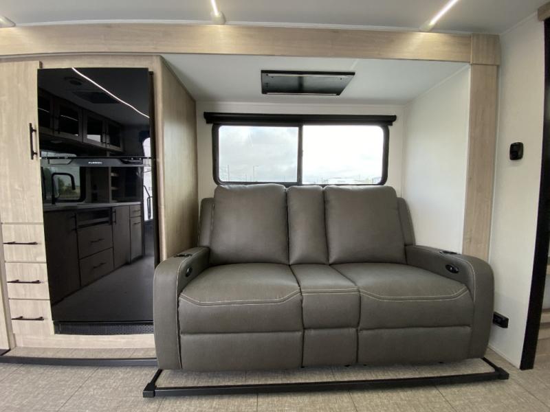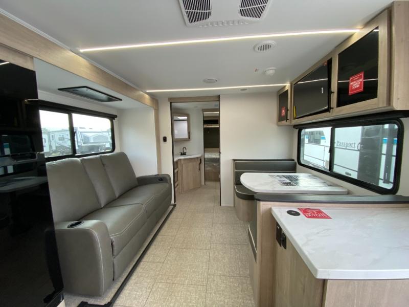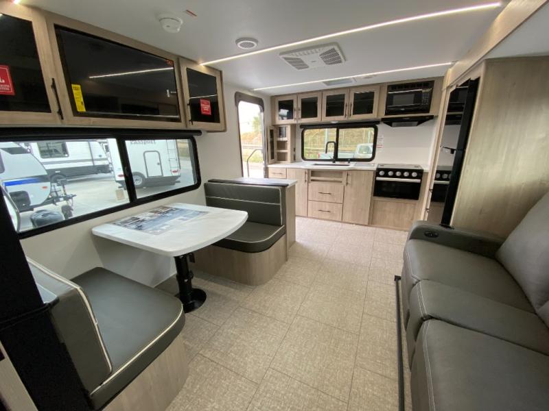 Treat yourself to a weekend of fun in this Imagine XLS travel trailer! Whether it's just you and your spouse, or you've chosen to bring along a group of friends, this trailer will meet the need. The front bedroom can sleep two people on the walk-around queen-size bed. The bedroom is quite functional because it not only contains the second exterior entry door, but it also has a private entrance into the walk-through bathroom since it is located on the other side of the bathroom. The booth dinette is functional too because it can transform from a dining location into a sleeping location, and the theater seating is directly across from the LED TV for easy viewing.