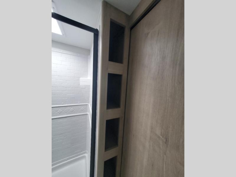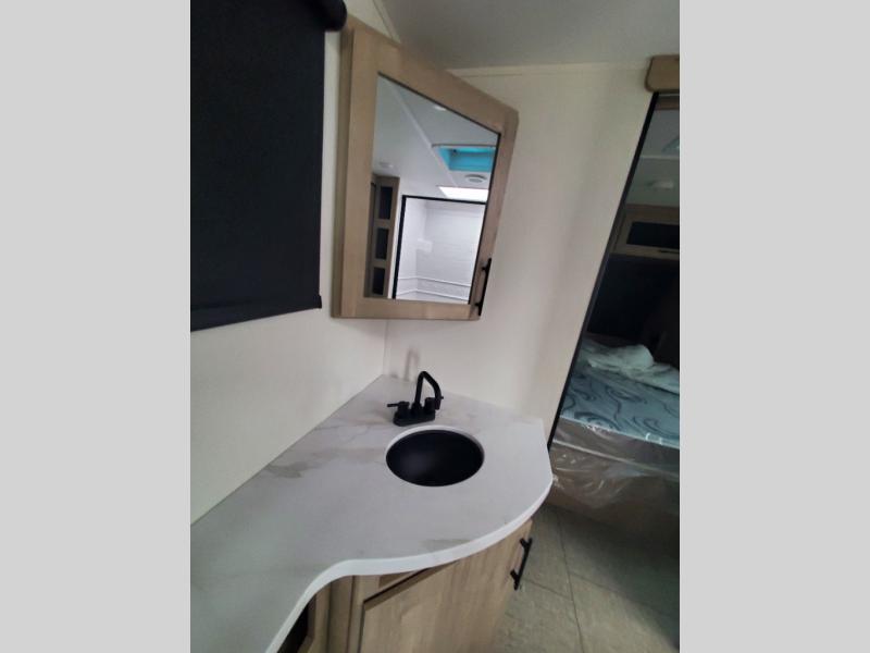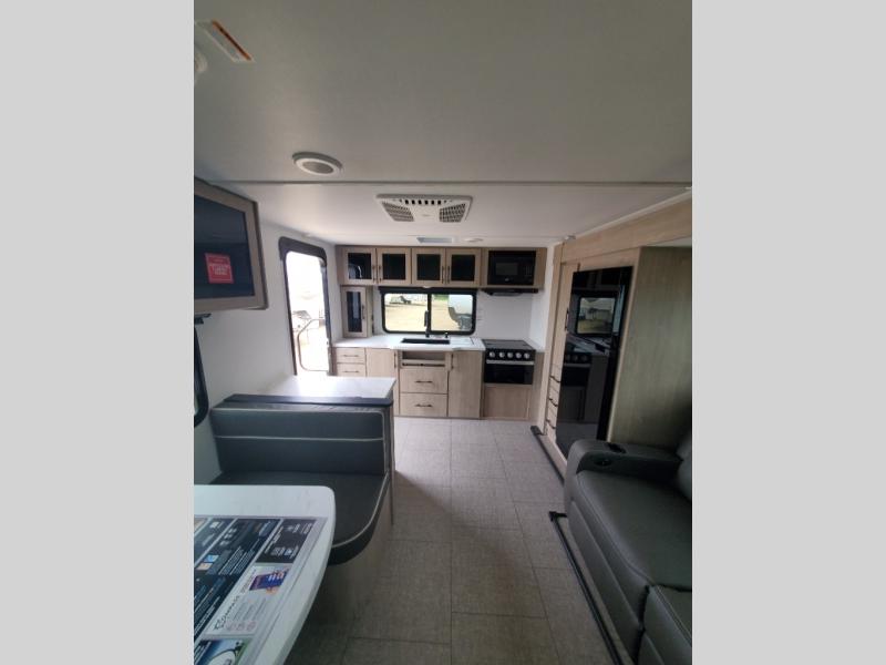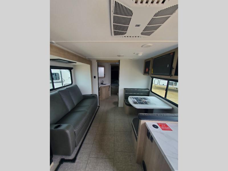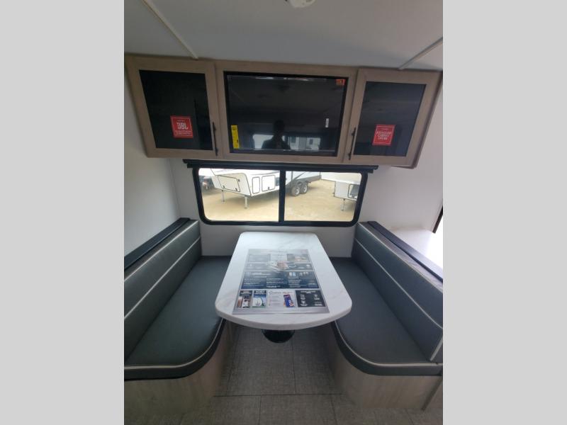 Treat yourself to a weekend of fun in this Imagine XLS travel trailer! Whether it's just you and your spouse, or you've chosen to bring along a group of friends, this trailer will meet the need. The front bedroom can sleep two people on the walk-around queen-size bed. The bedroom is quite functional because it not only contains the second exterior entry door, but it also has a private entrance into the walk-through bathroom since it is located on the other side of the bathroom. The booth dinette is functional too because it can transform from a dining location into a sleeping location, and the theater seating is directly across from the LED TV for easy viewing.