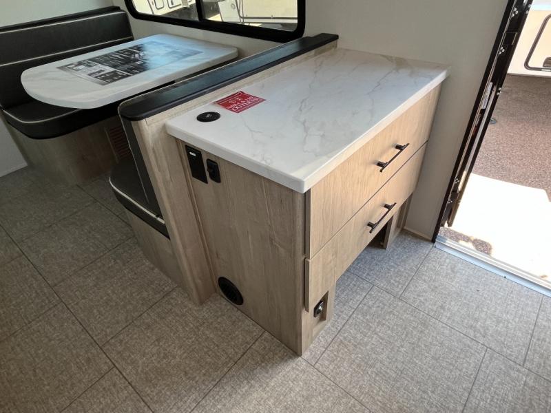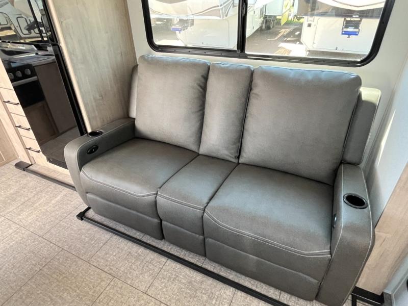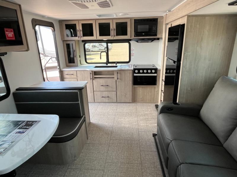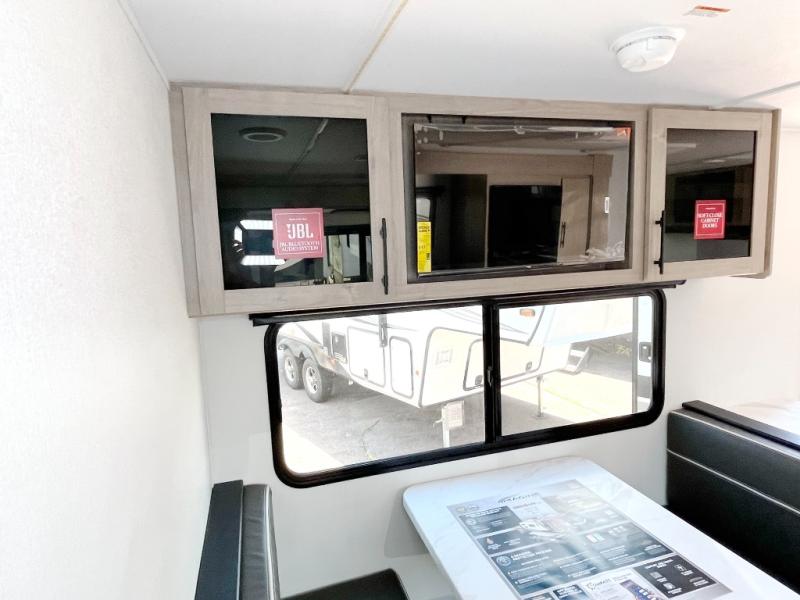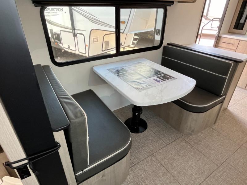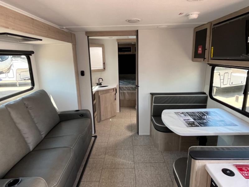 Treat yourself to a weekend of fun in this Imagine XLS travel trailer! Whether it's just you and your spouse, or you've chosen to bring along a group of friends, this trailer will meet the need. The front bedroom can sleep two people on the walk-around queen-size bed. The bedroom is quite functional because it not only contains the second exterior entry door, but it also has a private entrance into the walk-through bathroom since it is located on the other side of the bathroom. The booth dinette is functional too because it can transform from a dining location into a sleeping location, and the theater seating is directly across from the LED TV for easy viewing.