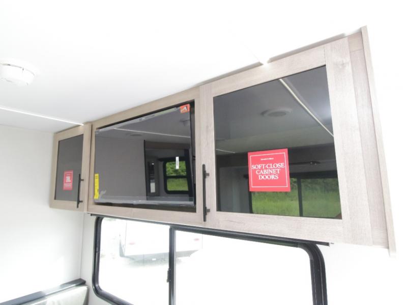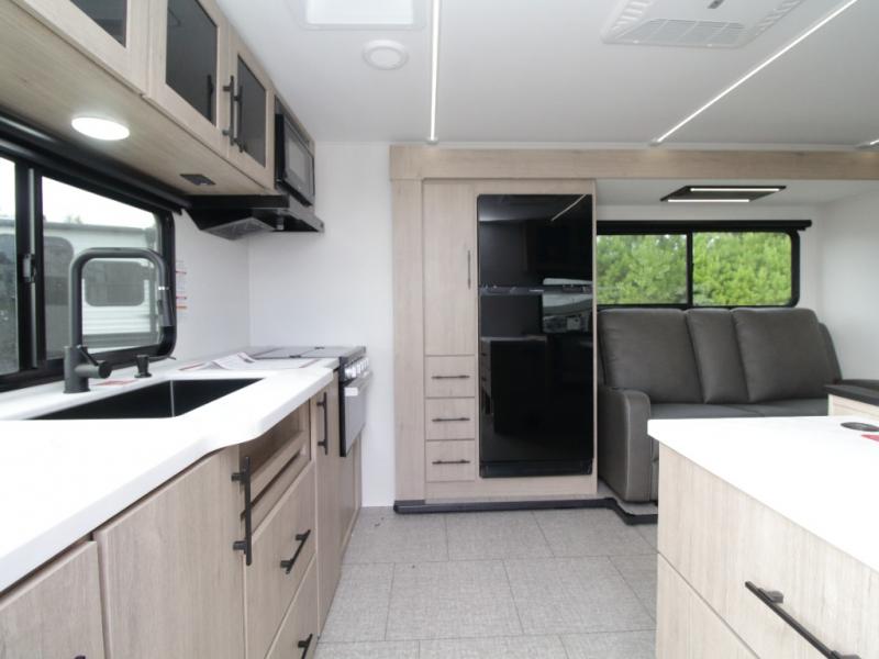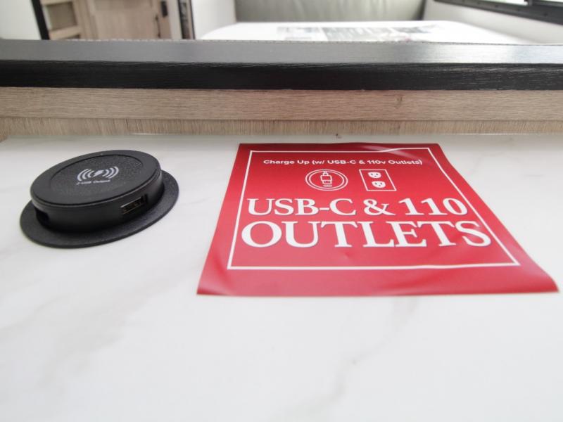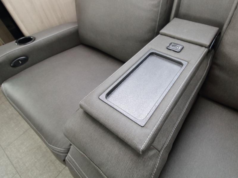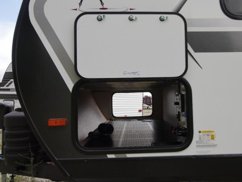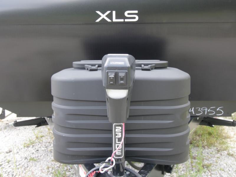 Enjoy outdoor living under the 20' electric awning with LED lighting, and store gear with ease in the pass-through compartment with Tuff-Ply flooring. Additional highlights include a power tongue jack, oversized tank capacities, and a quick-drain freshwater system.