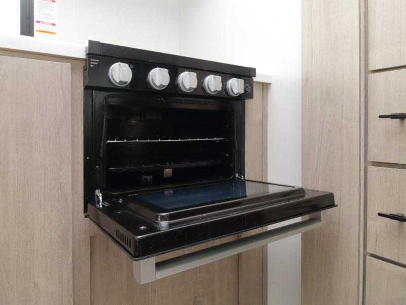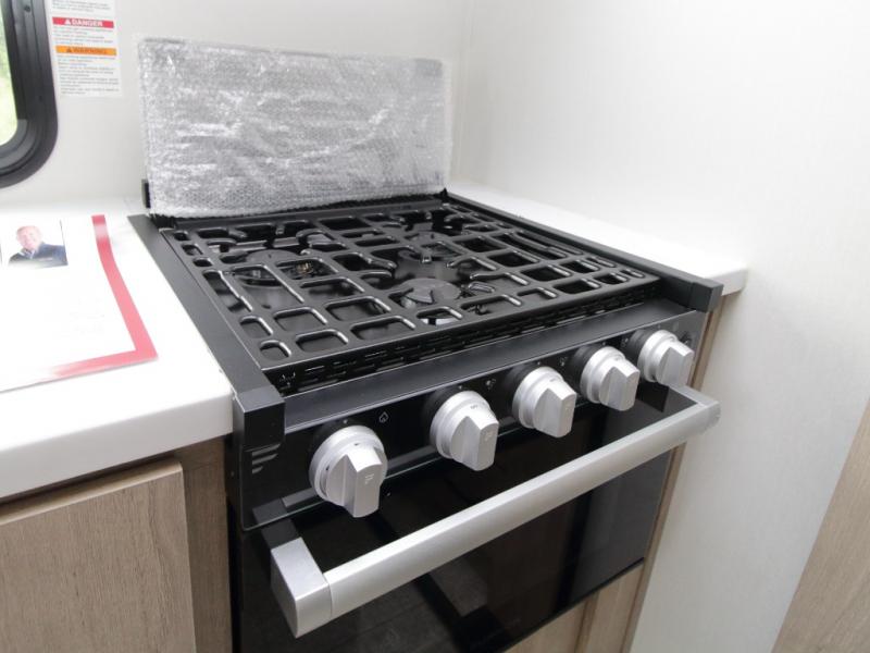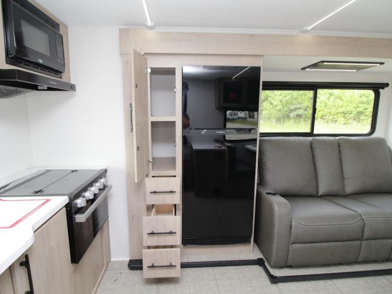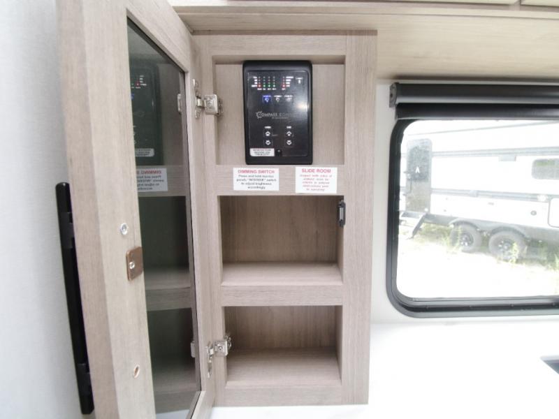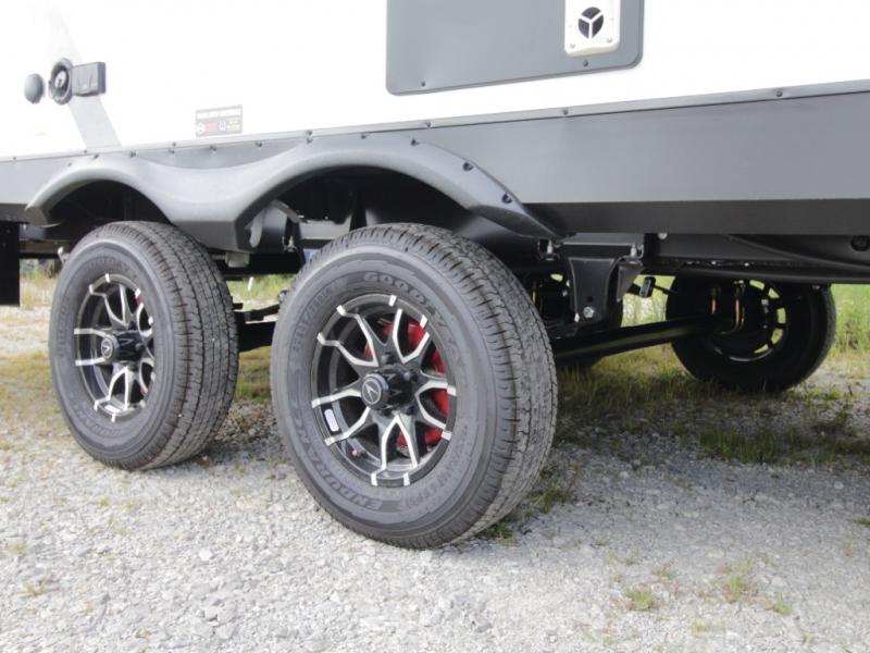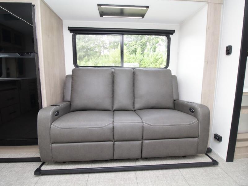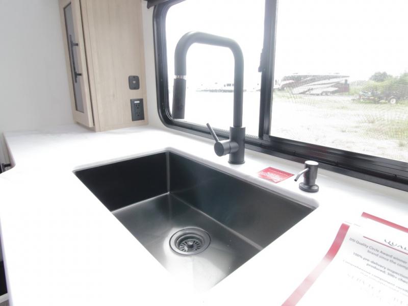 Enjoy outdoor living under the 20' electric awning with LED lighting, and store gear with ease in the pass-through compartment with Tuff-Ply flooring. Additional highlights include a power tongue jack, oversized tank capacities, and a quick-drain freshwater system.