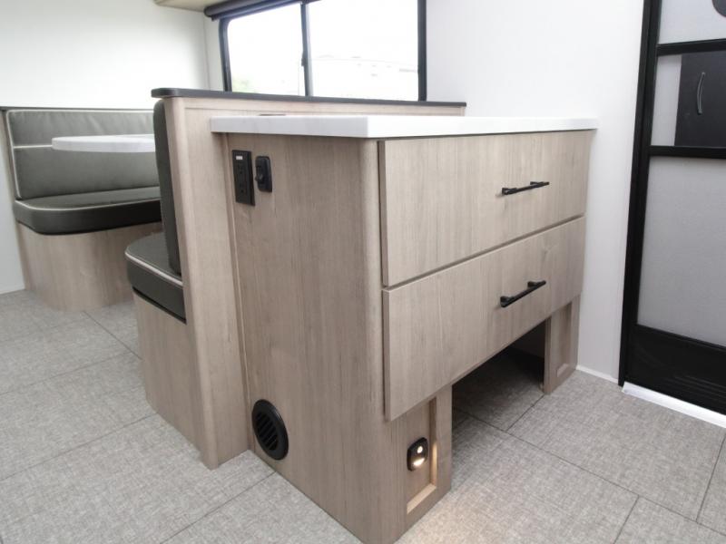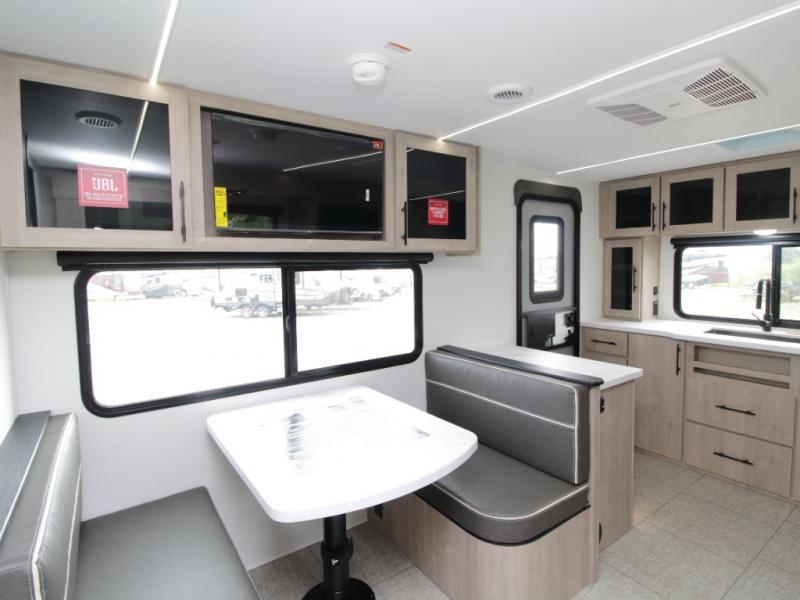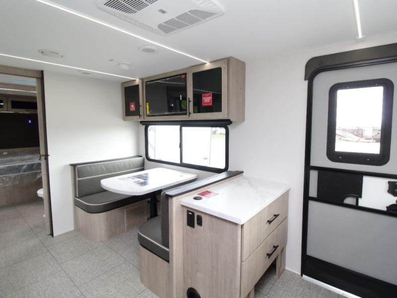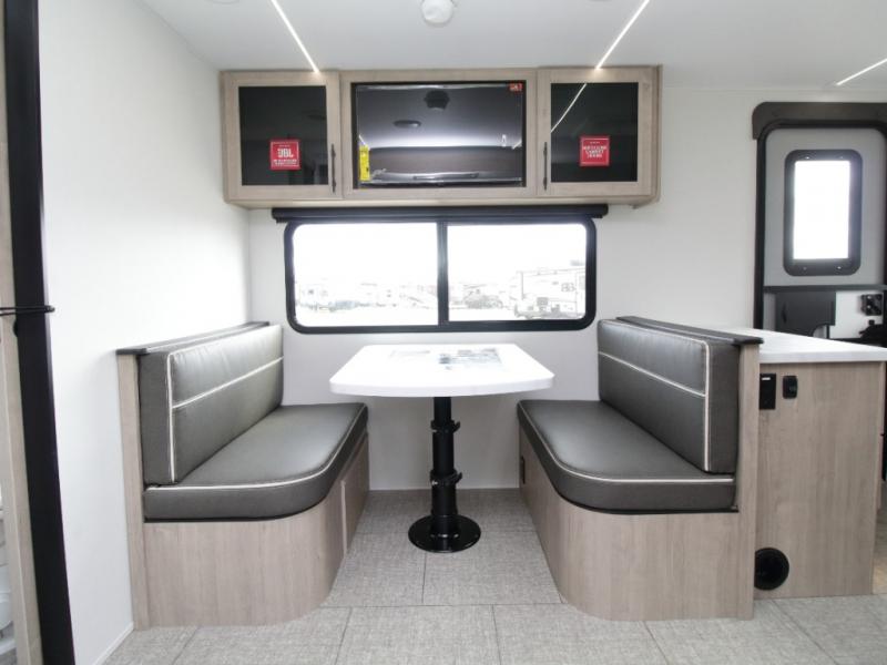 The theater seating sits directly across from the LED TV, offering a great spot to relax and watch a movie or game. The booth dinette provides a space to dine or play games and can also convert into an extra bed for guests.