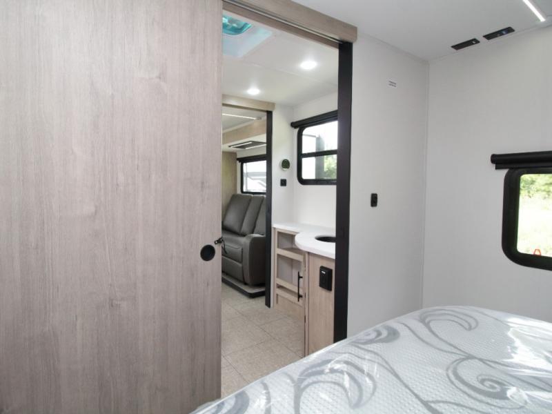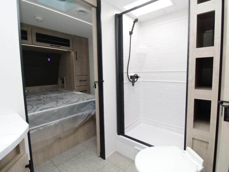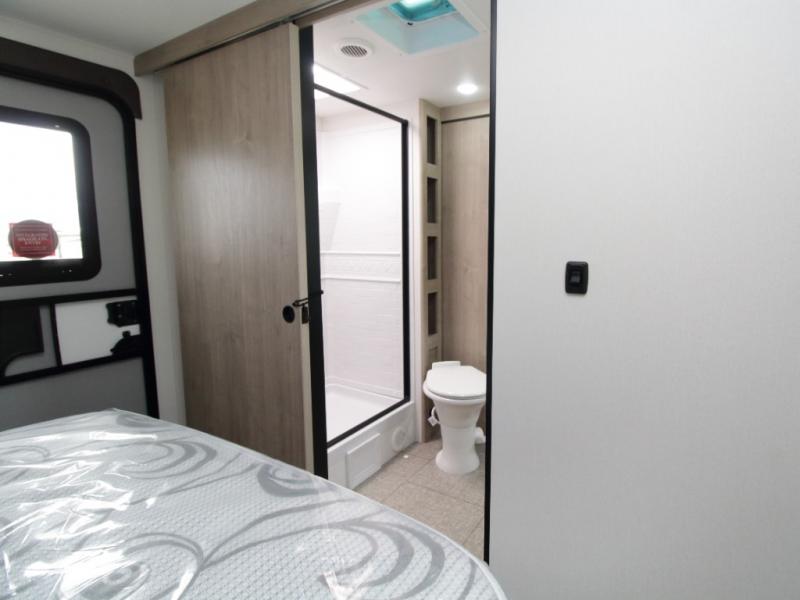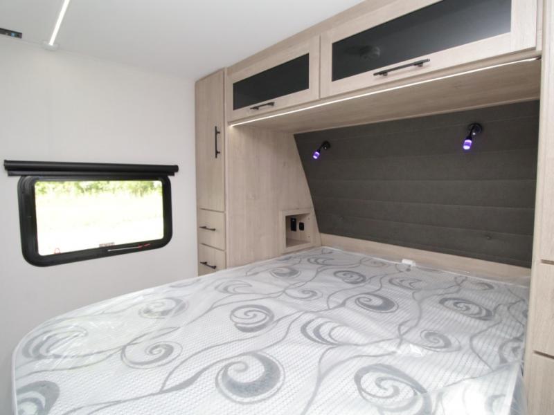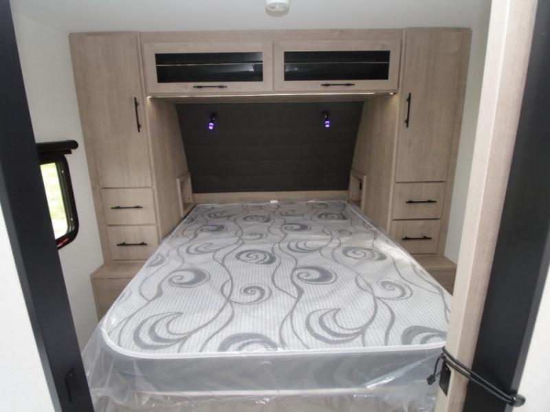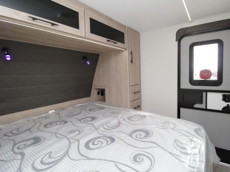 At the front of the unit, you'll find a private bedroom with a walk-around queen-size bed, dual wardrobes, and overhead storage. This room also features its own exterior entry door and private access to the walk-through bathroom, creating a functional and private layout.