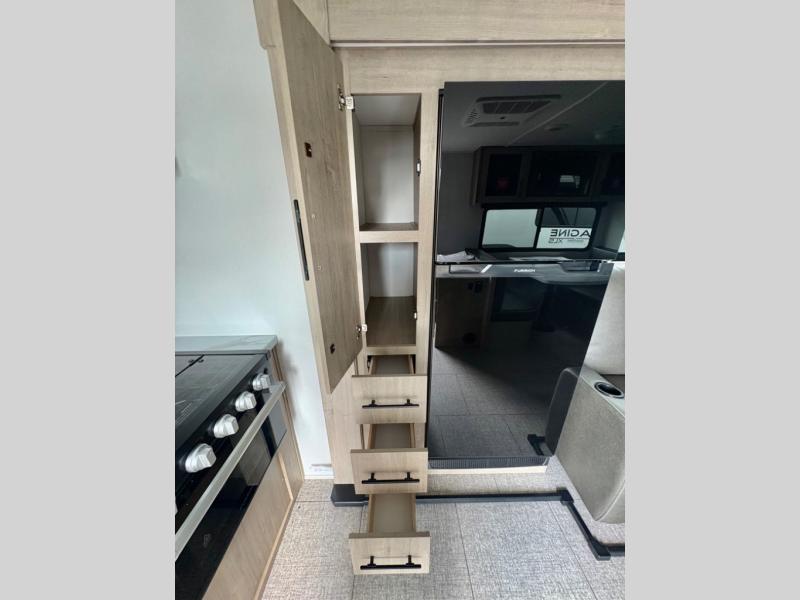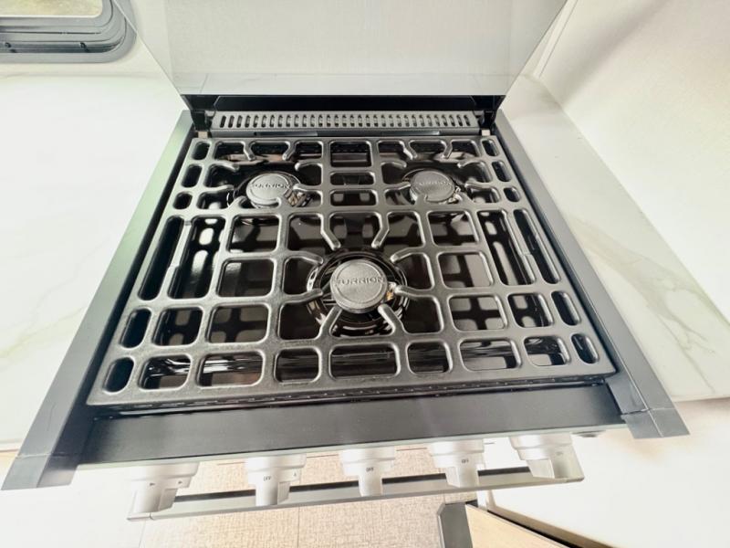 Fully Equipped Kitchen – Enjoy modern conveniences with a three-burner stove, oven, microwave, refrigerator, and deep-basin sink. Ample counter space and cabinetry make cooking easy, whether preparing a quick breakfast or a full dinner on the road.