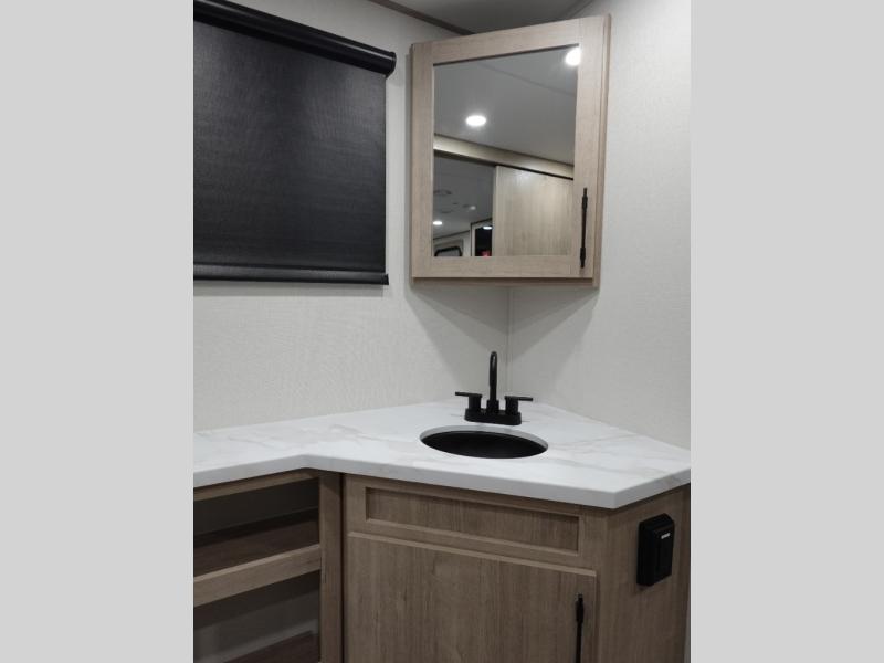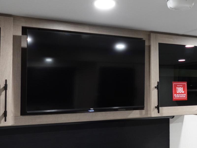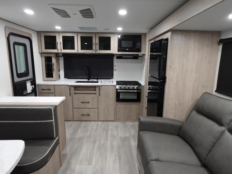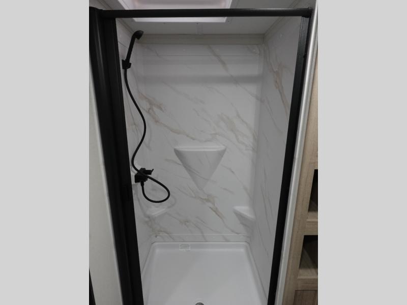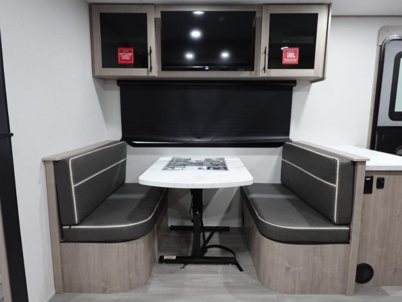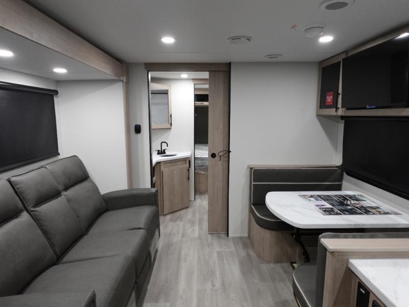 Treat yourself to a weekend of fun in this Imagine XLS travel trailer! Whether it's just you and your spouse, or you've chosen to bring along a group of friends, this trailer will meet the need. The front bedroom can sleep two people on the walk-around queen-size bed. The bedroom is quite functional because it not only contains the second exterior entry door, but it also has a private entrance into the walk-through bathroom since it is located on the other side of the bathroom. The booth dinette is functional too because it can transform from a dining location into a sleeping location, and the theater seating is directly across from the LED TV for easy viewing.