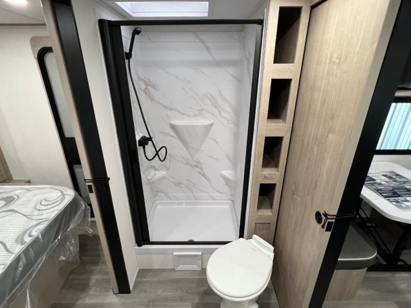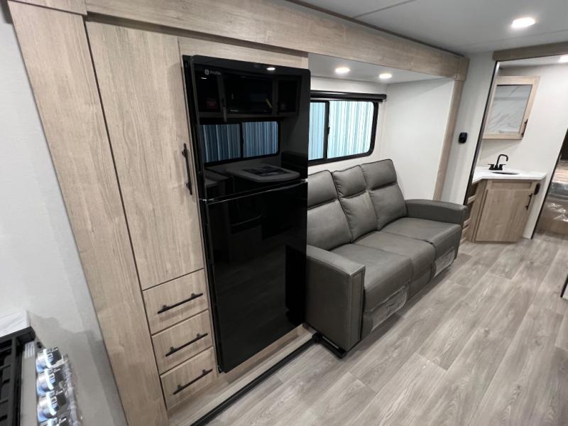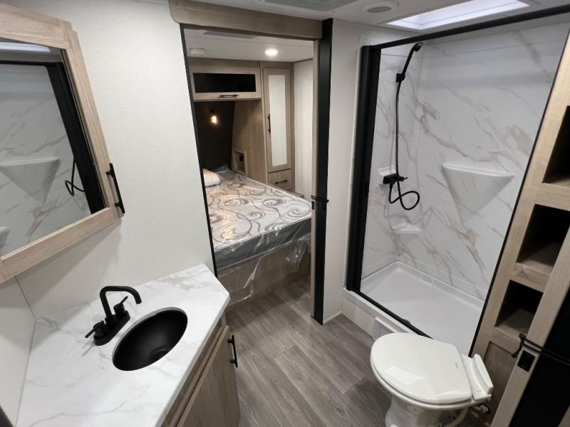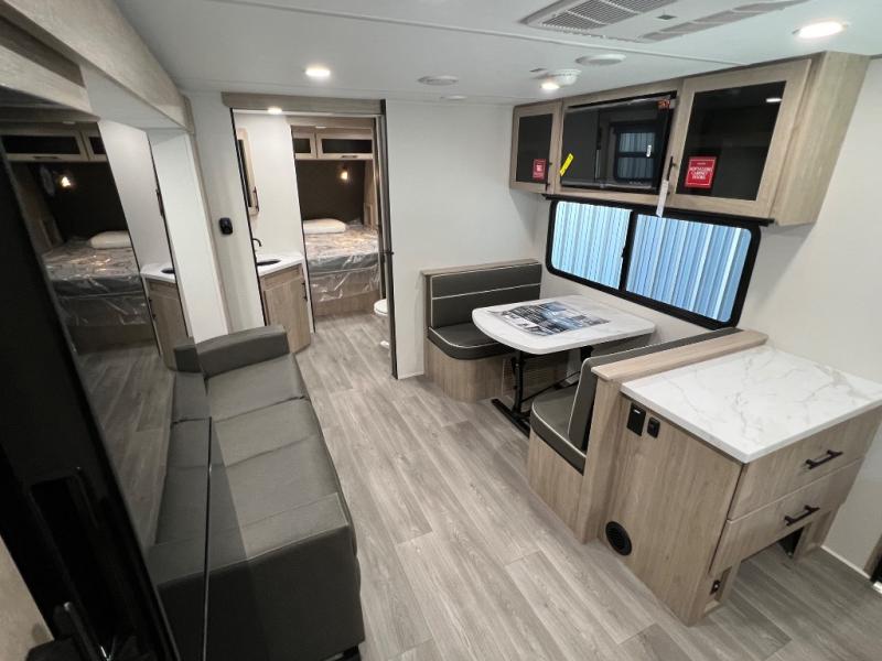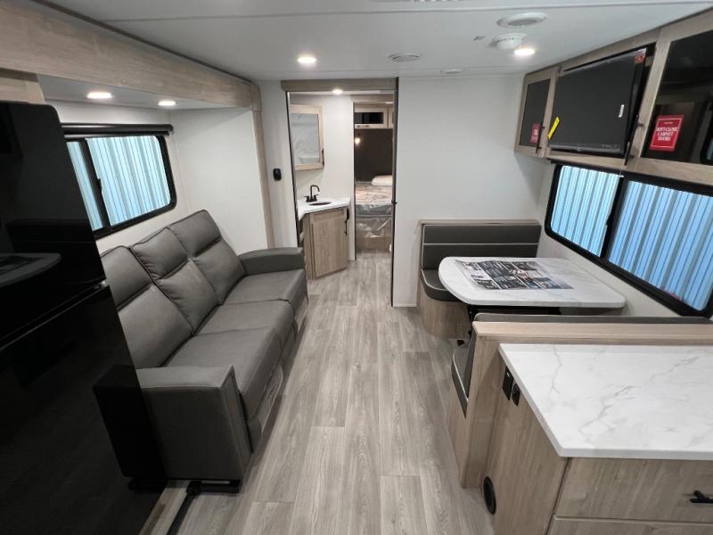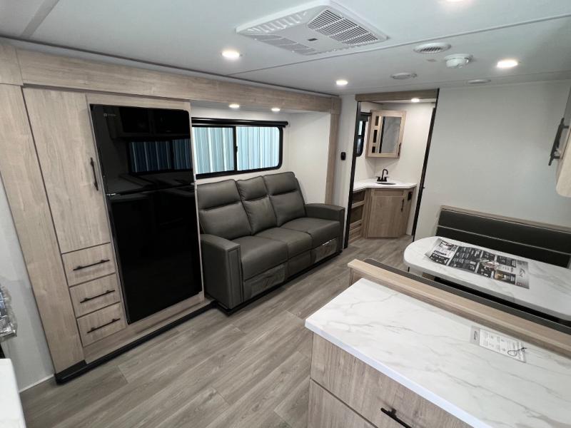 Treat yourself to a weekend of fun in this Imagine XLS travel trailer! Whether it's just you and your spouse, or you've chosen to bring along a group of friends, this trailer will meet the need. The front bedroom can sleep two people on the walk-around queen-size bed. The bedroom is quite functional because it not only contains the second exterior entry door, but it also has a private entrance into the walk-through bathroom since it is located on the other side of the bathroom. The booth dinette is functional too because it can transform from a dining location into a sleeping location, and the theater seating is directly across from the LED TV for easy viewing.