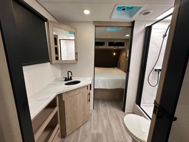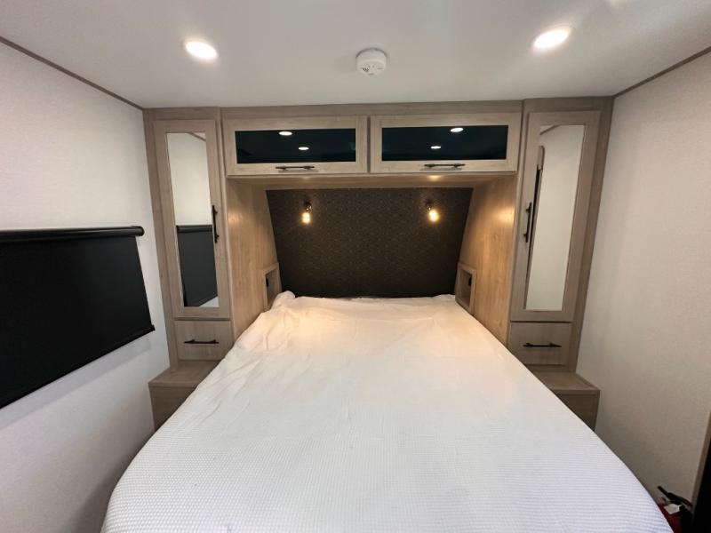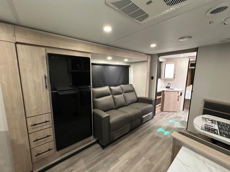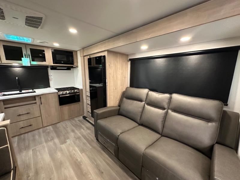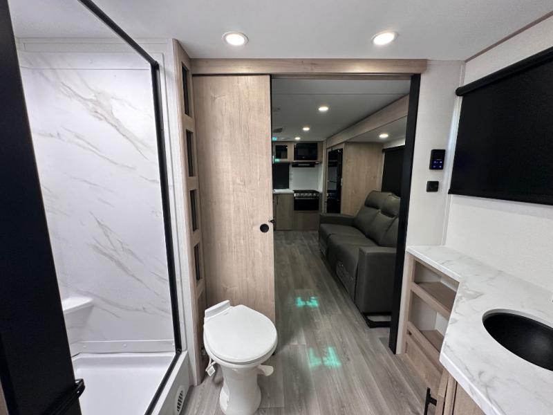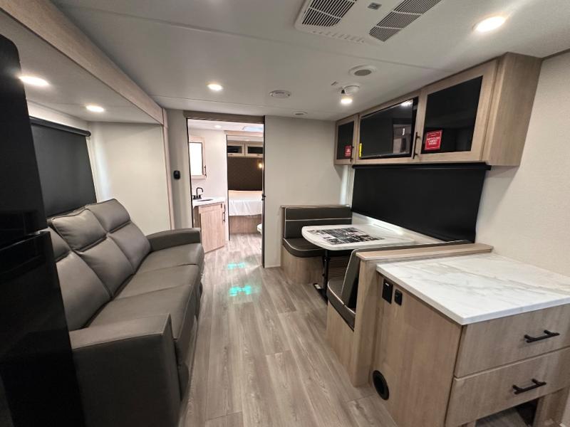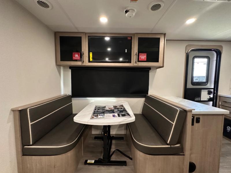 Treat yourself to a weekend of fun in this Imagine XLS travel trailer! Whether it's just you and your spouse, or you've chosen to bring along a group of friends, this trailer will meet the need. The front bedroom can sleep two people on the walk-around queen-size bed. The bedroom is quite functional because it not only contains the second exterior entry door, but it also has a private entrance into the walk-through bathroom since it is located on the other side of the bathroom. The booth dinette is functional too because it can transform from a dining location into a sleeping location, and the theater seating is directly across from the LED TV for easy viewing.