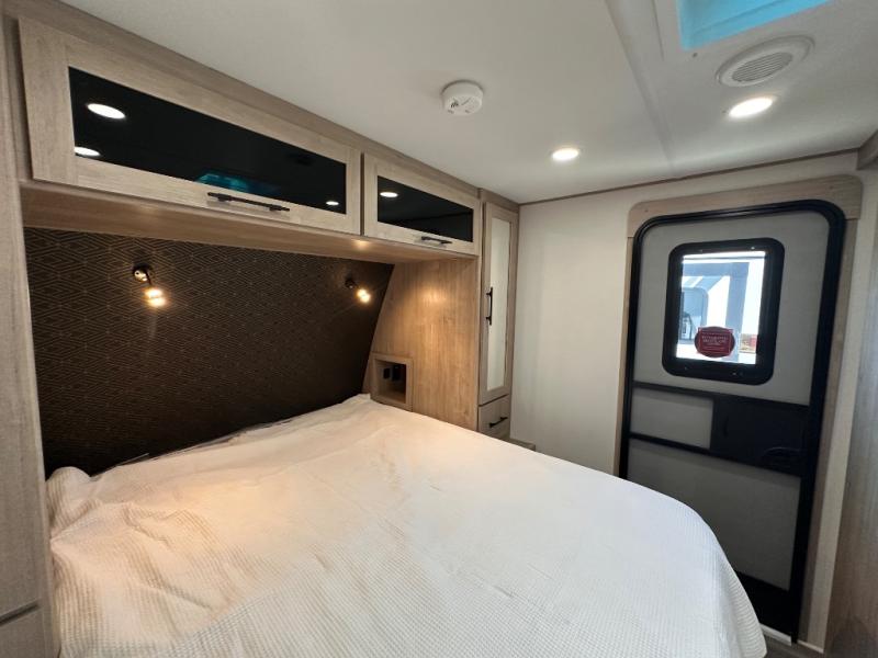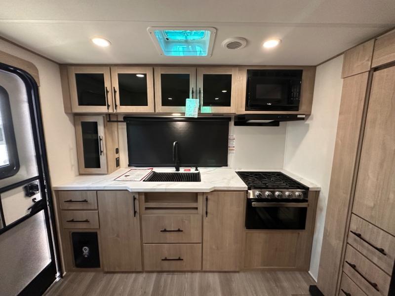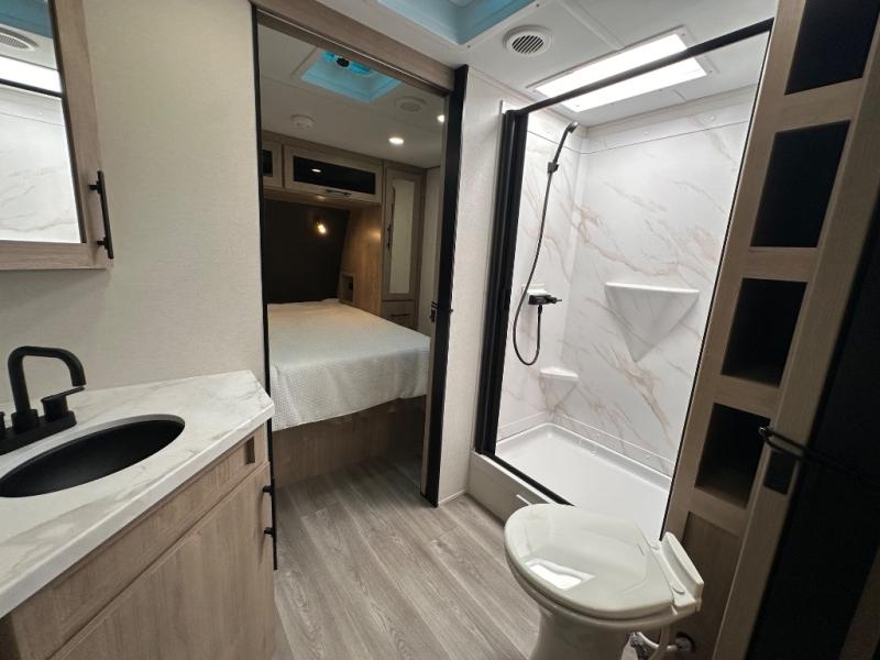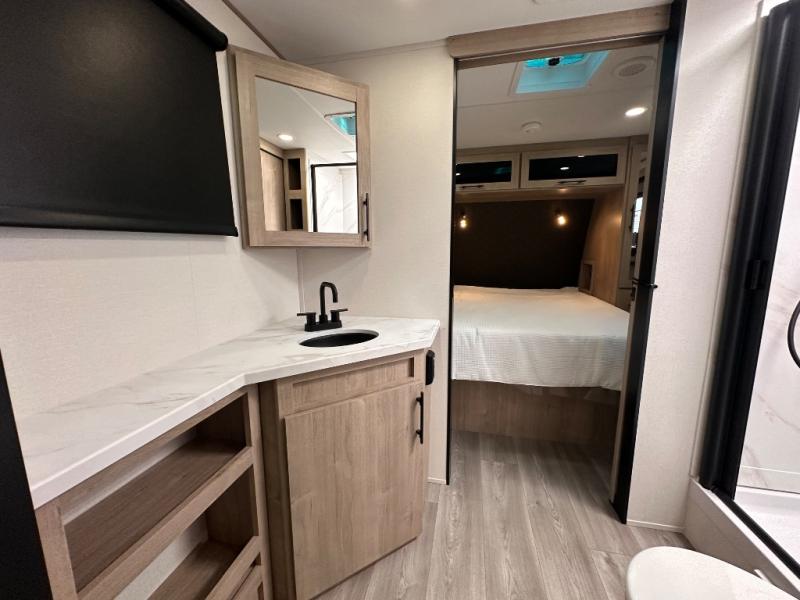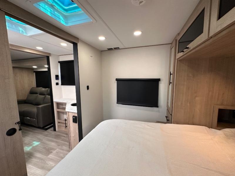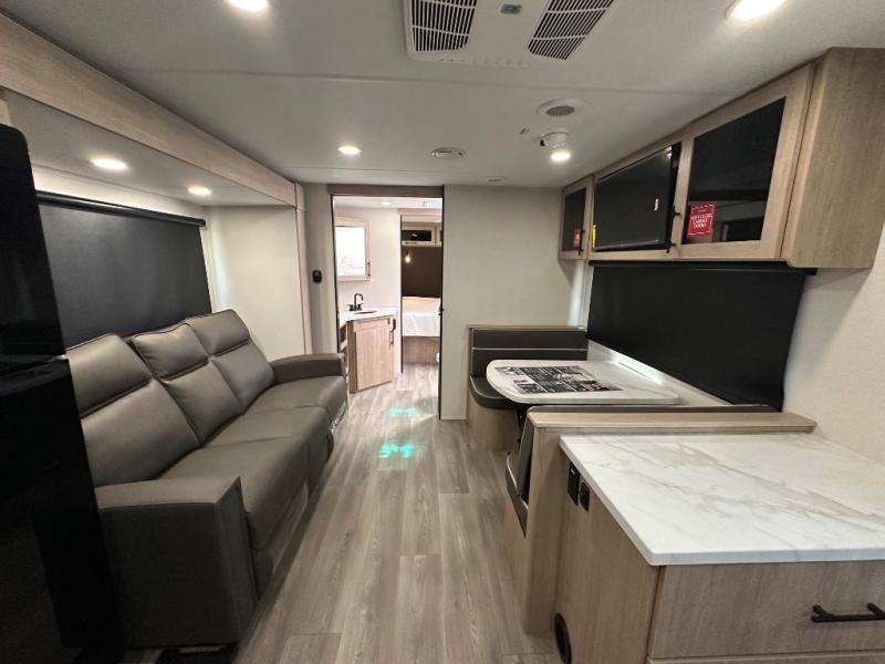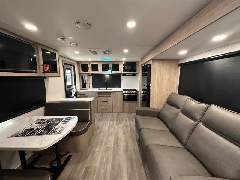Treat yourself to a weekend of fun in this Imagine XLS travel trailer! Whether it's just you and your spouse, or you've chosen to bring along a group of friends, this trailer will meet the need. The front bedroom can sleep two people on the walk-around queen-size bed. The bedroom is quite functional because it not only contains the second exterior entry door, but it also has a private entrance into the walk-through bathroom since it is located on the other side of the bathroom. The booth dinette is functional too because it can transform from a dining location into a sleeping location, and the theater seating is directly across from the LED TV for easy viewing.