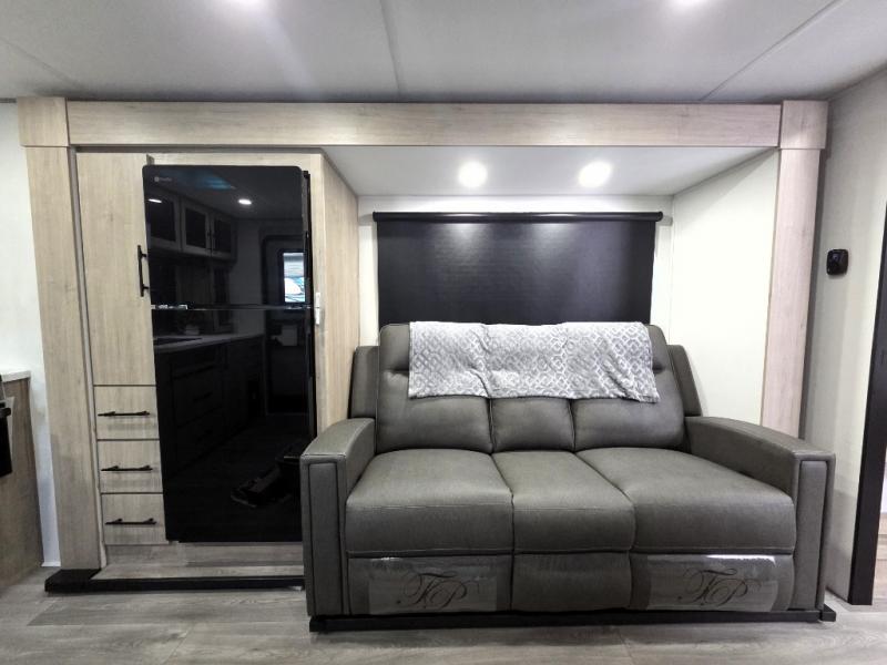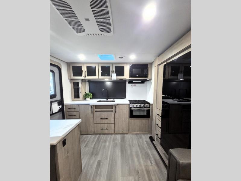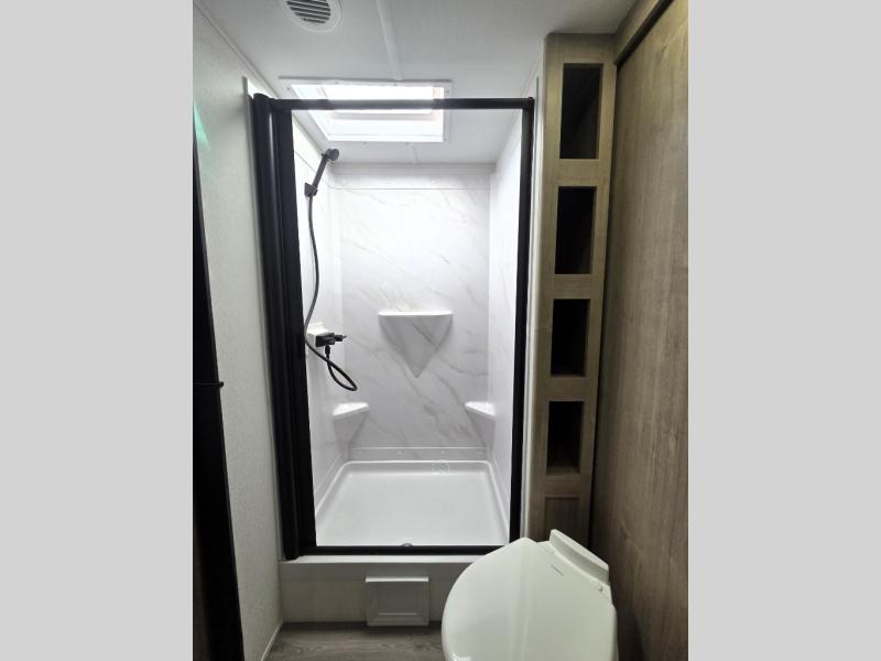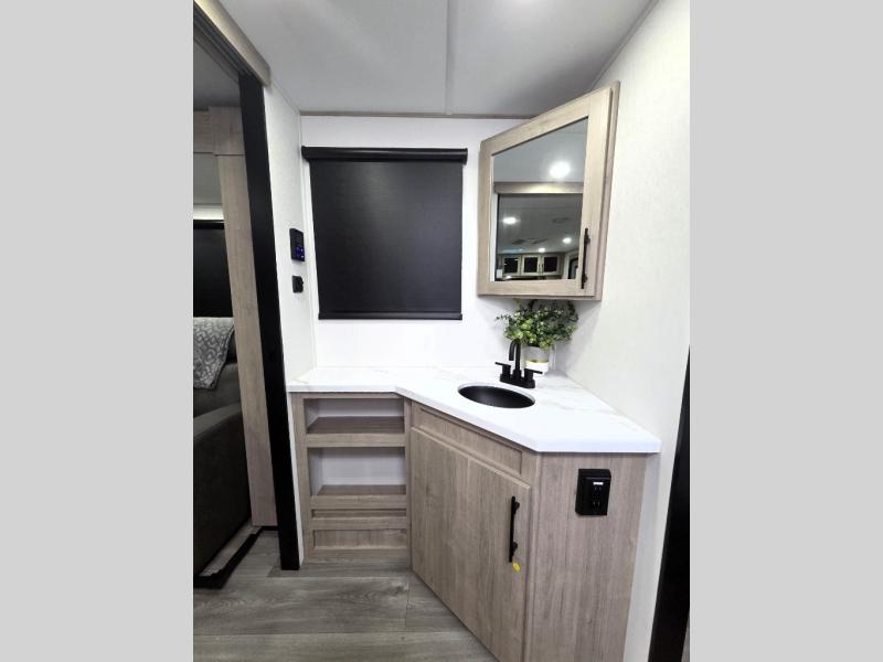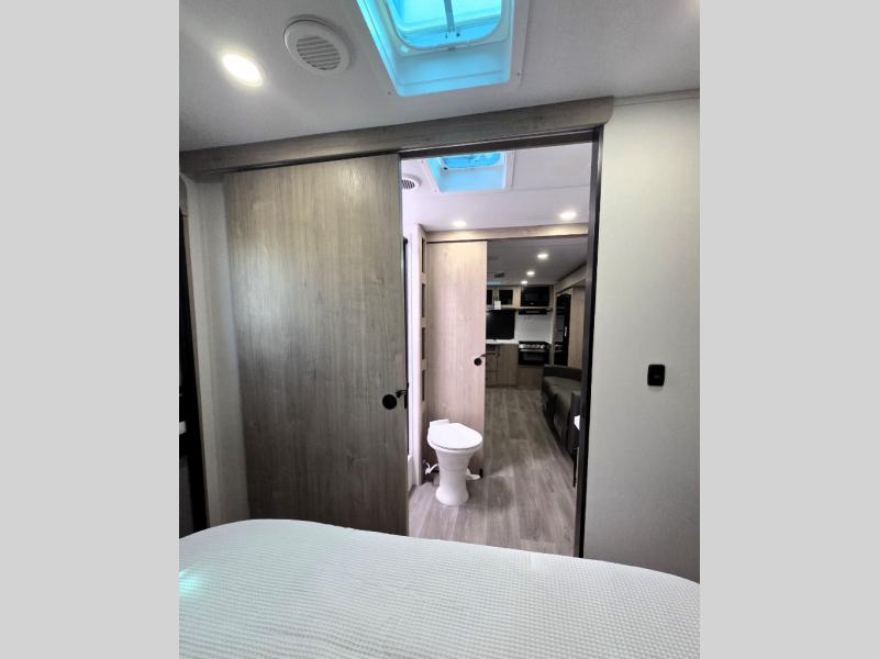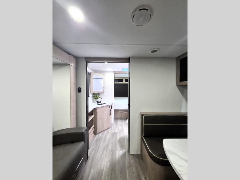 Treat yourself to a weekend of fun in this Imagine XLS travel trailer! Whether it's just you and your spouse, or you've chosen to bring along a group of friends, this trailer will meet the need. The front bedroom can sleep two people on the walk-around queen-size bed. The bedroom is quite functional because it not only contains the second exterior entry door, but it also has a private entrance into the walk-through bathroom since it is located on the other side of the bathroom. The booth dinette is functional too because it can transform from a dining location into a sleeping location, and the theater seating is directly across from the LED TV for easy viewing.