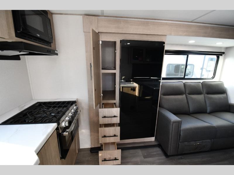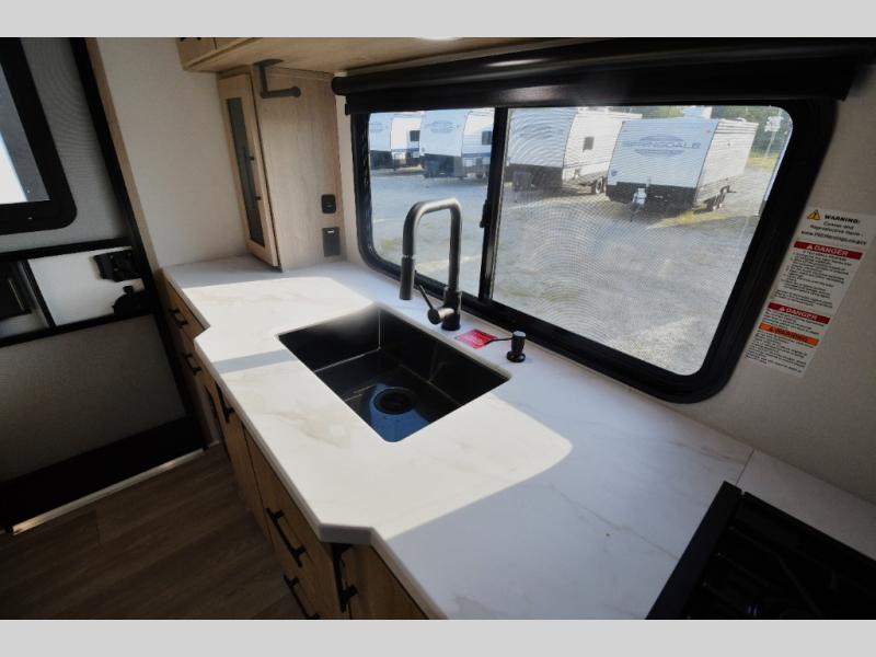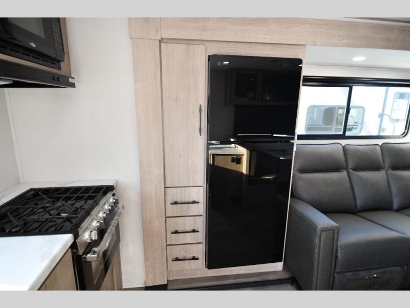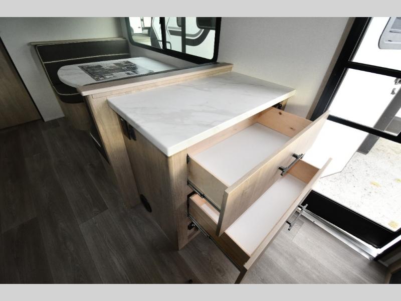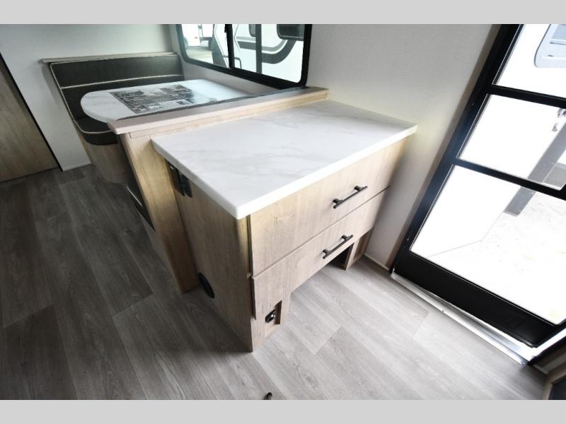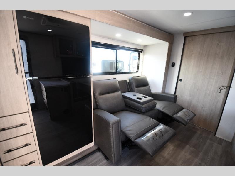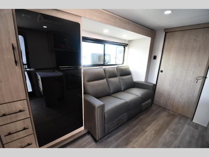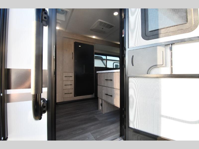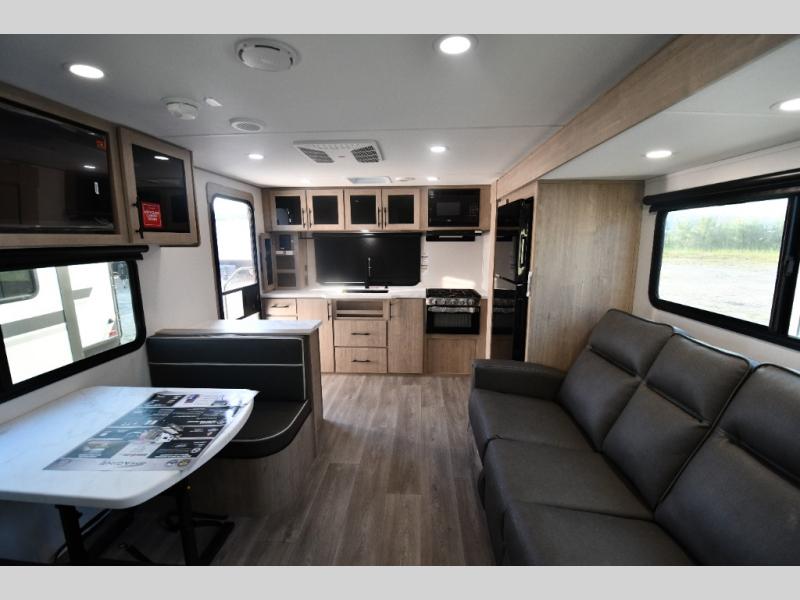 This model includes premium packages and upgrades designed to make every trip effortless, from the Construction & Convenience Package and Lifestyle Package to the Solar Prep, Elite Kitchen, and Power & Entertainment Packages. Theater seating replaces the sleeper sofa for maximum relaxation, and the 4-Season Protection Package ensures comfortable camping in any climate. Added peace of mind comes from SafeRide RV roadside assistance.
