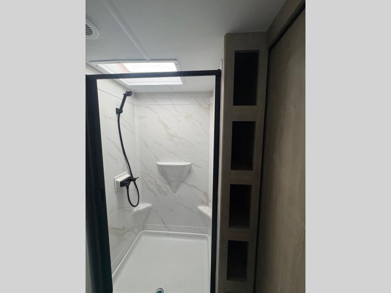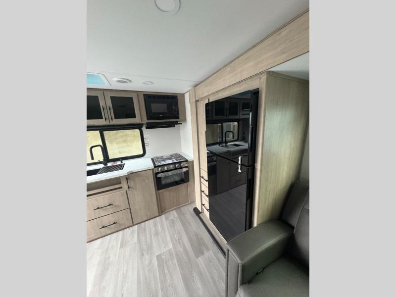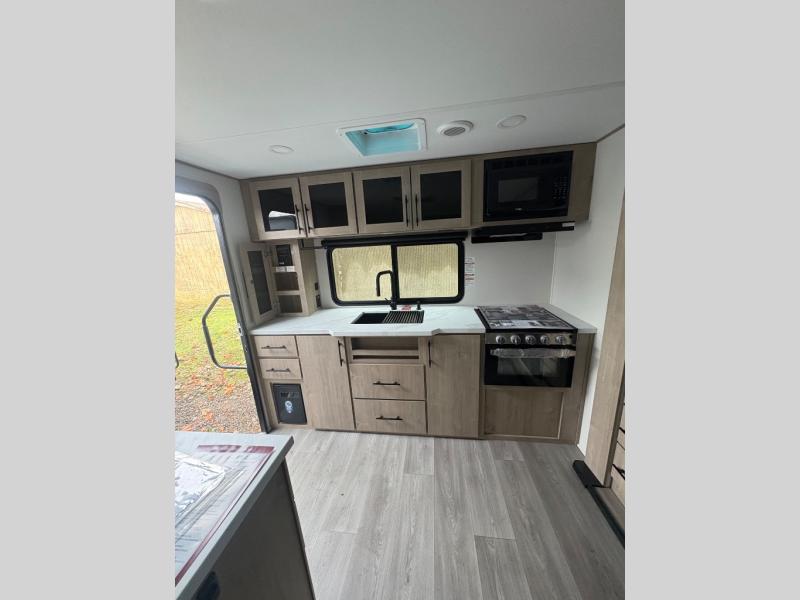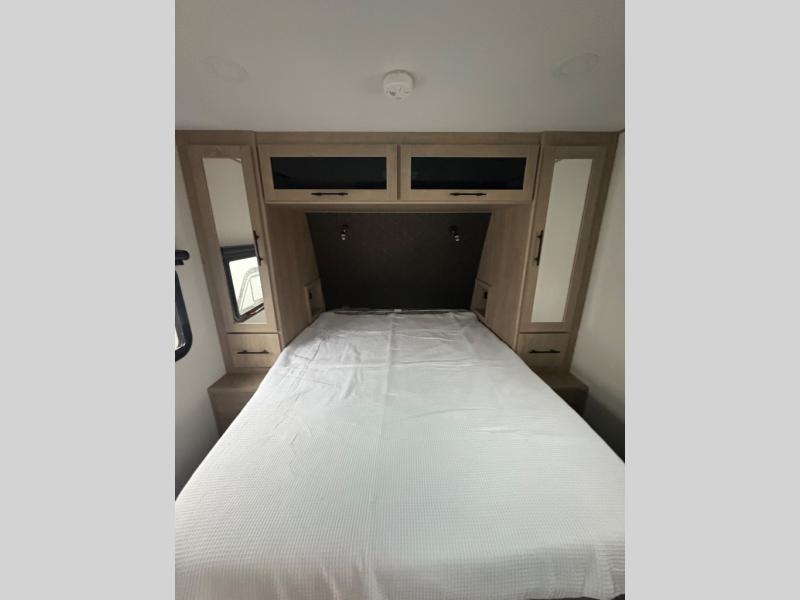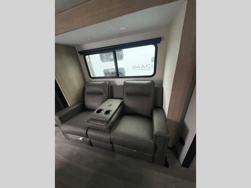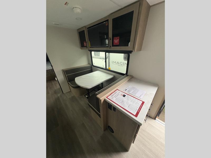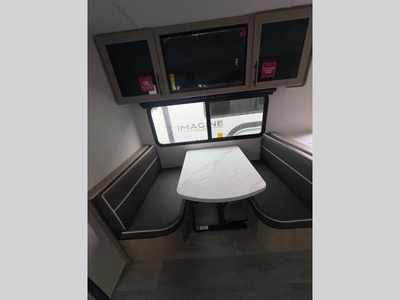 Treat yourself to a weekend of fun in this Imagine XLS travel trailer! Whether it's just you and your spouse, or you've chosen to bring along a group of friends, this trailer will meet the need. The front bedroom can sleep two people on the walk-around queen-size bed. The bedroom is quite functional because it not only contains the second exterior entry door, but it also has a private entrance into the walk-through bathroom since it is located on the other side of the bathroom. The booth dinette is functional too because it can transform from a dining location into a sleeping location, and the theater seating is directly across from the LED TV for easy viewing.