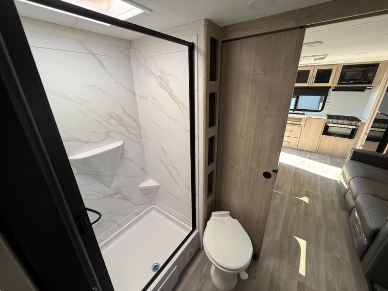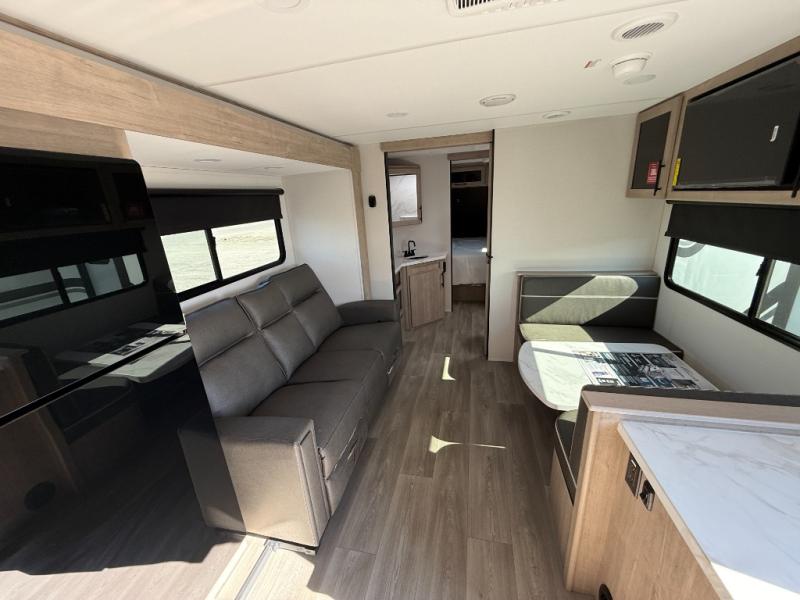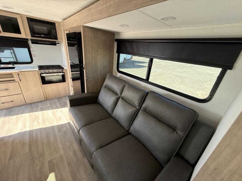 Treat yourself to a weekend of fun in this Imagine XLS travel trailer! Whether it's just you and your spouse, or you've chosen to bring along a group of friends, this trailer will meet the need. The front bedroom can sleep two people on the walk-around queen-size bed. The bedroom is quite functional because it not only contains the second exterior entry door, but it also has a private entrance into the walk-through bathroom since it is located on the other side of the bathroom. The booth dinette is functional too because it can transform from a dining location into a sleeping location, and the theater seating is directly across from the LED TV for easy viewing.