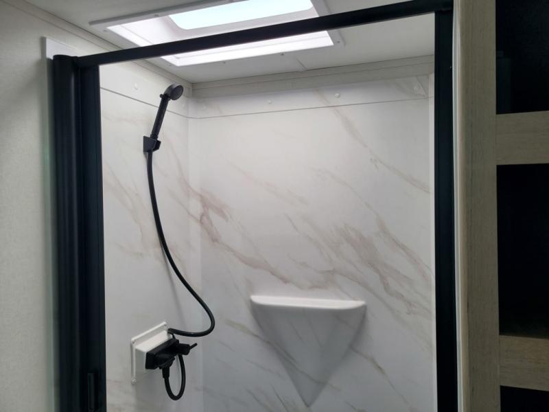 Treat yourself to a weekend of fun in this Imagine XLS travel trailer! Whether it's just you and your spouse, or you've chosen to bring along a group of friends, this trailer will meet the need. The front bedroom can sleep two people on the walk-around queen-size bed. The bedroom is quite functional because it not only contains the second exterior entry door, but it also has a private entrance into the walk-through bathroom since it is located on the other side of the bathroom. The booth dinette is functional too because it can transform from a dining location into a sleeping location, and the theater seating is directly across from the LED TV for easy viewing.
