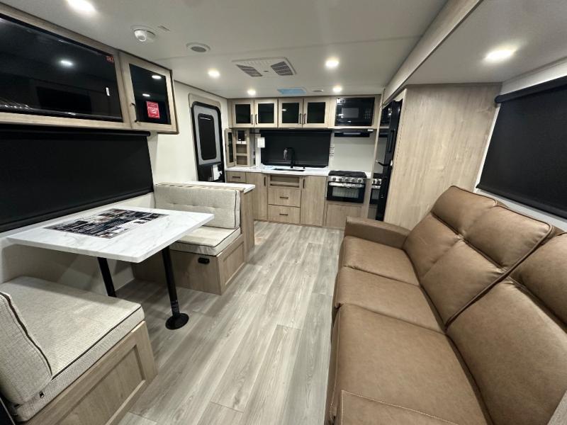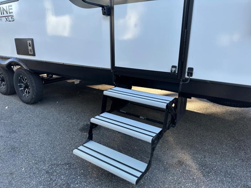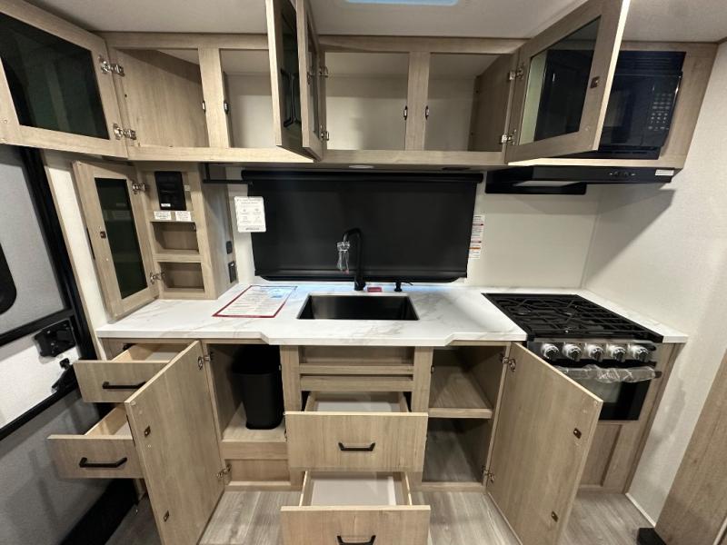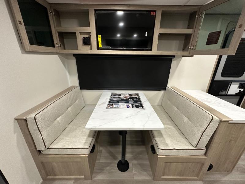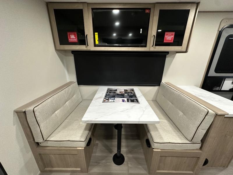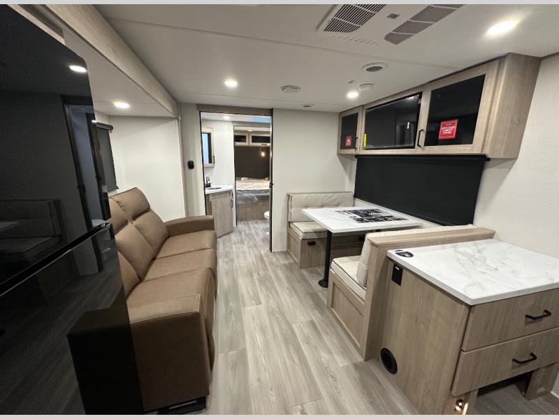 Treat yourself to a weekend of fun in this Imagine XLS travel trailer! Whether it's just you and your spouse, or you've chosen to bring along a group of friends, this trailer will meet your needs. The front bedroom can sleep two people on the walk-around queen-size bed. The bedroom is quite functional because it not only contains the second exterior entry door, but it also has a private entrance into the walk-through bathroom since it is located on the other side of the bathroom. The booth dinette is functional too because it can transform from a dining location into a sleeping location, and the theater seating is directly across from the LED TV for easy viewing. The rear kitchen is fit for the chef on the trip, it features residential countertops, a stainless-steel sink and a 3-burner range with oven for you to cook your meals in comfort.