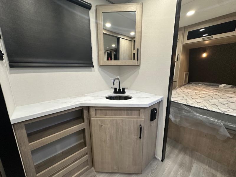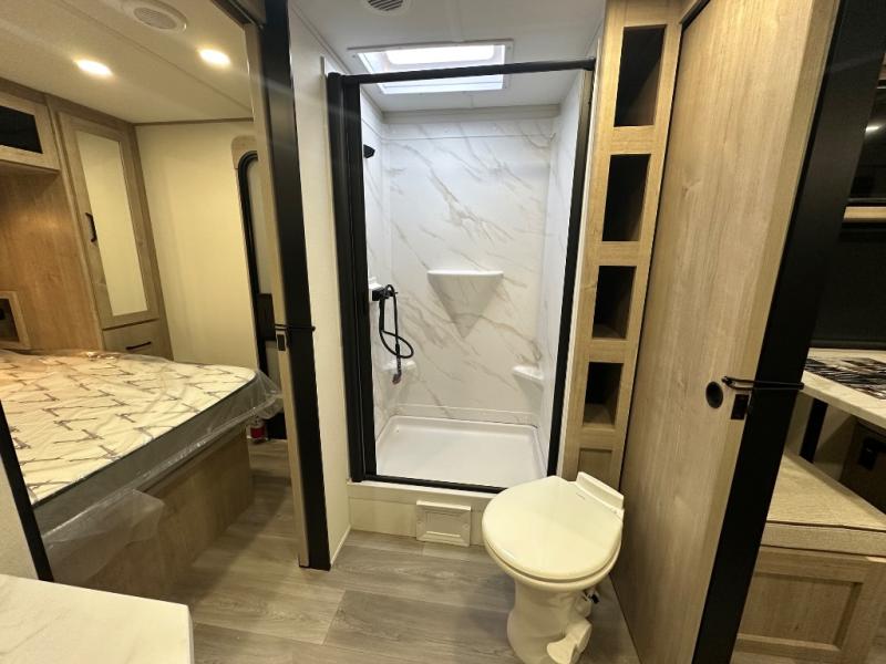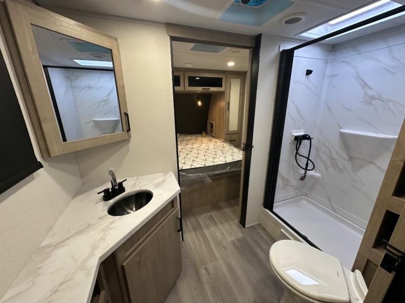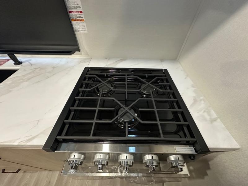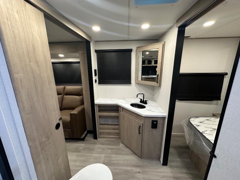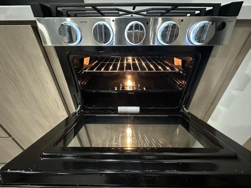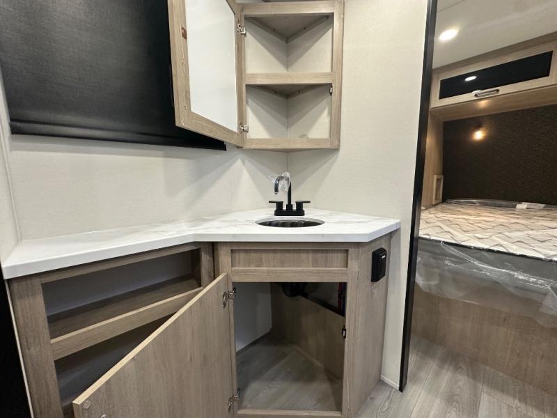 Treat yourself to a weekend of fun in this Imagine XLS travel trailer! Whether it's just you and your spouse, or you've chosen to bring along a group of friends, this trailer will meet your needs. The front bedroom can sleep two people on the walk-around queen-size bed. The bedroom is quite functional because it not only contains the second exterior entry door, but it also has a private entrance into the walk-through bathroom since it is located on the other side of the bathroom. The booth dinette is functional too because it can transform from a dining location into a sleeping location, and the theater seating is directly across from the LED TV for easy viewing. The rear kitchen is fit for the chef on the trip, it features residential countertops, a stainless-steel sink and a 3-burner range with oven for you to cook your meals in comfort.