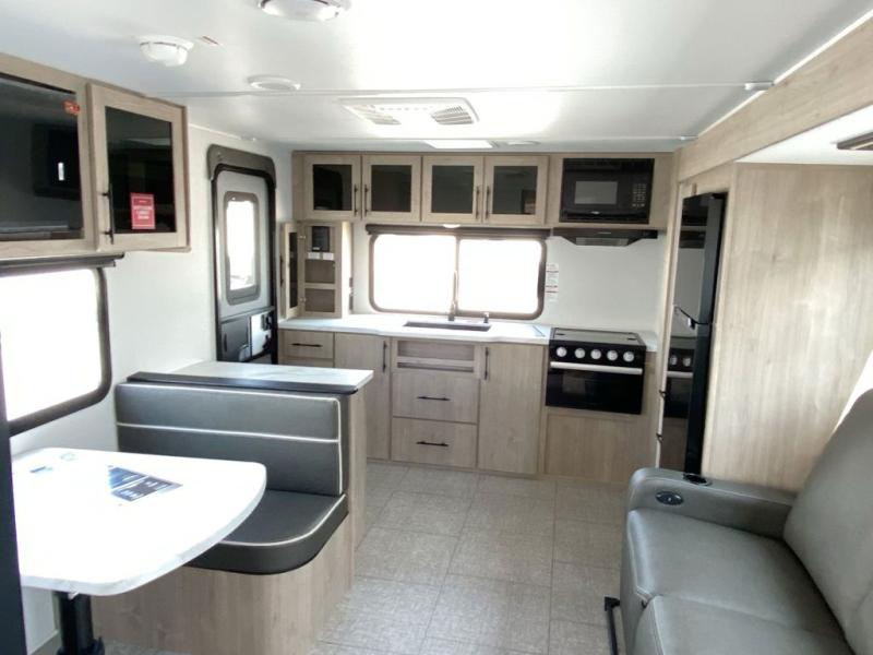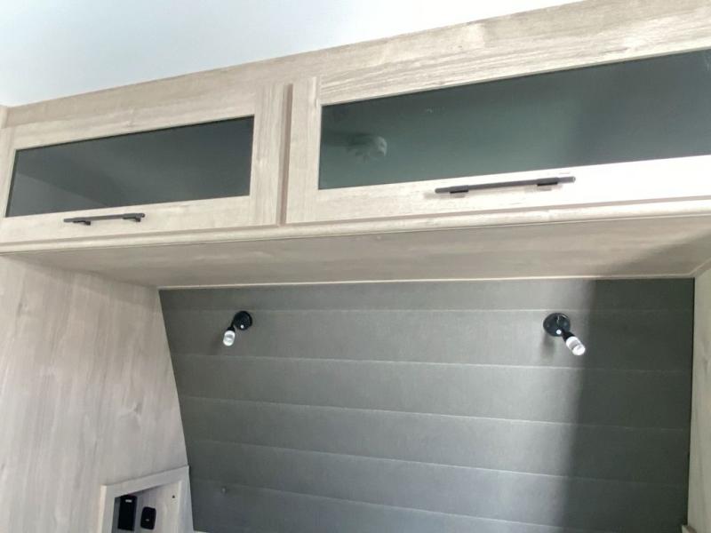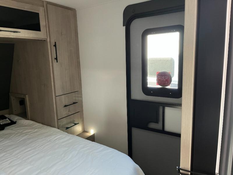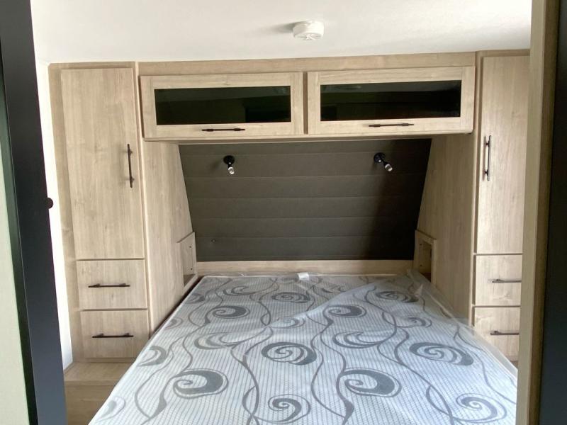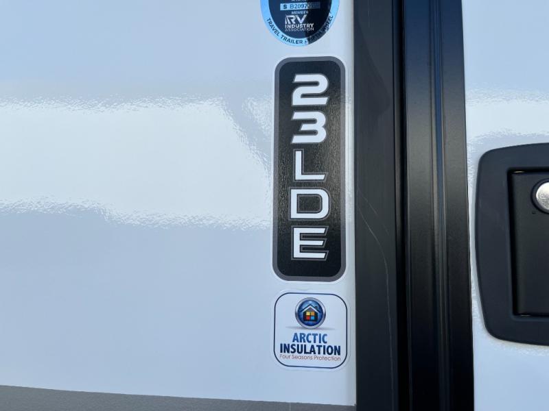 The 23LDE offers a dedicated bedroom with a cozy bed and ample storage for clothing and personal items. The bedroom is separate from the main living space, giving you added privacy and a peaceful place to rest after a full day of exploring. Thoughtful storage options help keep your belongings organized and out of the way.