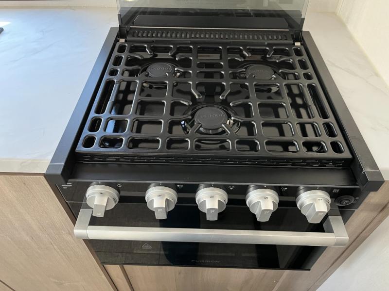 The kitchen is designed for on-the-road living with practical features and quality appliances. A spacious countertop, large sink, three-burner cooktop, oven, microwave, and sizable refrigerator give you everything you need to prepare meals just like at home. Clever cabinetry and pantry space keep cookware and supplies organized and within easy reach.