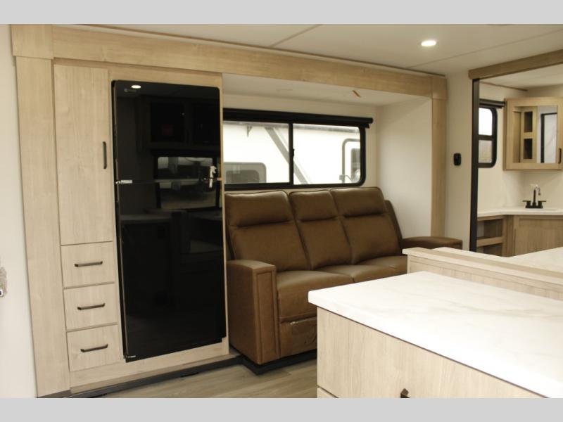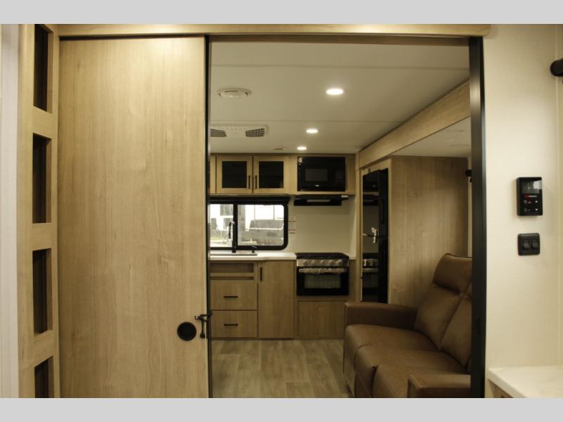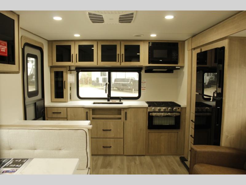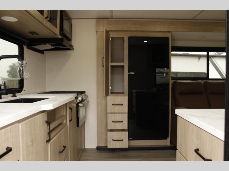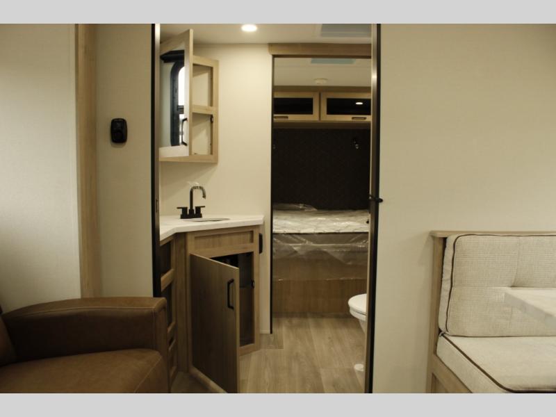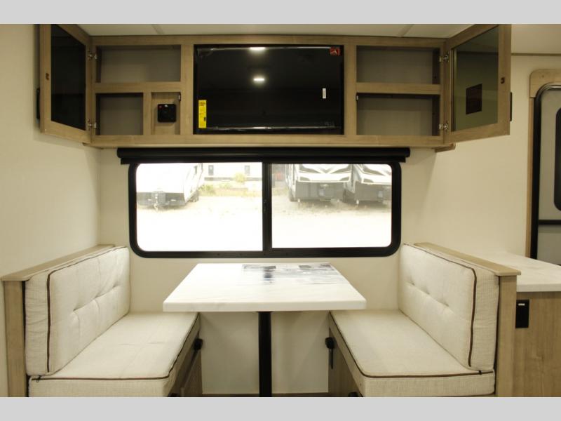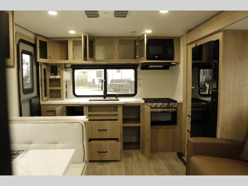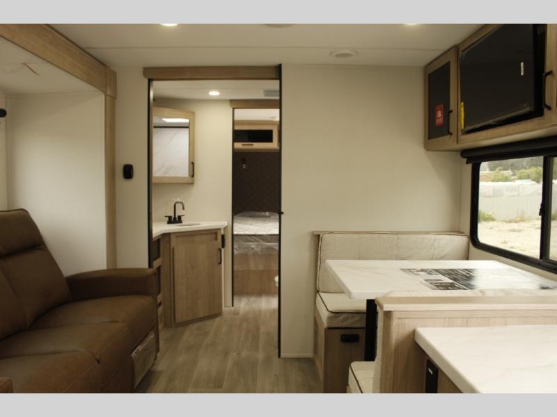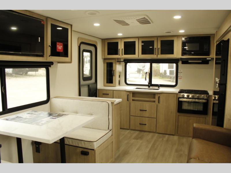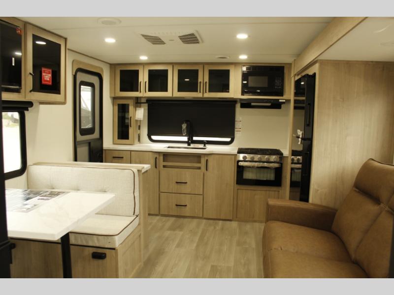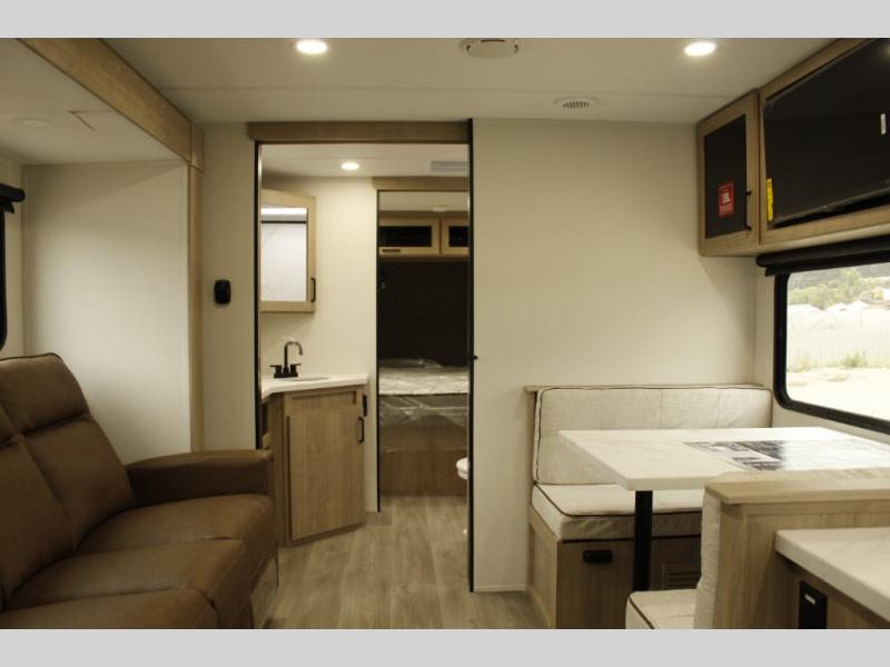 Treat yourself to a weekend of fun in this Imagine XLS travel trailer! Whether it's just you and your spouse, or you've chosen to bring along a group of friends, this trailer will meet your needs. The front bedroom can sleep two people on the walk-around queen-size bed. The bedroom is quite functional because it not only contains the second exterior entry door, but it also has a private entrance into the walk-through bathroom since it is located on the other side of the bathroom. The booth dinette is functional too because it can transform from a dining location into a sleeping location, and the theater seating is directly across from the LED TV for easy viewing. The rear kitchen is fit for the chef on the trip, it features residential countertops, a stainless-steel sink and a 3-burner range with oven for you to cook your meals in comfort.