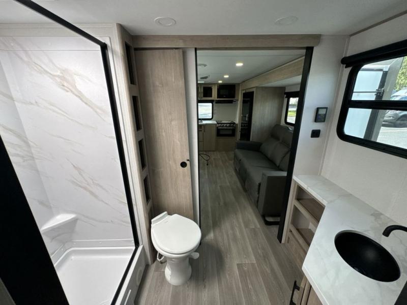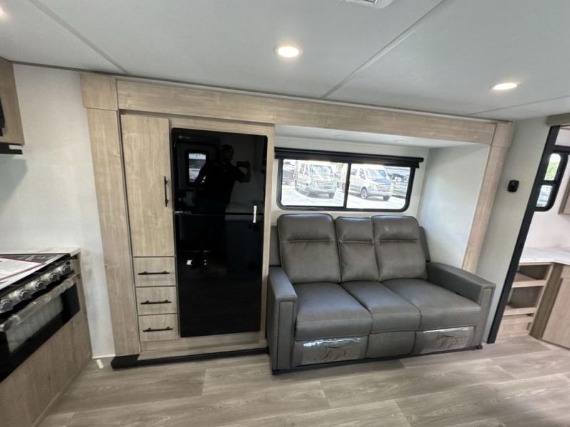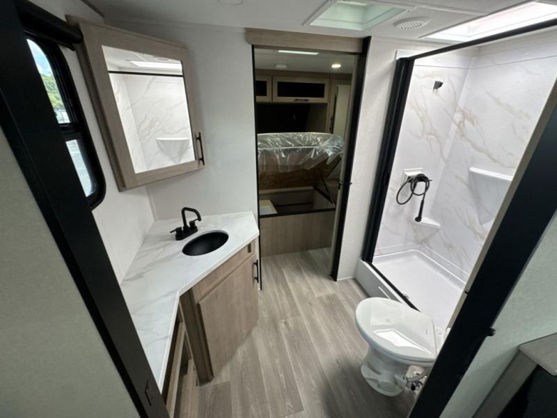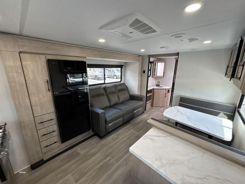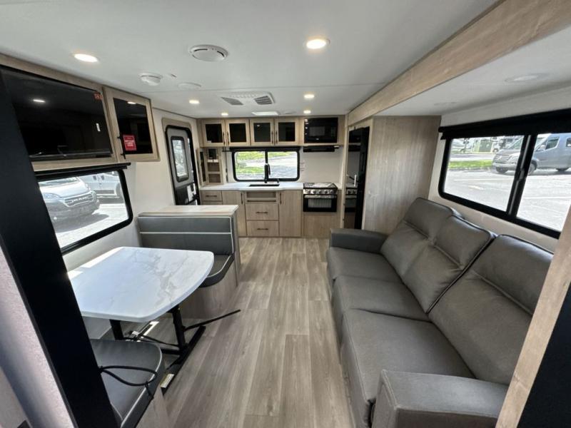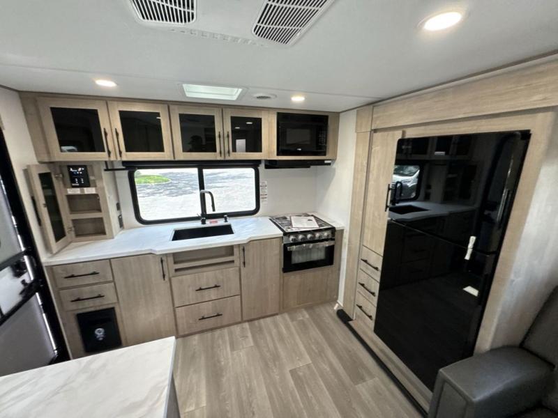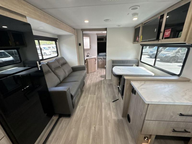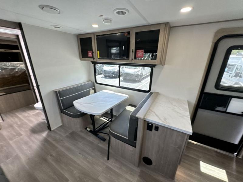 Treat yourself to a weekend of fun in this Imagine XLS travel trailer! Whether it's just you and your spouse, or you've chosen to bring along a group of friends, this trailer will meet your needs. The front bedroom can sleep two people on the walk-around queen-size bed. The bedroom is quite functional because it not only contains the second exterior entry door, but it also has a private entrance into the walk-through bathroom since it is located on the other side of the bathroom. The booth dinette is functional too because it can transform from a dining location into a sleeping location, and the theater seating is directly across from the LED TV for easy viewing. The rear kitchen is fit for the chef on the trip, it features residential countertops, a stainless-steel sink and a 3-burner range with oven for you to cook your meals in comfort.