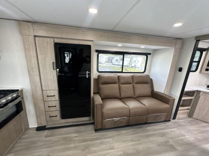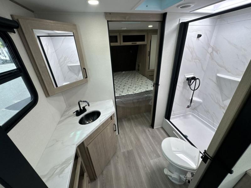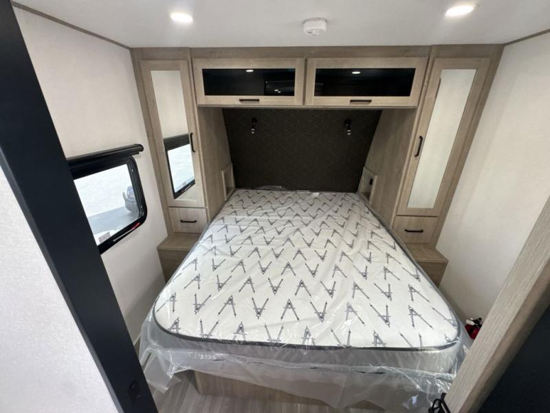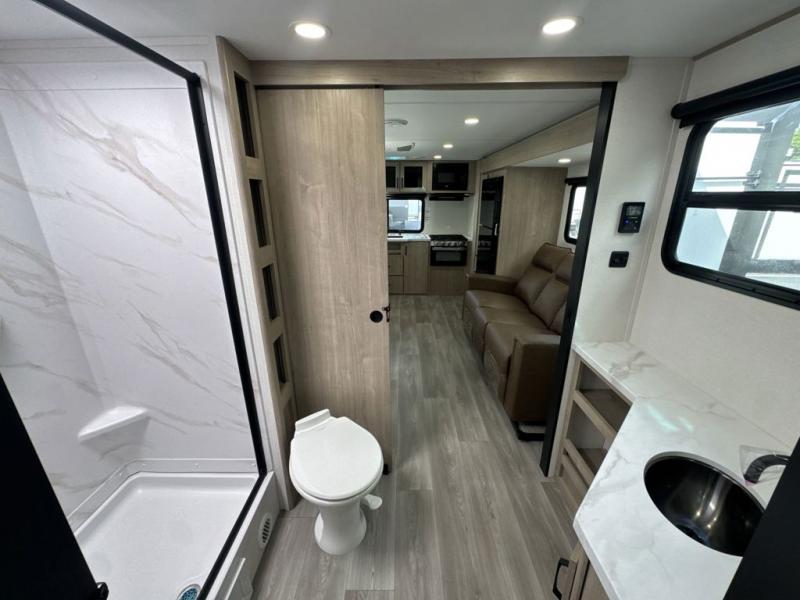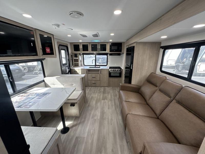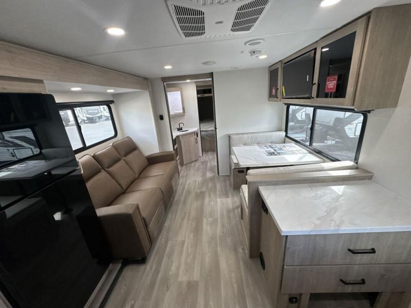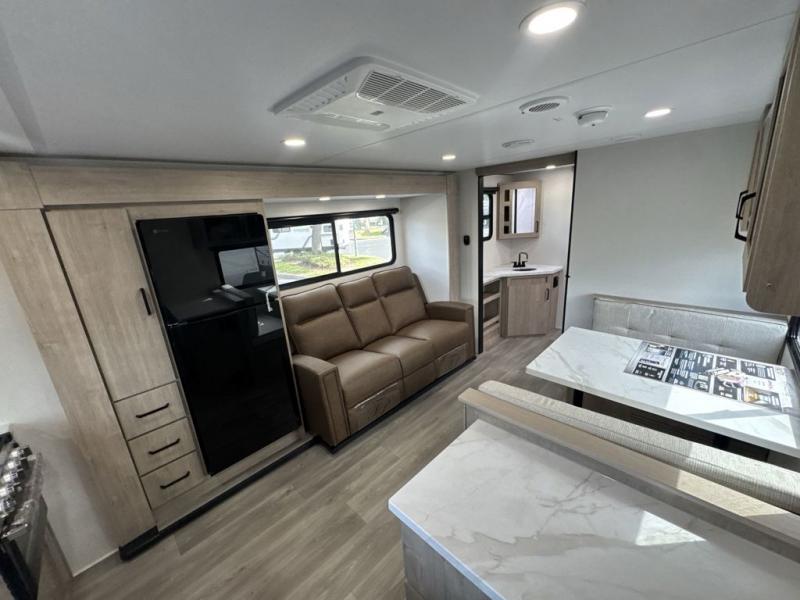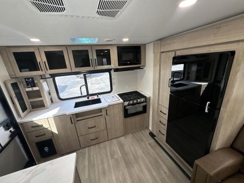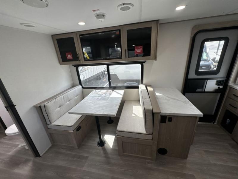 Treat yourself to a weekend of fun in this Imagine XLS travel trailer! Whether it's just you and your spouse, or you've chosen to bring along a group of friends, this trailer will meet your needs. The front bedroom can sleep two people on the walk-around queen-size bed. The bedroom is quite functional because it not only contains the second exterior entry door, but it also has a private entrance into the walk-through bathroom since it is located on the other side of the bathroom. The booth dinette is functional too because it can transform from a dining location into a sleeping location, and the theater seating is directly across from the LED TV for easy viewing. The rear kitchen is fit for the chef on the trip, it features residential countertops, a stainless-steel sink and a 3-burner range with oven for you to cook your meals in comfort.