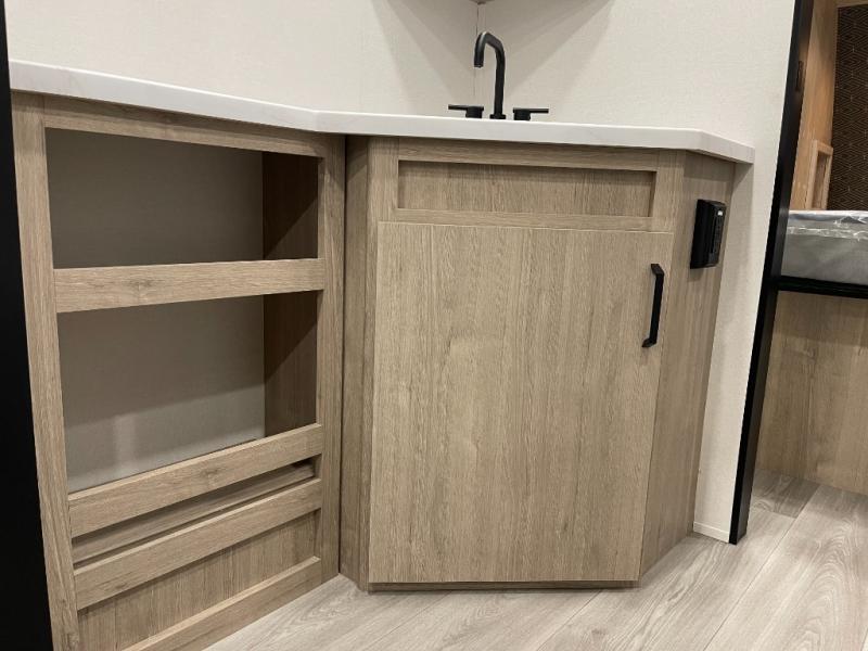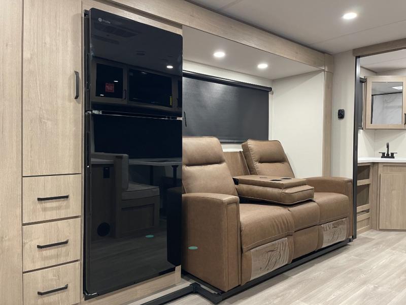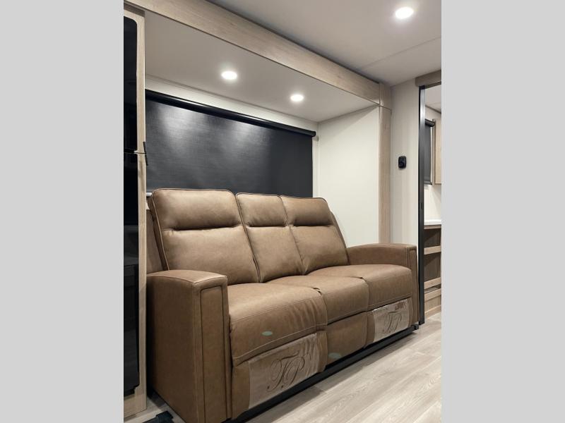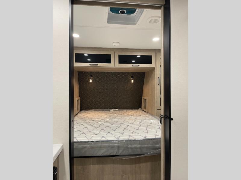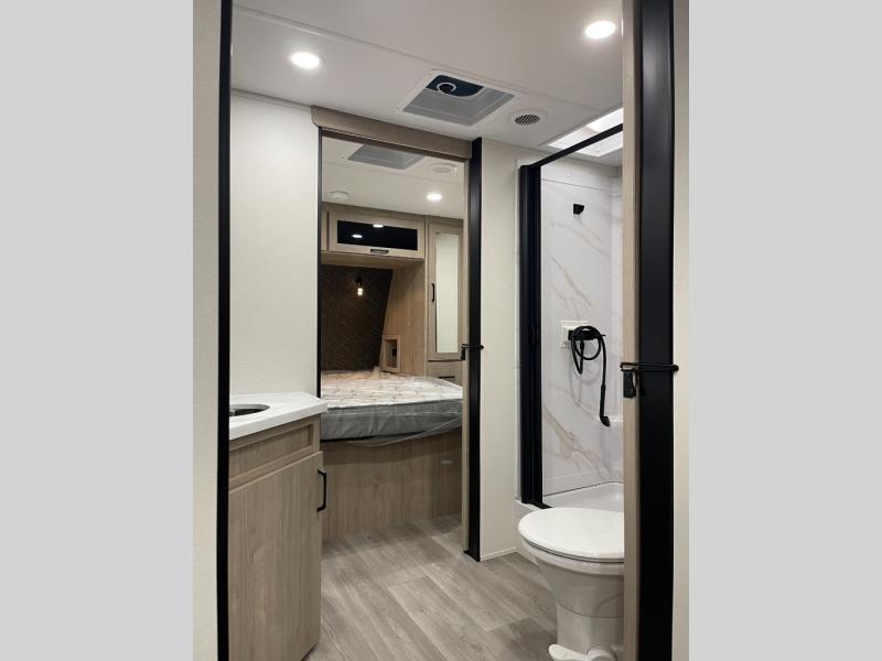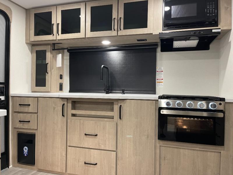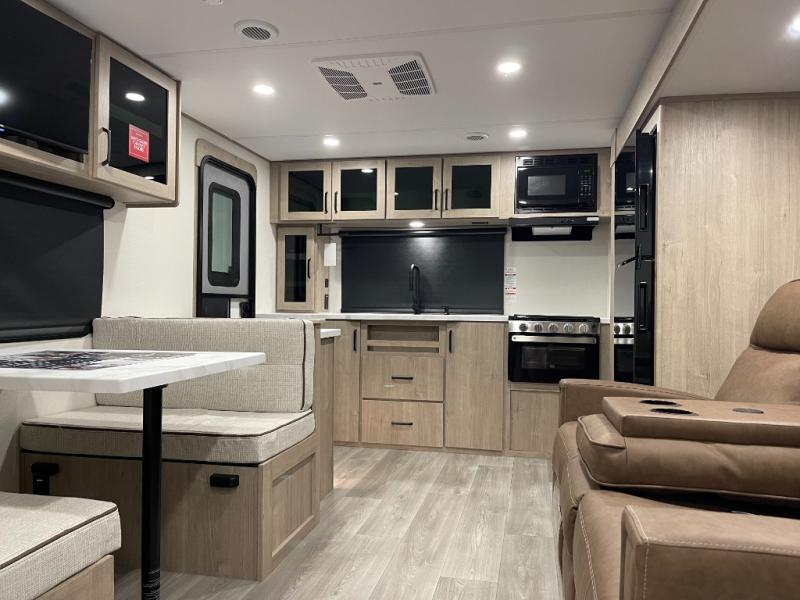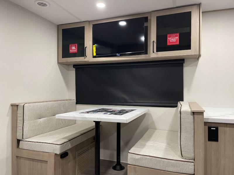 Treat yourself to a weekend of fun in this Imagine XLS travel trailer! Whether it's just you and your spouse, or you've chosen to bring along a group of friends, this trailer will meet your needs. The front bedroom can sleep two people on the walk-around queen-size bed. The bedroom is quite functional because it not only contains the second exterior entry door, but it also has a private entrance into the walk-through bathroom since it is located on the other side of the bathroom. The booth dinette is functional too because it can transform from a dining location into a sleeping location, and the theater seating is directly across from the LED TV for easy viewing. The rear kitchen is fit for the chef on the trip, it features residential countertops, a stainless-steel sink and a 3-burner range with oven for you to cook your meals in comfort.