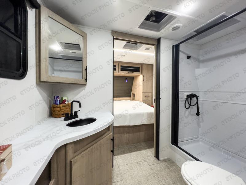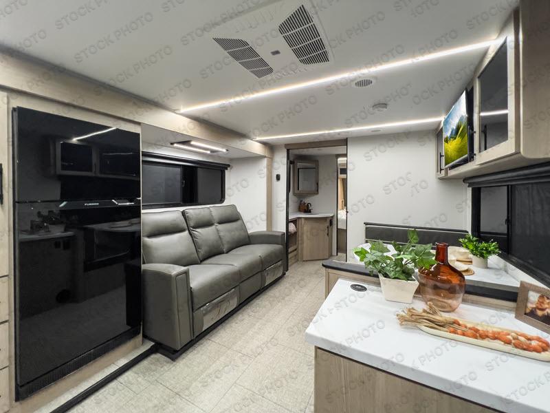 Treat yourself to a weekend of fun in this Imagine XLS travel trailer! Whether it's just you and your spouse, or you've chosen to bring along a group of friends, this trailer will meet your needs. The front bedroom can sleep two people on the walk-around queen-size bed. The bedroom is quite functional because it not only contains the second exterior entry door, but it also has a private entrance into the walk-through bathroom since it is located on the other side of the bathroom. The booth dinette is functional too because it can transform from a dining location into a sleeping location, and the theater seating is directly across from the LED TV for easy viewing. The rear kitchen is fit for the chef on the trip, it features residential countertops, a stainless-steel sink and a 3-burner range with oven for you to cook your meals in comfort.