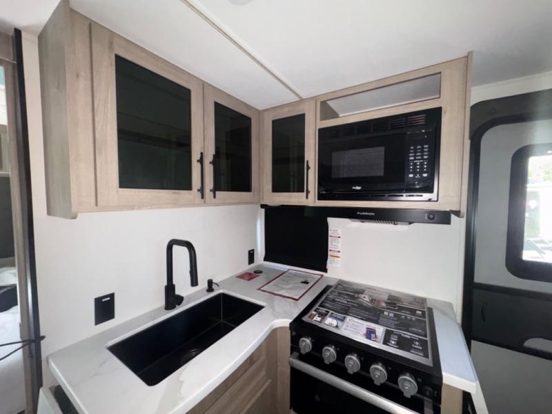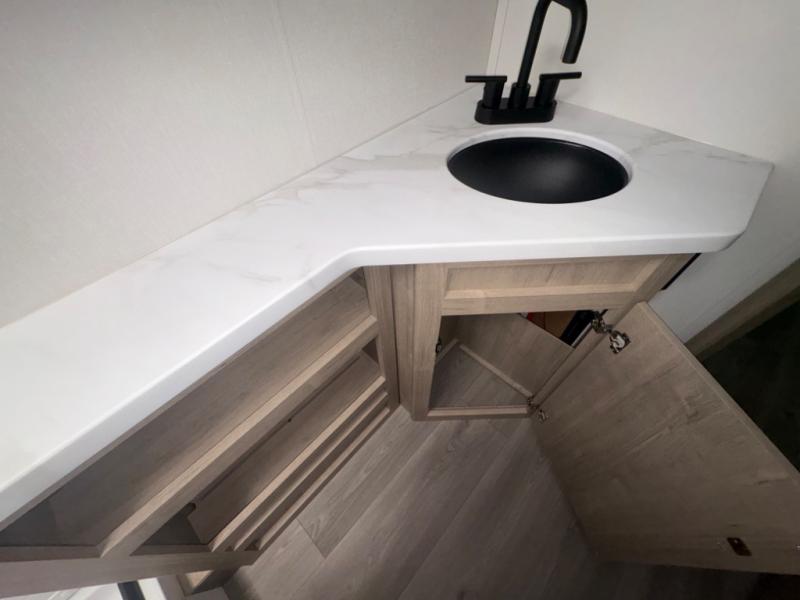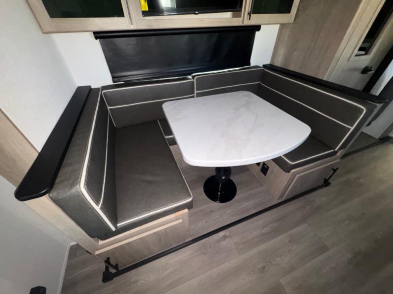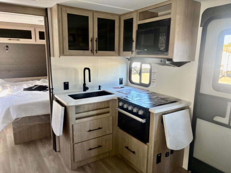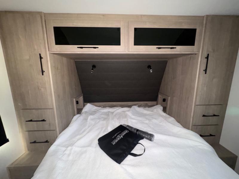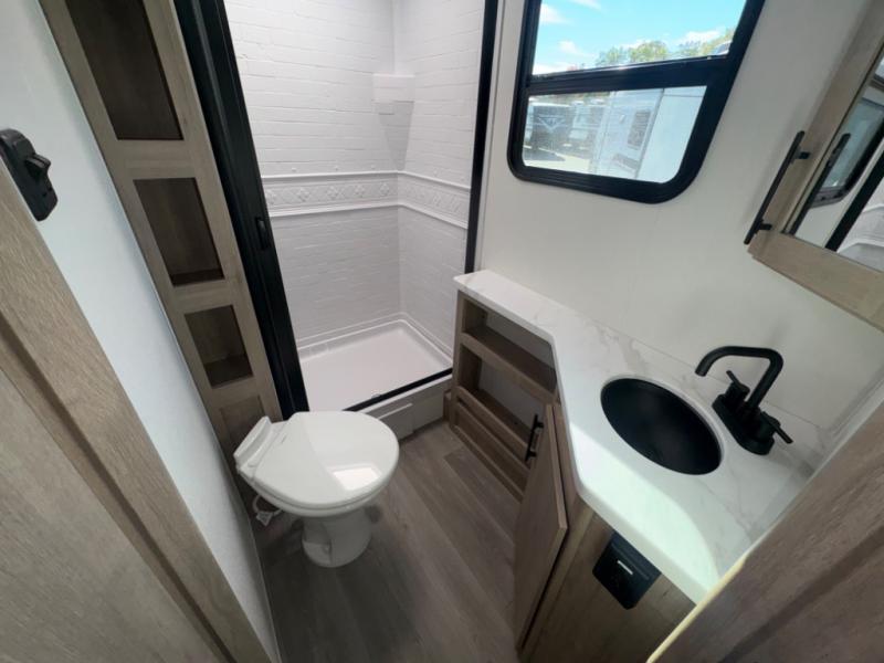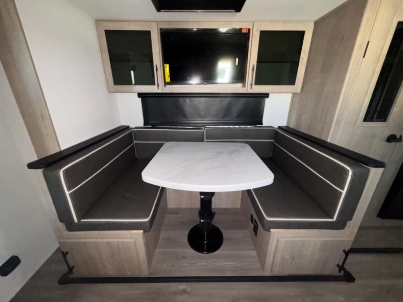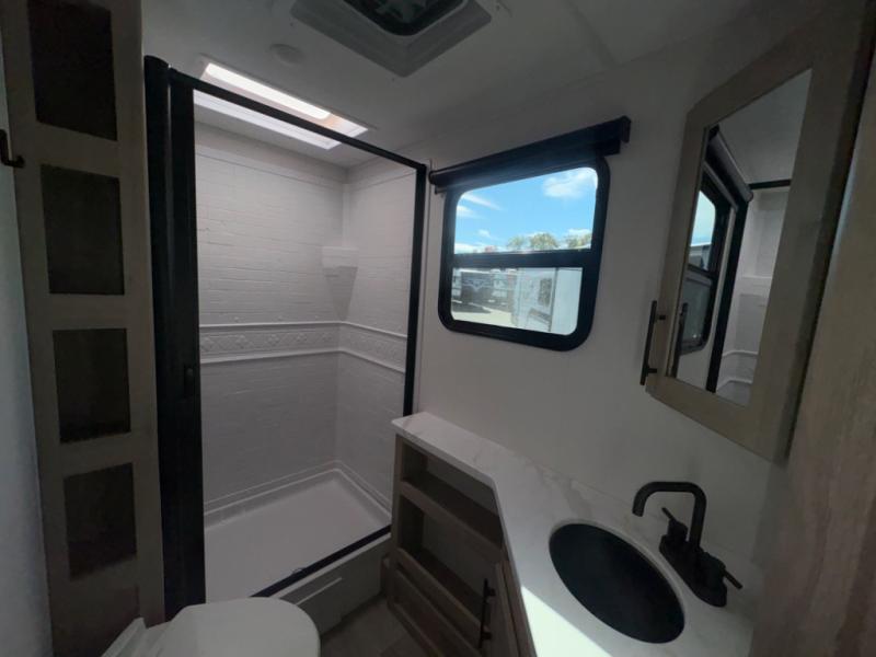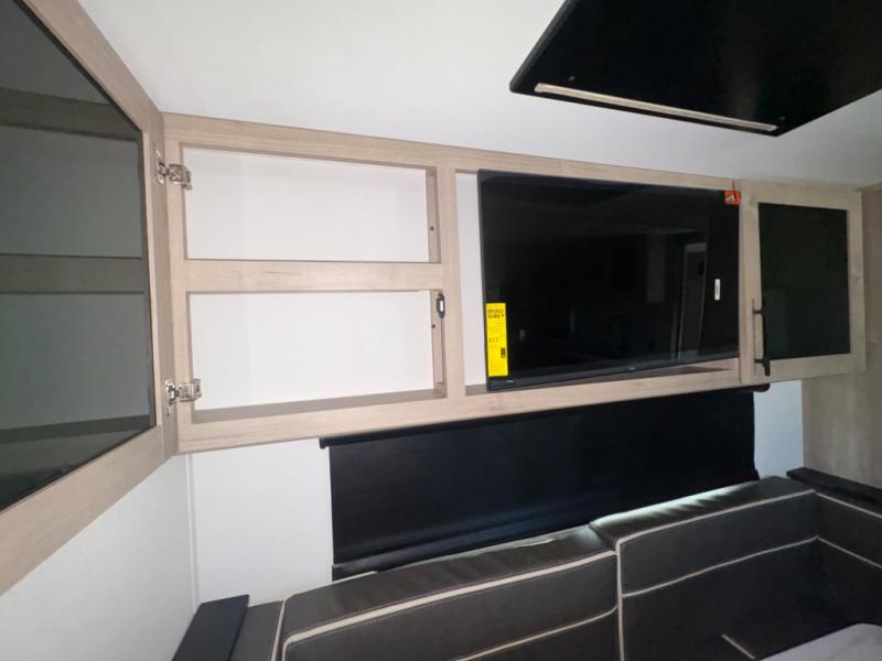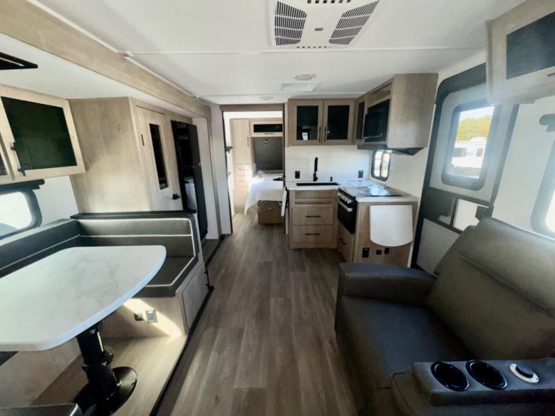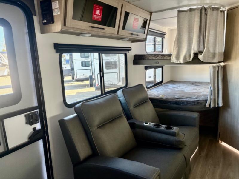 The 25DBE packs in everything you need for fun on the road — double-size rear bunks, a private queen bedroom with sliding doors, and a spacious slide-out with a convertible dinette and theater seating. With sleeping space for up to eight, this layout is ideal for growing families, couples who host guests, or anyone who loves extra room.
