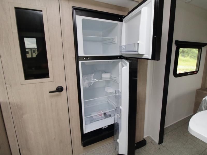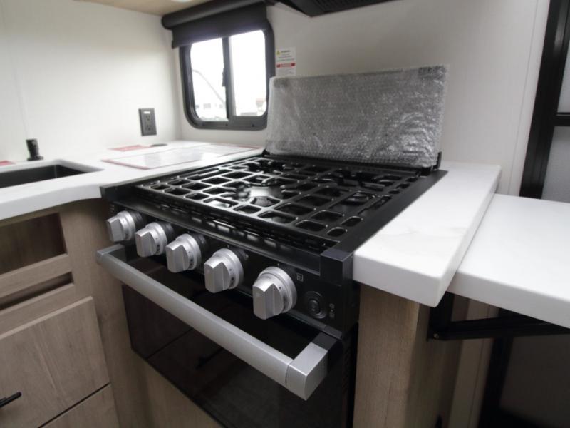 Enjoy full-meal capability with a three-burner range, microwave, deep stainless steel sink, flip-up countertop extension, and a 12V refrigerator to keep your meals fresh and drinks cold. You’ll feel right at home while cooking on the road.