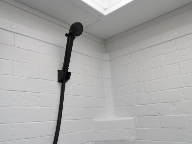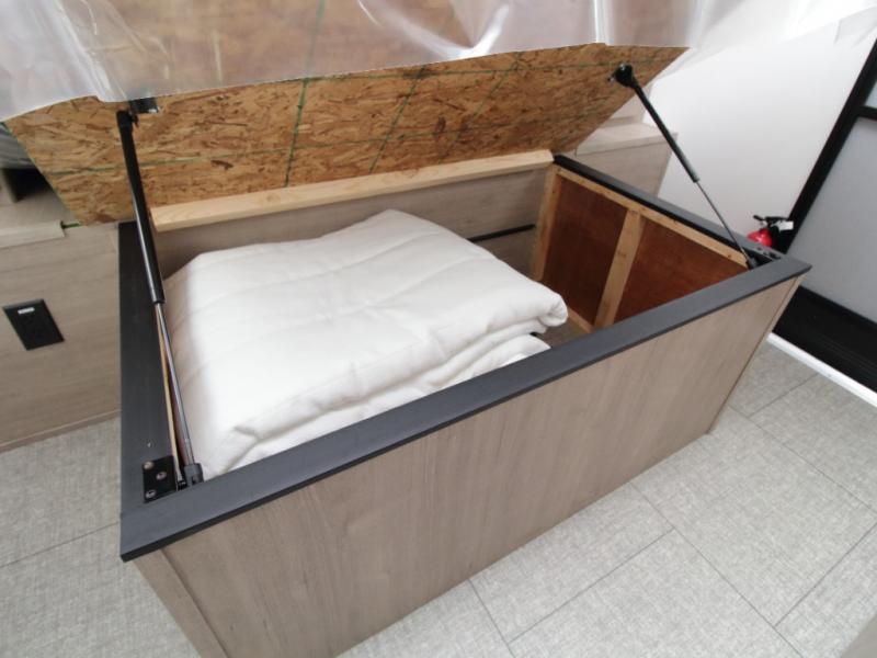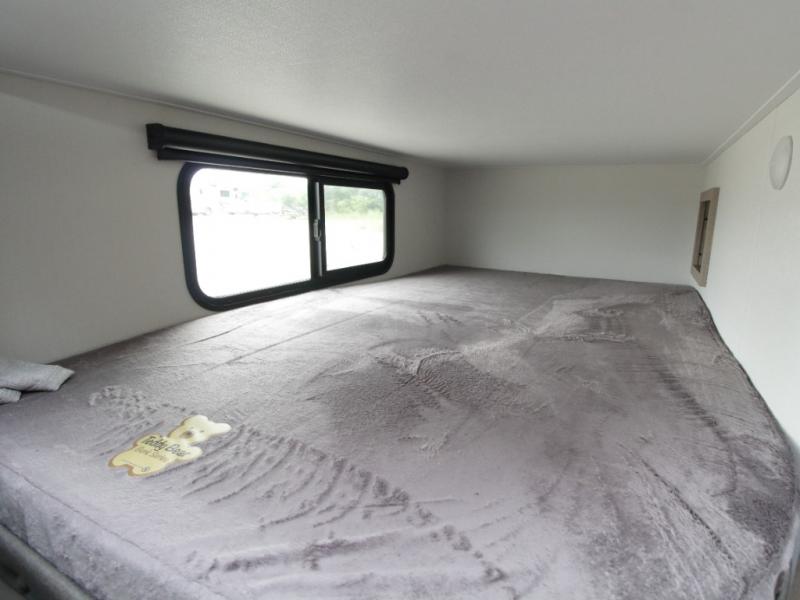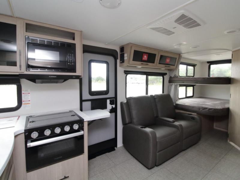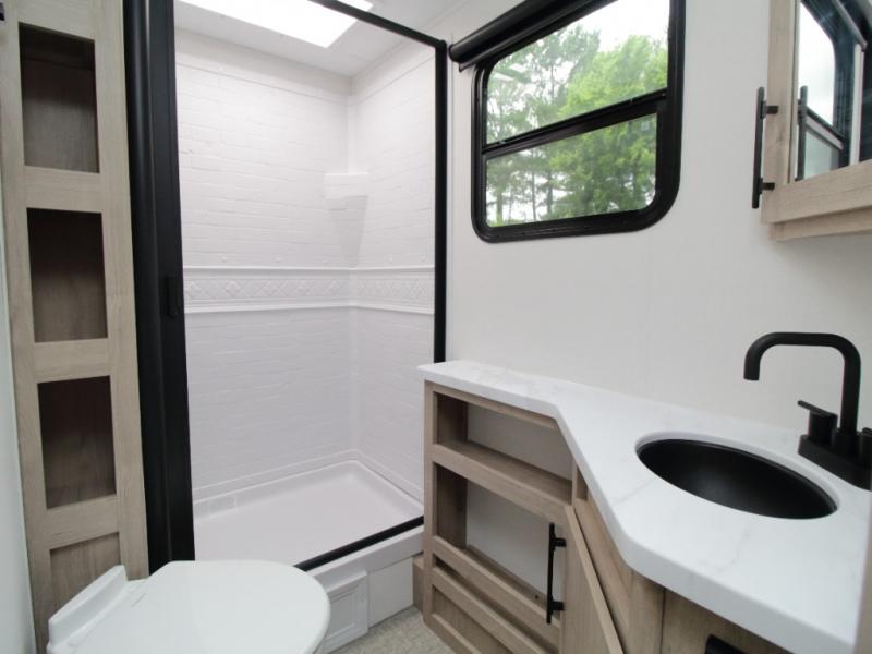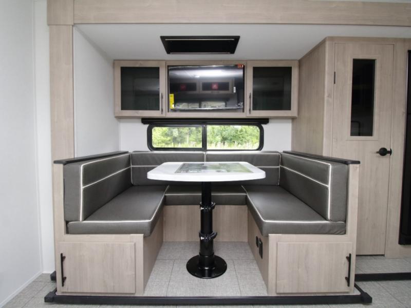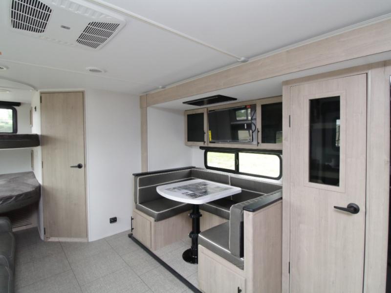 The large U-shaped dinette sits in the slide and provides ample space for shared meals, card games, or even extra sleeping space when needed. The spacious rear bath is located next to the bunks and includes a large shower, linen closet, and plenty of room to refresh after a day of play.