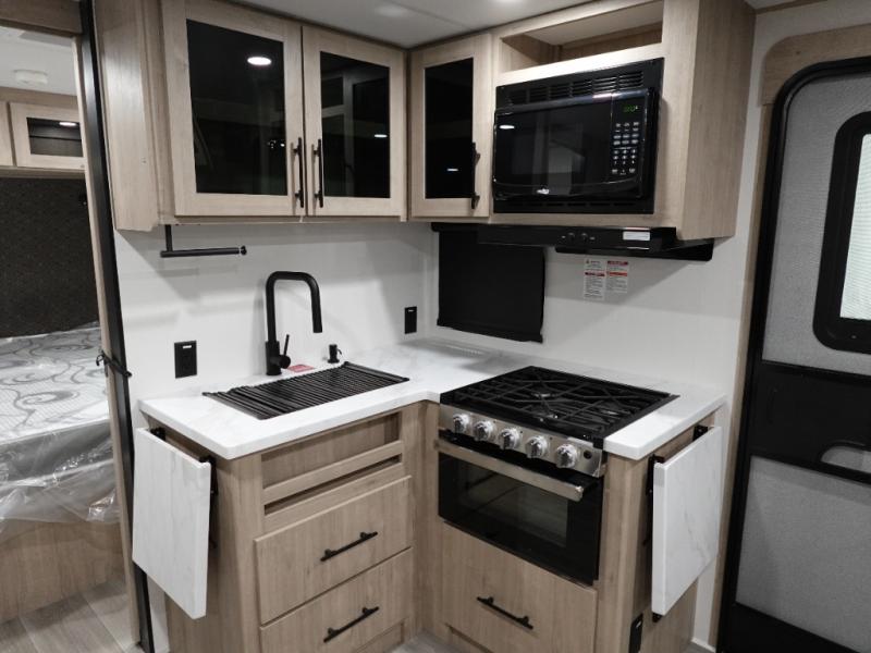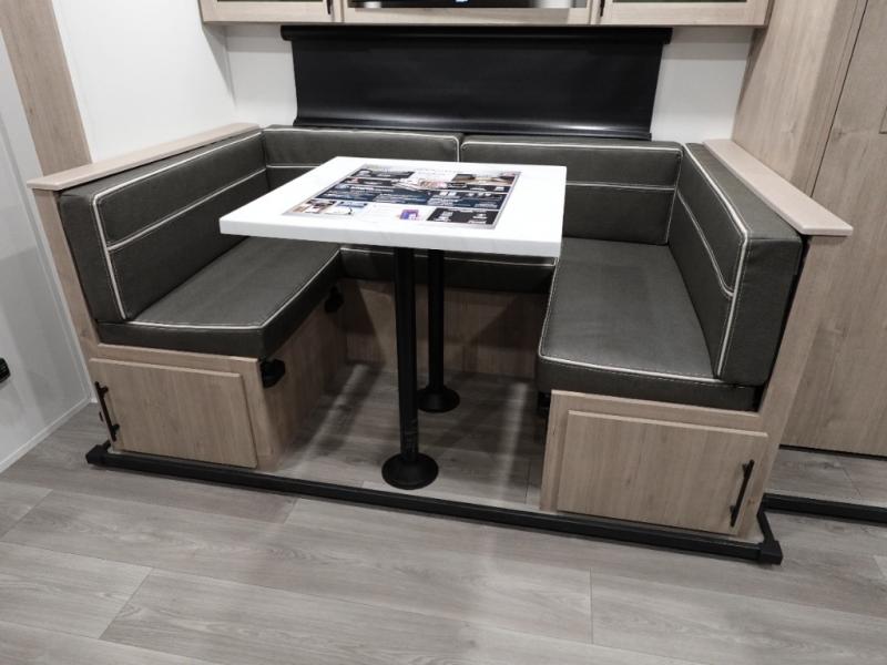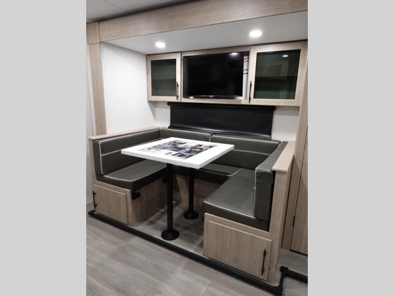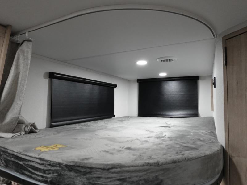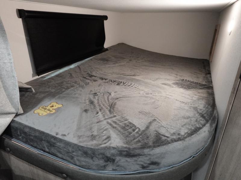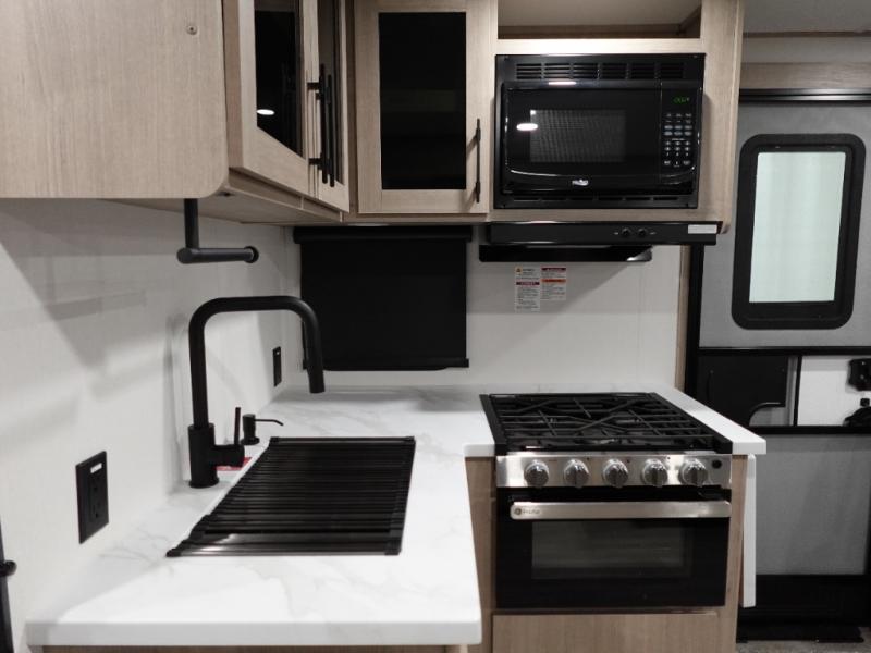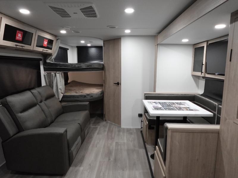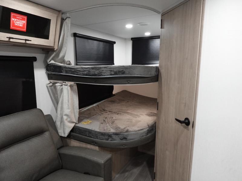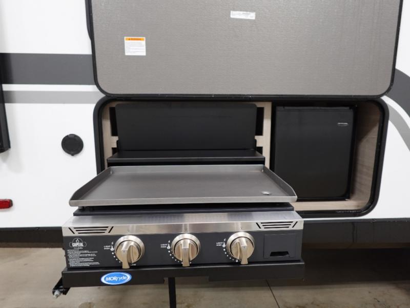 The dual entry doors make it easy to enter and exit this travel trailer! You will find a walk-around queen-size bed up front in the private bedroom, and one of the entry/exit doors to the unit so you can quietly slip out for an early morning fishing trip. The U-shaped dinette is right next to the window, so you can look out at your surroundings while you enjoy breakfast. The double-size bunks have some privacy curtains, and the bunks are right next to the full bathroom for easy access in the middle of the night. The fully equipped kitchen has everything you need to get dinner in the oven, and you can have some more prep space by using the flip-up countertop extension. You even have an outdoor griddle and an outdoor 1.6 cu. ft. refrigerator to enjoy a cold beverage while you cook under the 22' electric awning!