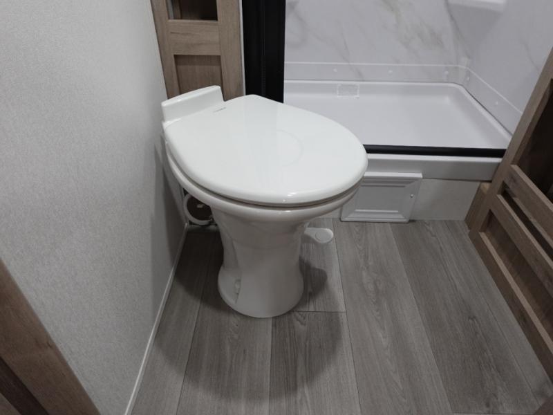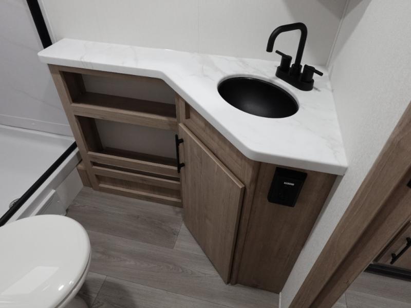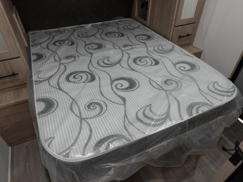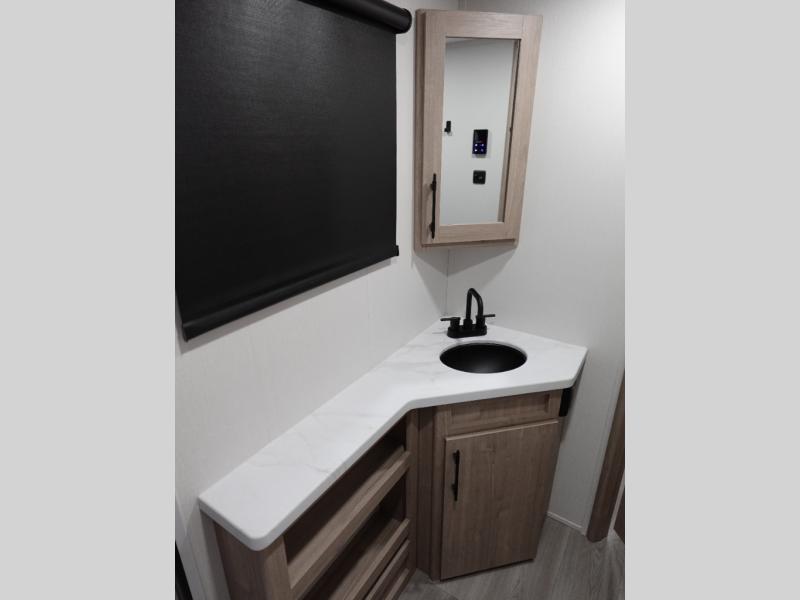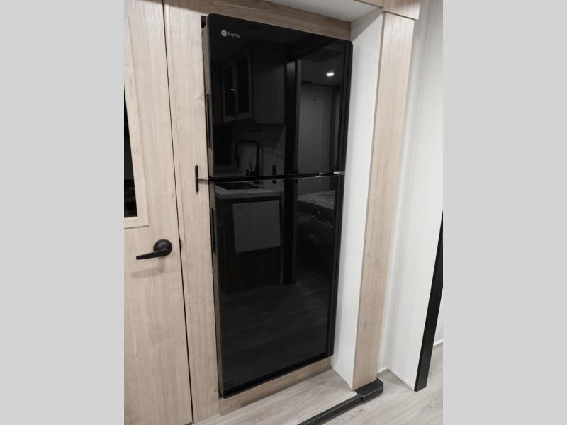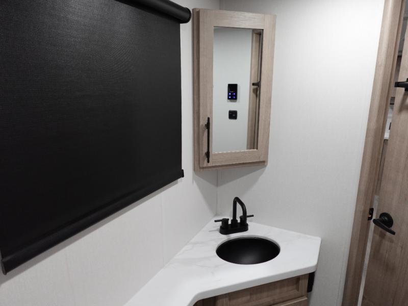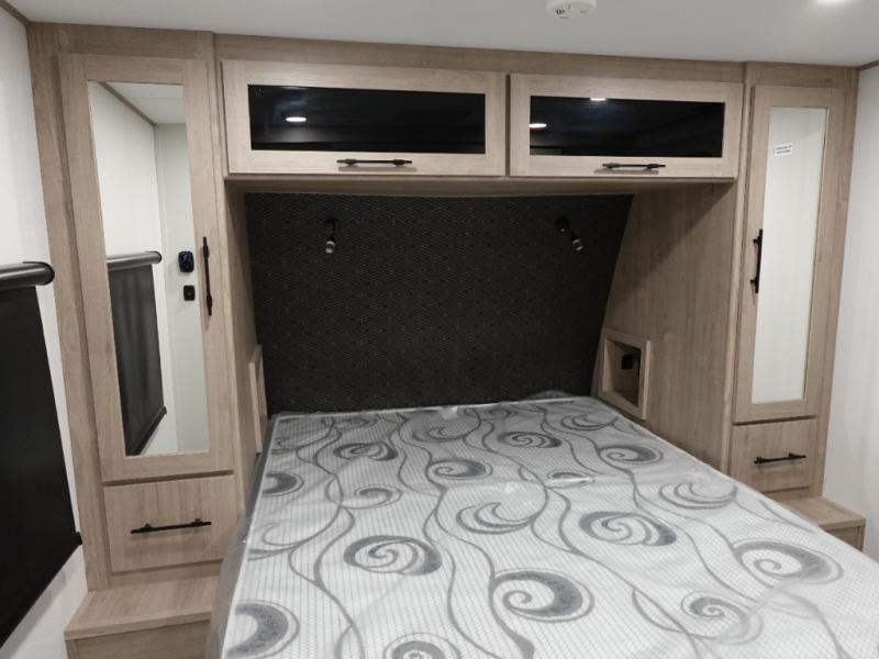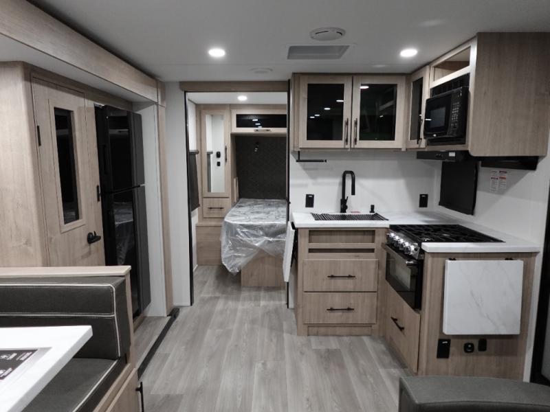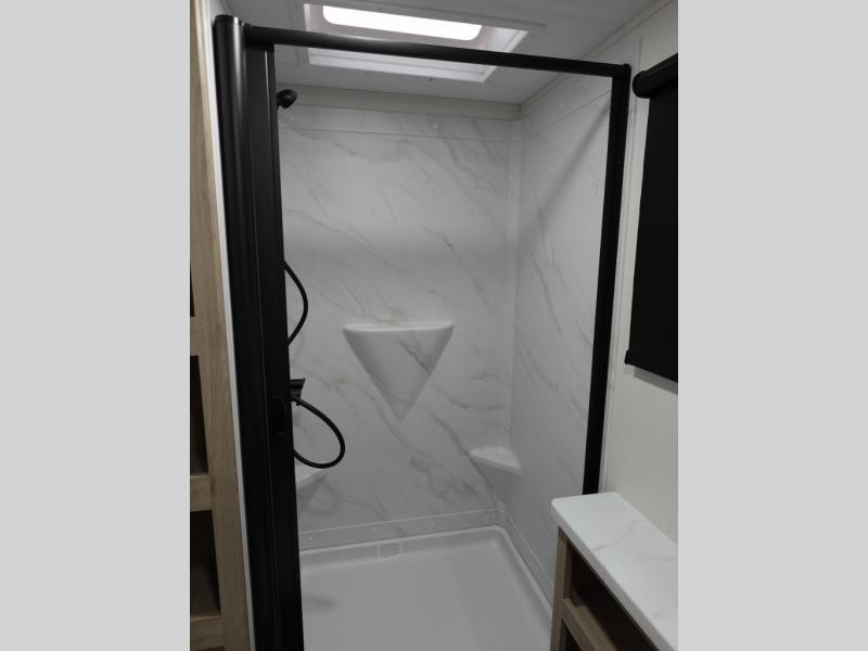 The dual entry doors make it easy to enter and exit this travel trailer! You will find a walk-around queen-size bed up front in the private bedroom, and one of the entry/exit doors to the unit so you can quietly slip out for an early morning fishing trip. The U-shaped dinette is right next to the window, so you can look out at your surroundings while you enjoy breakfast. The double-size bunks have some privacy curtains, and the bunks are right next to the full bathroom for easy access in the middle of the night. The fully equipped kitchen has everything you need to get dinner in the oven, and you can have some more prep space by using the flip-up countertop extension. You even have an outdoor griddle and an outdoor 1.6 cu. ft. refrigerator to enjoy a cold beverage while you cook under the 22' electric awning!