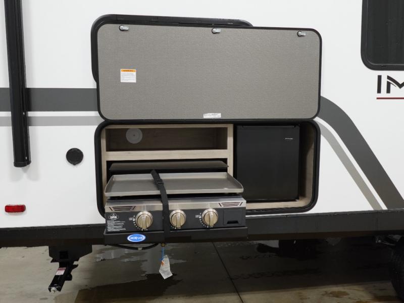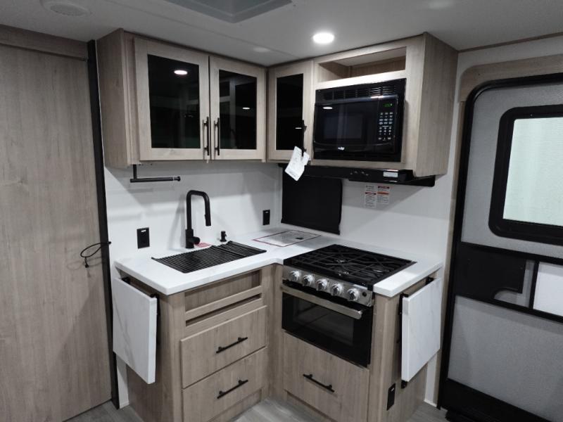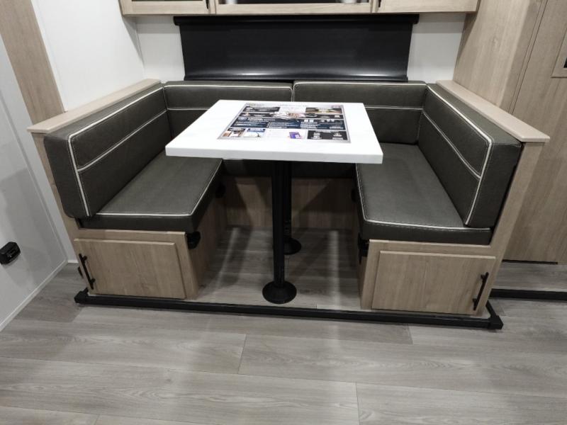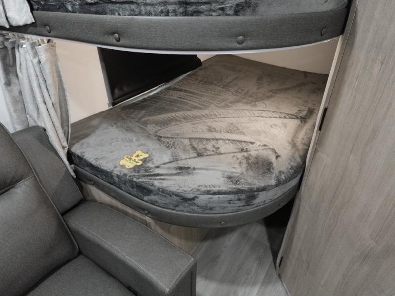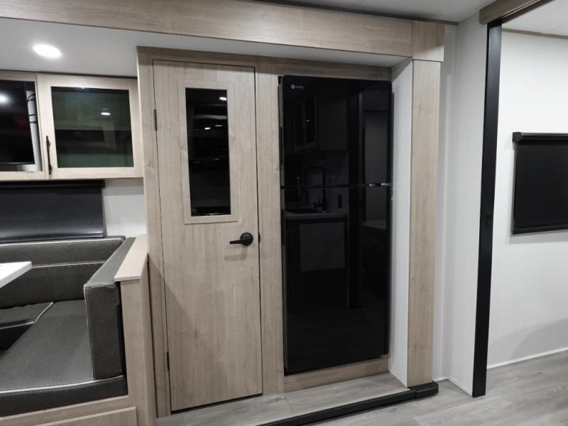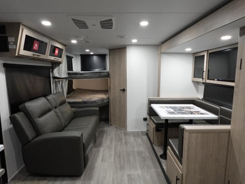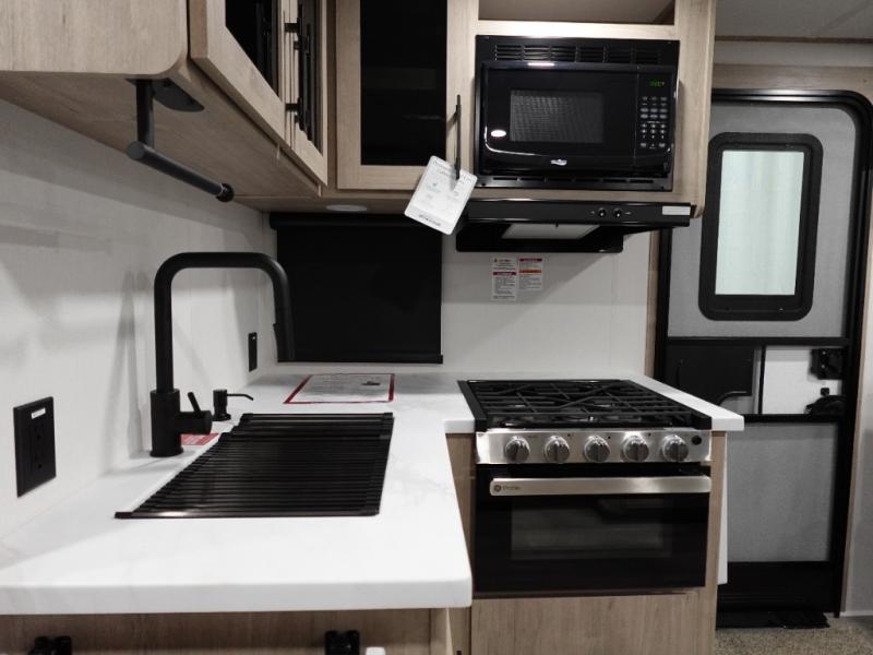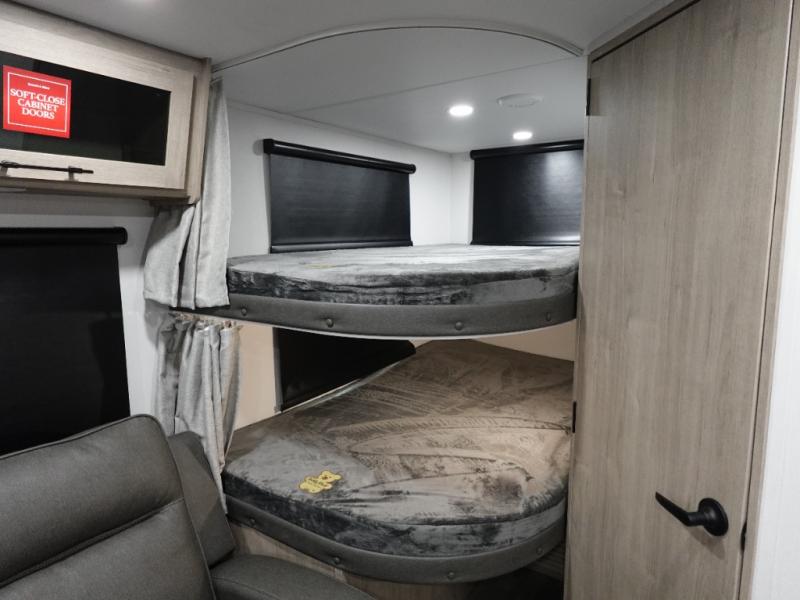 The dual entry doors make it easy to enter and exit this travel trailer! You will find a walk-around queen-size bed up front in the private bedroom, and one of the entry/exit doors to the unit so you can quietly slip out for an early morning fishing trip. The U-shaped dinette is right next to the window, so you can look out at your surroundings while you enjoy breakfast. The double-size bunks have some privacy curtains, and the bunks are right next to the full bathroom for easy access in the middle of the night. The fully equipped kitchen has everything you need to get dinner in the oven, and you can have some more prep space by using the flip-up countertop extension. You even have an outdoor griddle and an outdoor 1.6 cu. ft. refrigerator to enjoy a cold beverage while you cook under the 22' electric awning!
