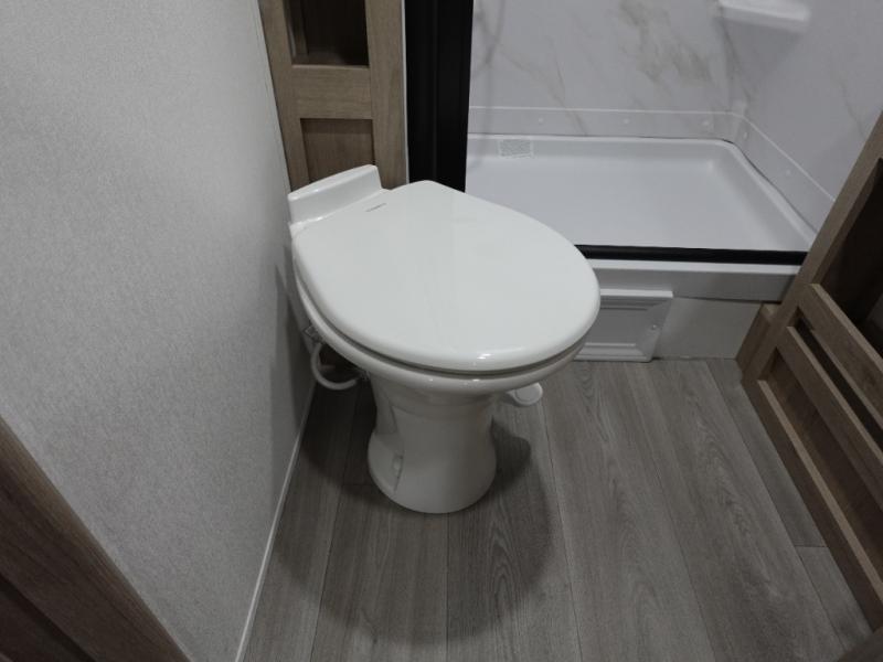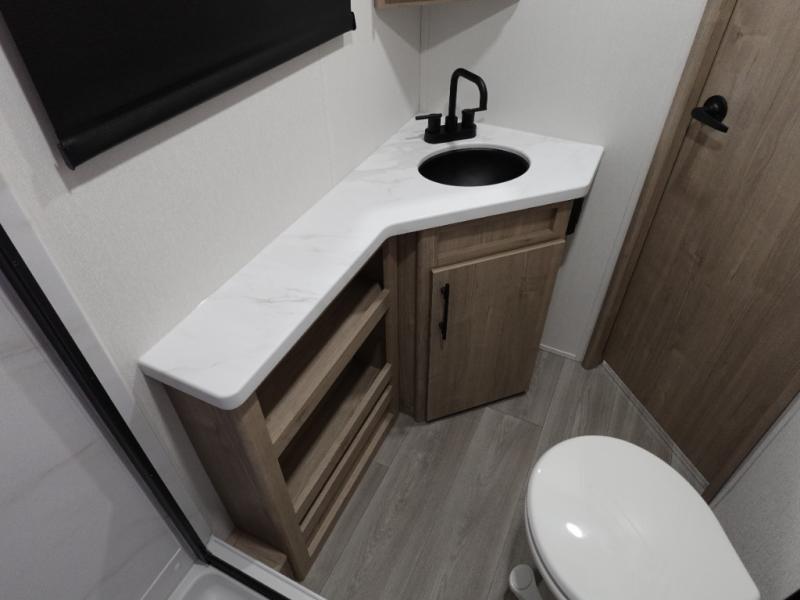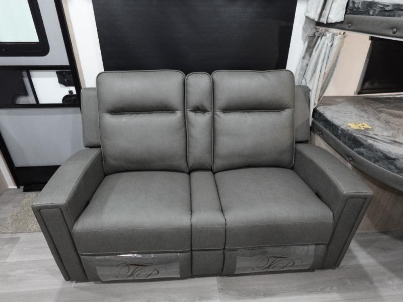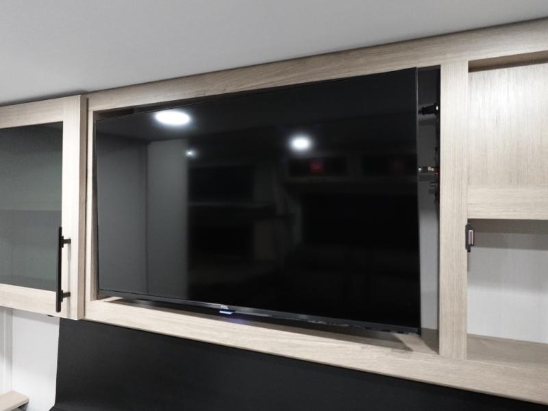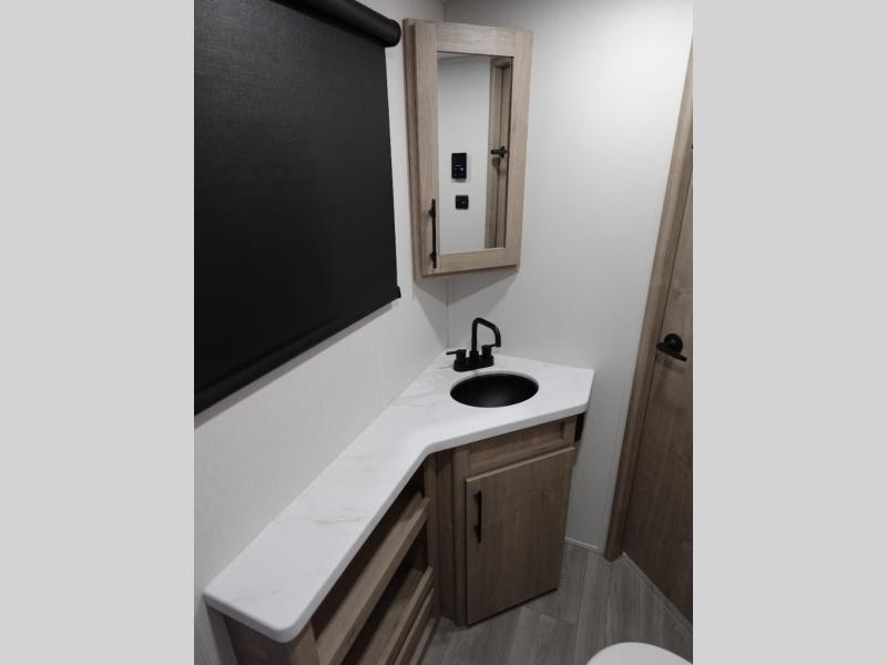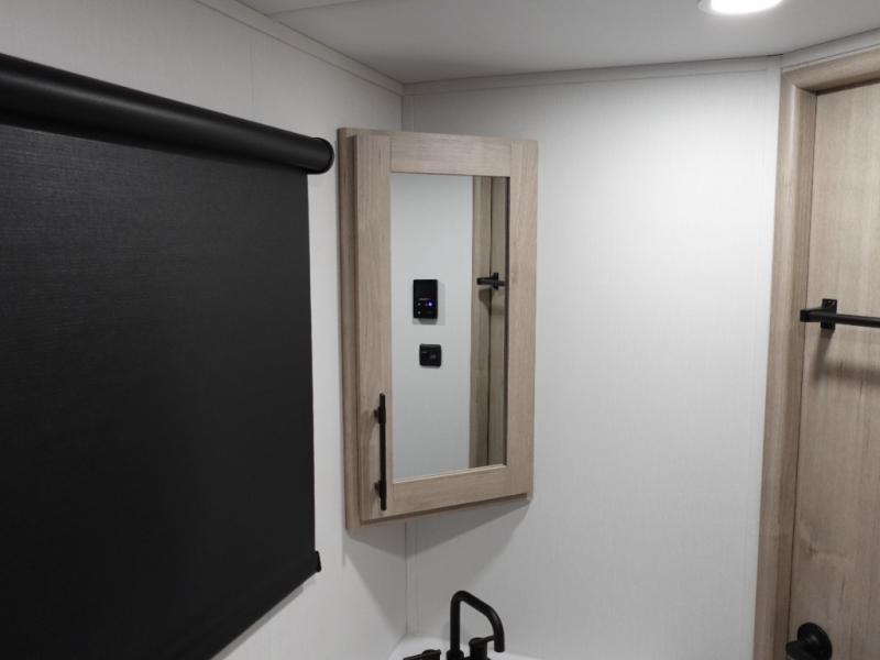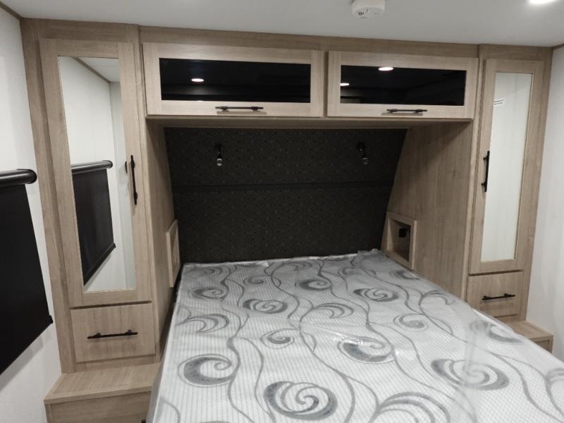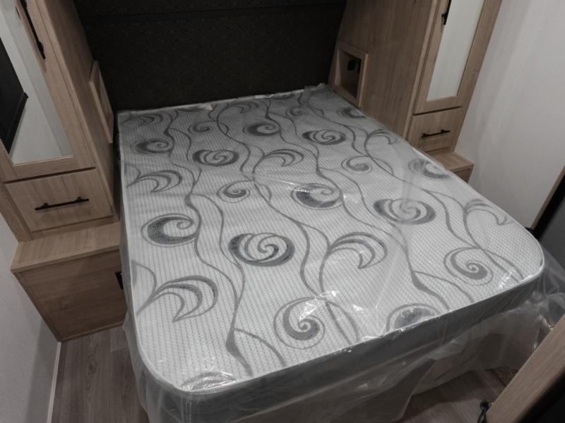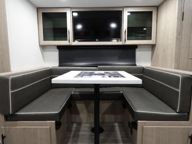 The dual entry doors make it easy to enter and exit this travel trailer! You will find a walk-around queen-size bed up front in the private bedroom, and one of the entry/exit doors to the unit so you can quietly slip out for an early morning fishing trip. The U-shaped dinette is right next to the window, so you can look out at your surroundings while you enjoy breakfast. The double-size bunks have some privacy curtains, and the bunks are right next to the full bathroom for easy access in the middle of the night. The fully equipped kitchen has everything you need to get dinner in the oven, and you can have some more prep space by using the flip-up countertop extension. You even have an outdoor griddle and an outdoor 1.6 cu. ft. refrigerator to enjoy a cold beverage while you cook under the 22' electric awning!
