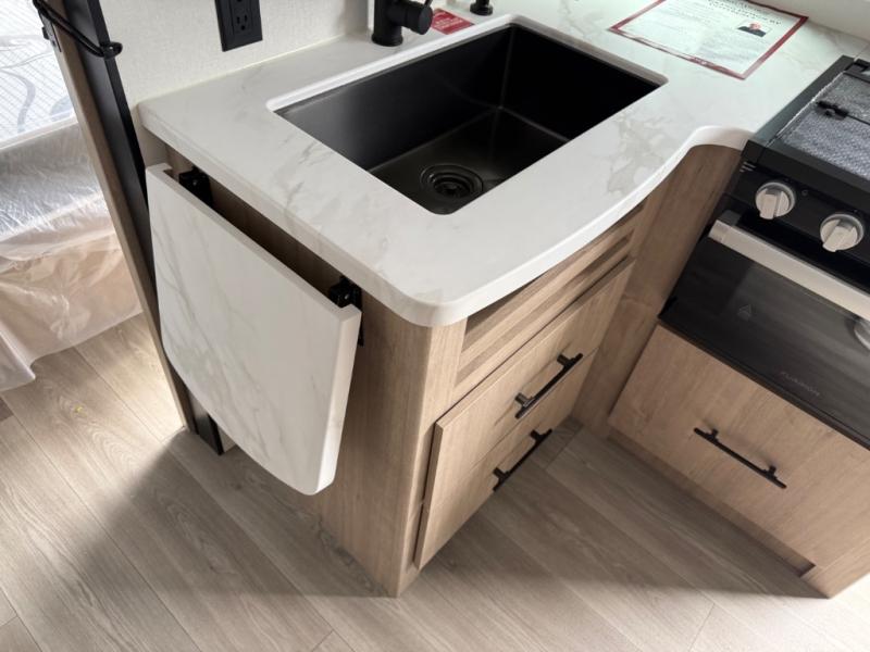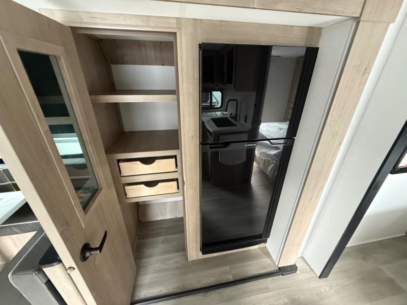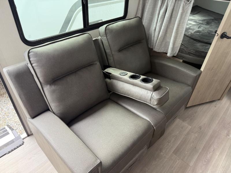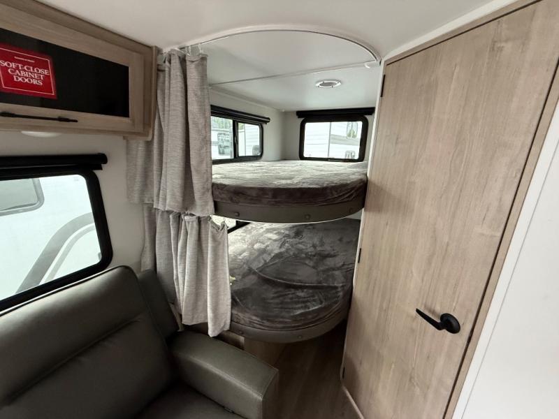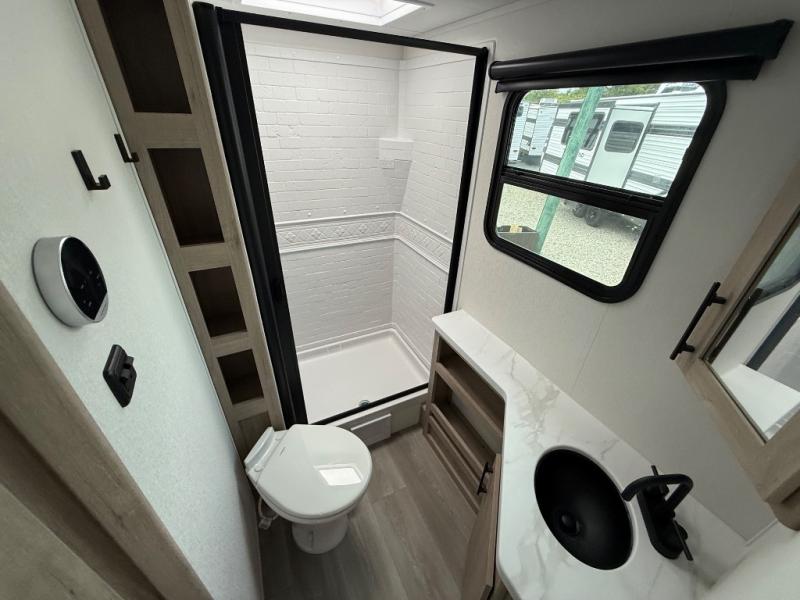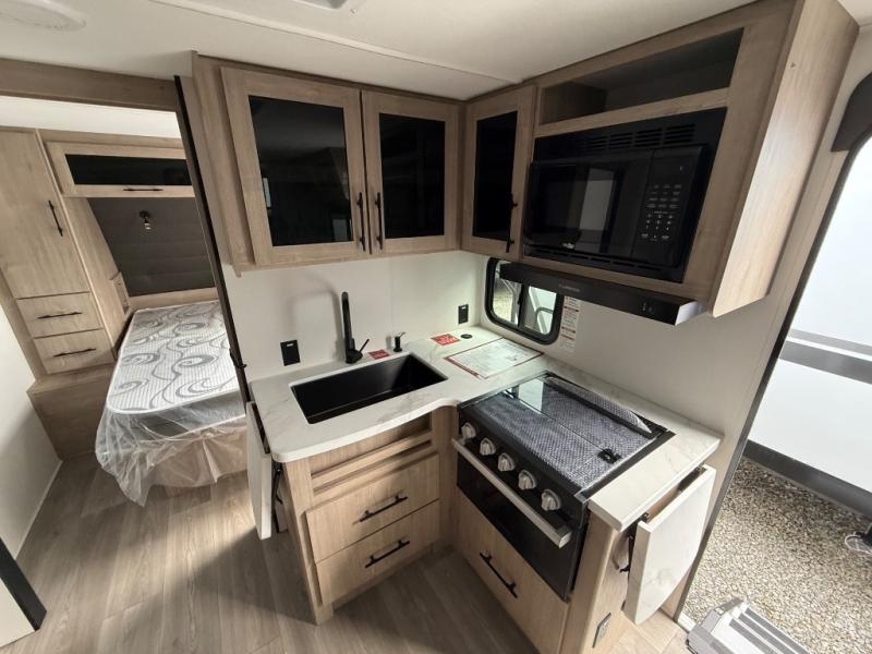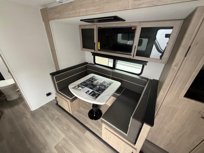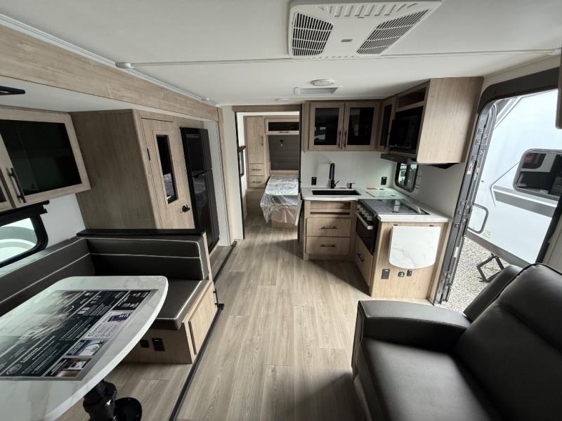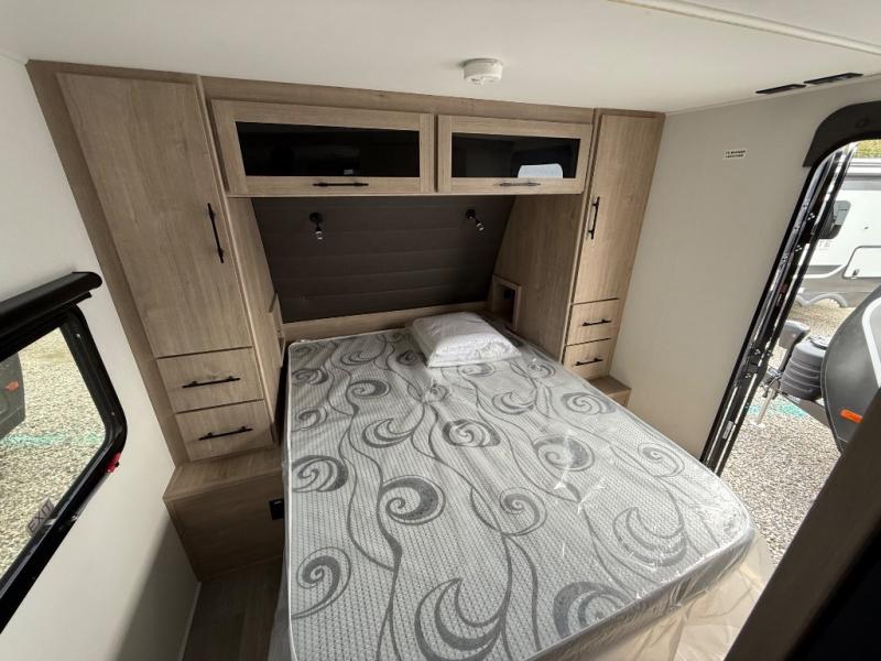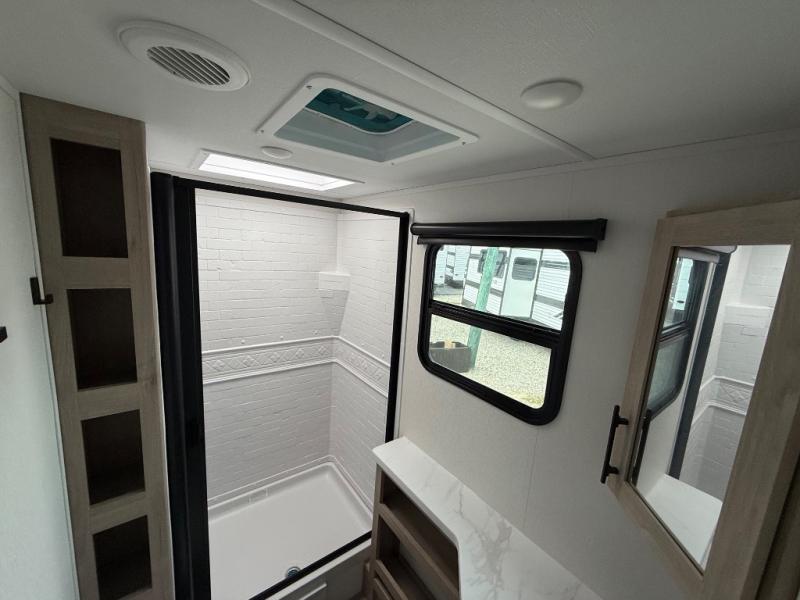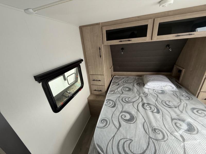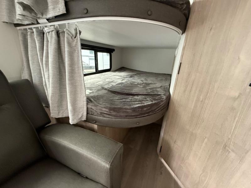 The dual entry doors make it easy to enter and exit this travel trailer! You will find a walk-around queen-size bed up front in the private bedroom, and one of the entry/exit doors to the unit so you can quietly slip out for an early morning fishing trip. The U-shaped dinette is right next to the window, so you can look out at your surroundings while you enjoy breakfast. The double-size bunks have some privacy curtains, and the bunks are right next to the full bathroom for easy access in the middle of the night. The fully equipped kitchen has everything you need to get dinner in the oven, and you can have some more prep space by using the flip-up countertop extension. You even have an outdoor griddle and an outdoor 1.6 cu. ft. refrigerator to enjoy a cold beverage while you cook under the 22' electric awning!