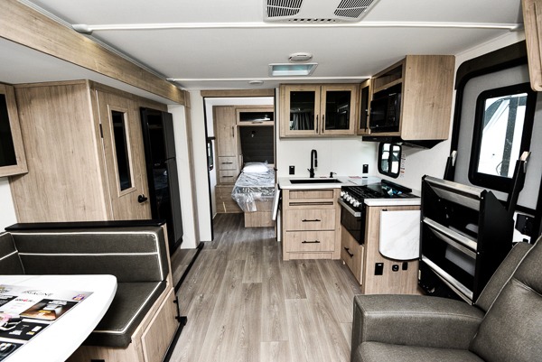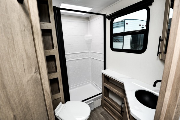 The dual entry doors make it easy to enter and exit this travel trailer! You will find a walk-around queen-size bed up front in the private bedroom, and one of the entry/exit doors to the unit so you can quietly slip out for an early morning fishing trip. The U-shaped dinette is right next to the window, so you can look out at your surroundings while you enjoy breakfast. The double-size bunks have some privacy curtains, and the bunks are right next to the full bathroom for easy access in the middle of the night. The fully equipped kitchen has everything you need to get dinner in the oven, and you can have some more prep space by using the flip-up countertop extension. You even have an outdoor griddle and an outdoor 1.6 cu. ft. refrigerator to enjoy a cold beverage while you cook under the 22' electric awning!