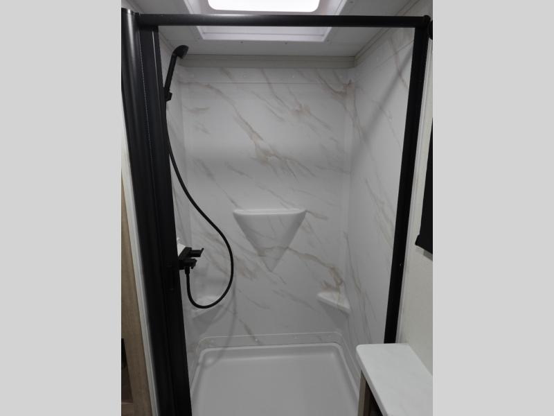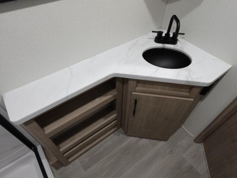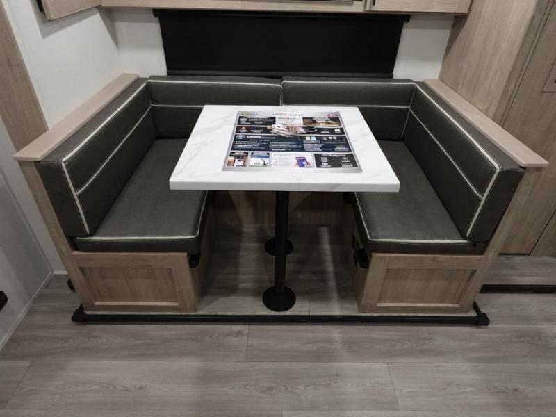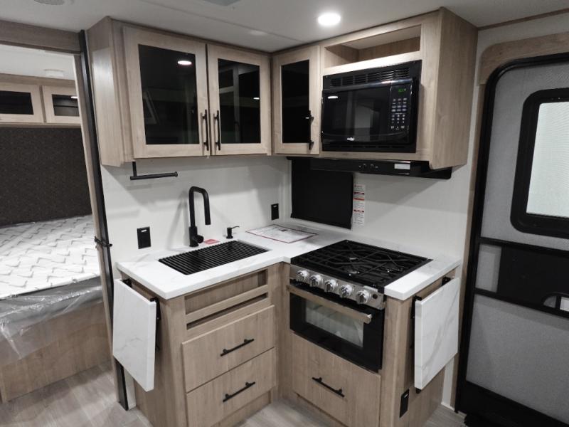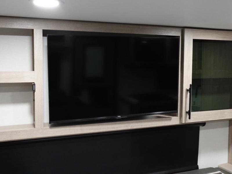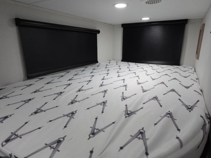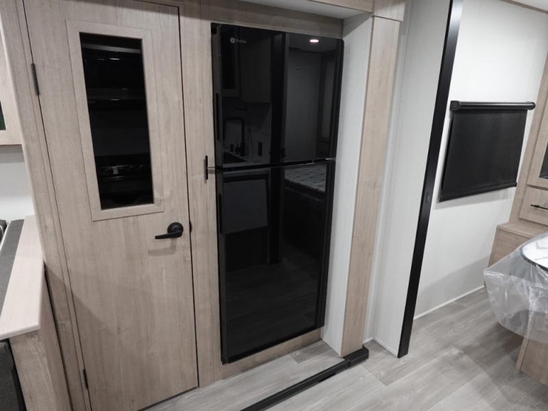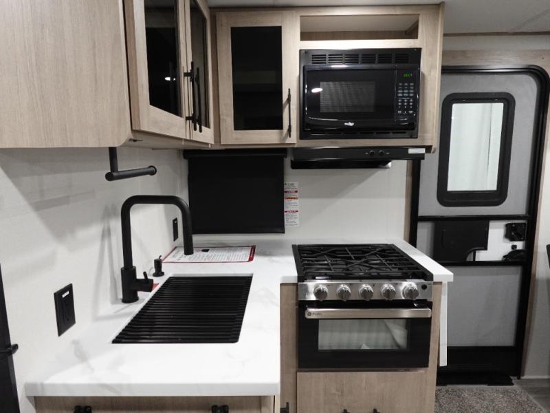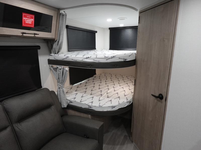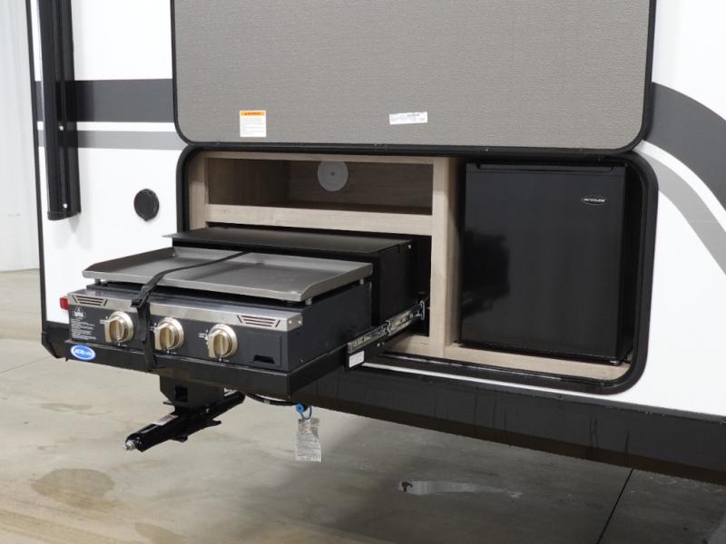 The dual entry doors make it easy to enter and exit this travel trailer! You will find a walk-around queen-size bed up front in the private bedroom, and one of the entry/exit doors to the unit so you can quietly slip out for an early morning fishing trip. The U-shaped dinette is right next to the window, so you can look out at your surroundings while you enjoy breakfast. The double-size bunks have some privacy curtains, and the bunks are right next to the full bathroom for easy access in the middle of the night. The fully equipped kitchen has everything you need to get dinner in the oven, and you can have some more prep space by using the flip-up countertop extension. You even have an outdoor griddle and an outdoor 1.6 cu. ft. refrigerator to enjoy a cold beverage while you cook under the 22' electric awning!