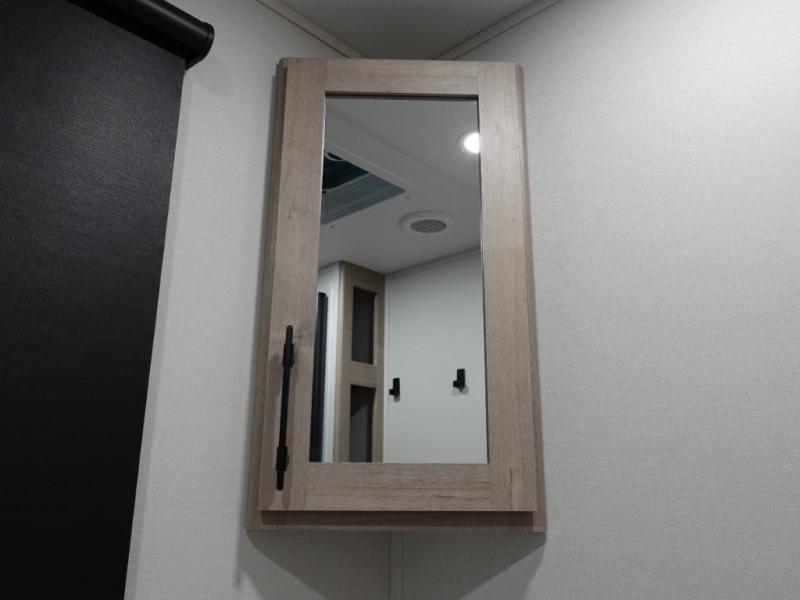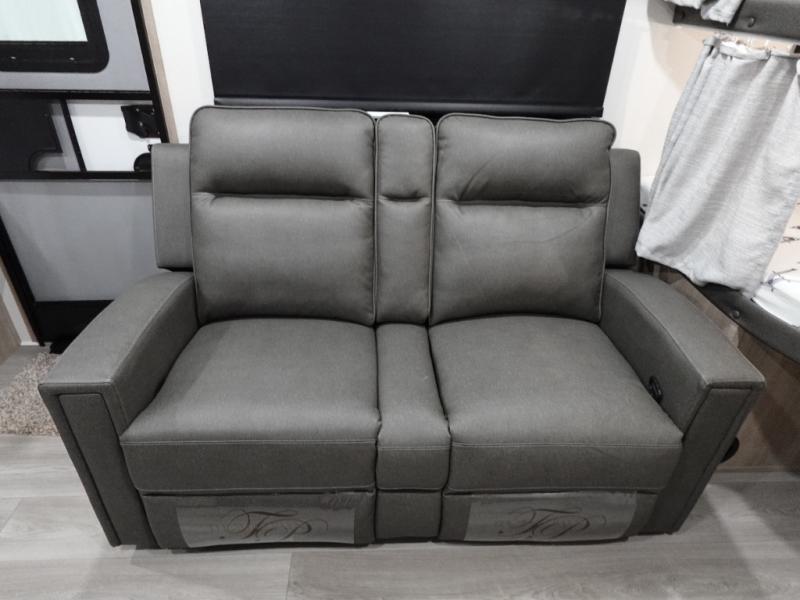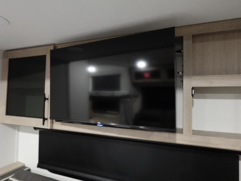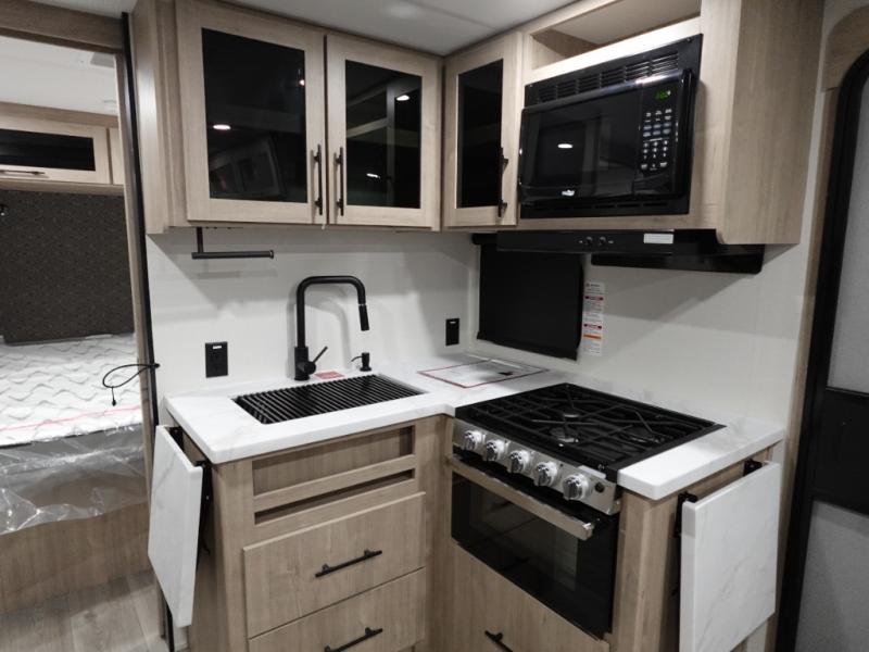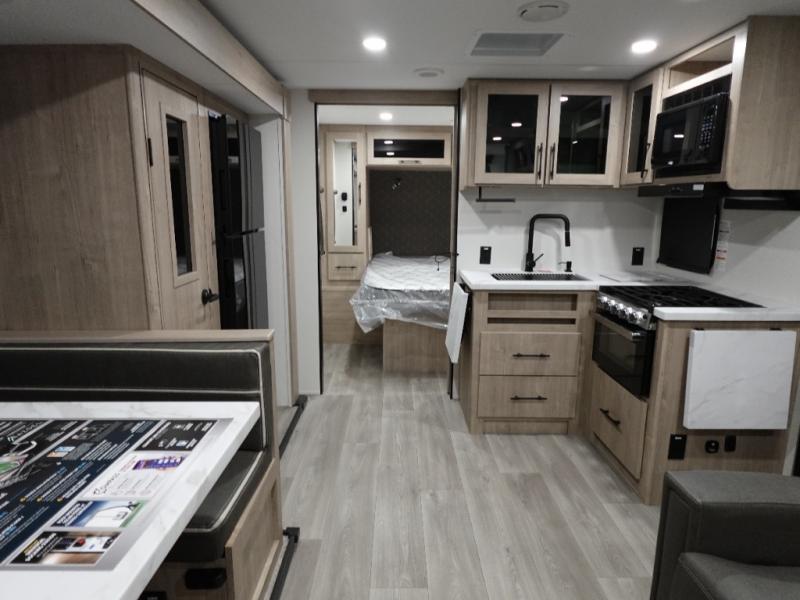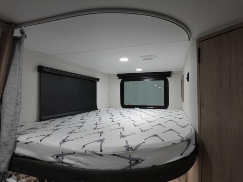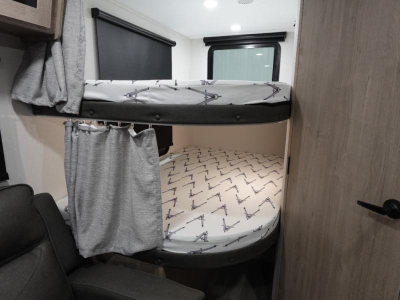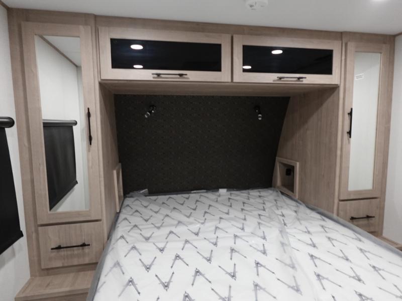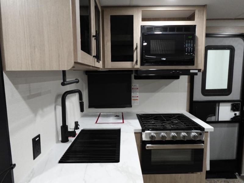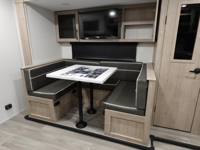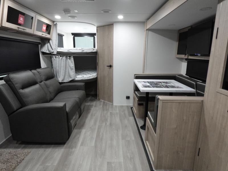 The dual entry doors make it easy to enter and exit this travel trailer! You will find a walk-around queen-size bed up front in the private bedroom, and one of the entry/exit doors to the unit so you can quietly slip out for an early morning fishing trip. The U-shaped dinette is right next to the window, so you can look out at your surroundings while you enjoy breakfast. The double-size bunks have some privacy curtains, and the bunks are right next to the full bathroom for easy access in the middle of the night. The fully equipped kitchen has everything you need to get dinner in the oven, and you can have some more prep space by using the flip-up countertop extension. You even have an outdoor griddle and an outdoor 1.6 cu. ft. refrigerator to enjoy a cold beverage while you cook under the 22' electric awning!