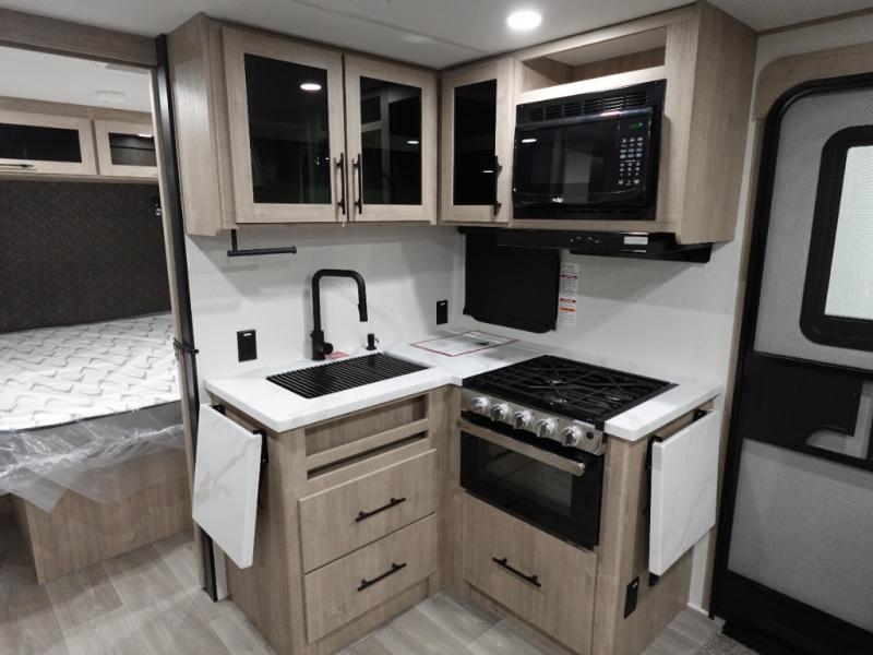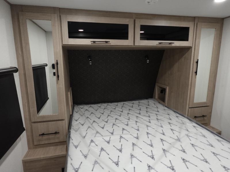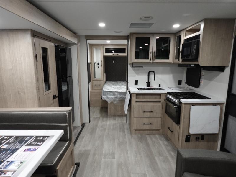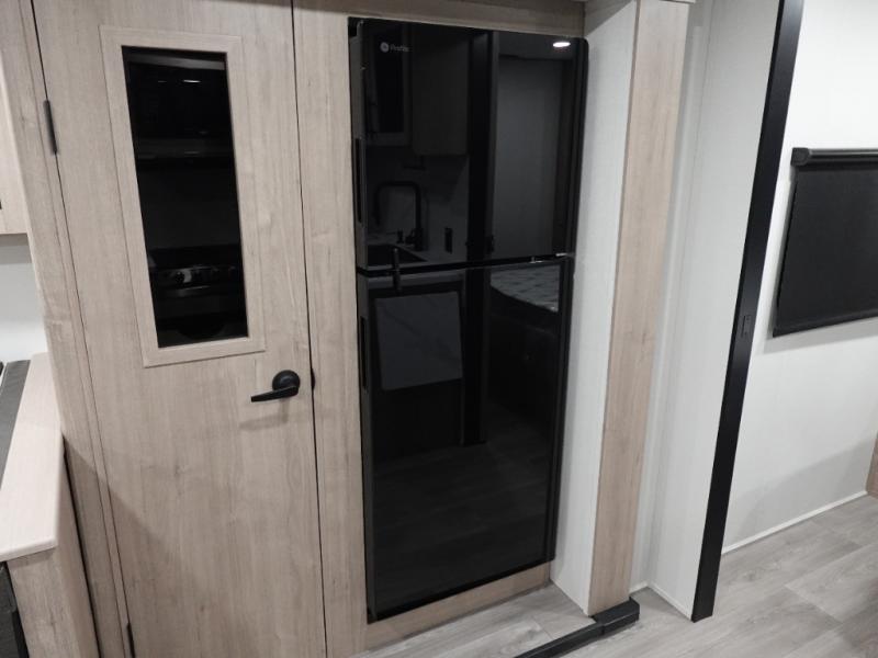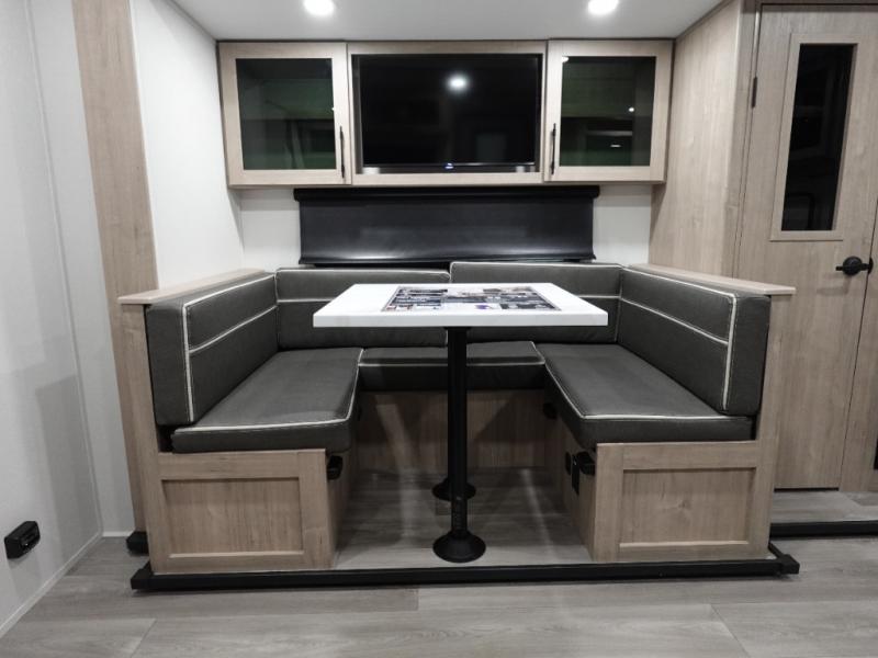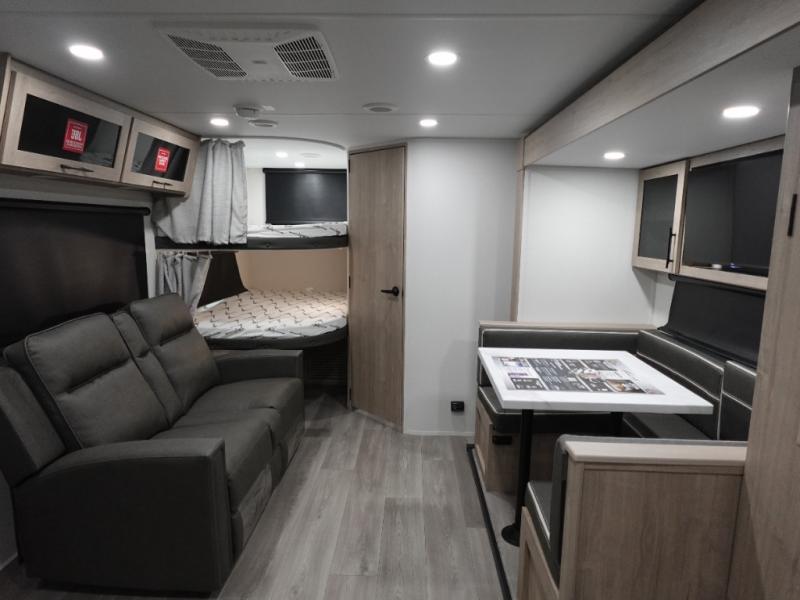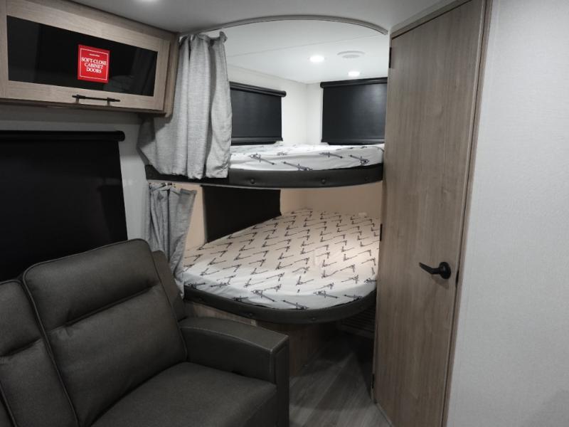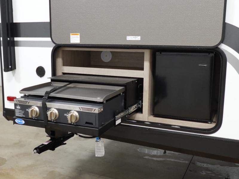 The dual entry doors make it easy to enter and exit this travel trailer! You will find a walk-around queen-size bed up front in the private bedroom, and one of the entry/exit doors to the unit so you can quietly slip out for an early morning fishing trip. The U-shaped dinette is right next to the window, so you can look out at your surroundings while you enjoy breakfast. The double-size bunks have some privacy curtains, and the bunks are right next to the full bathroom for easy access in the middle of the night. The fully equipped kitchen has everything you need to get dinner in the oven, and you can have some more prep space by using the flip-up countertop extension. You even have an outdoor griddle and an outdoor 1.6 cu. ft. refrigerator to enjoy a cold beverage while you cook under the 22' electric awning!