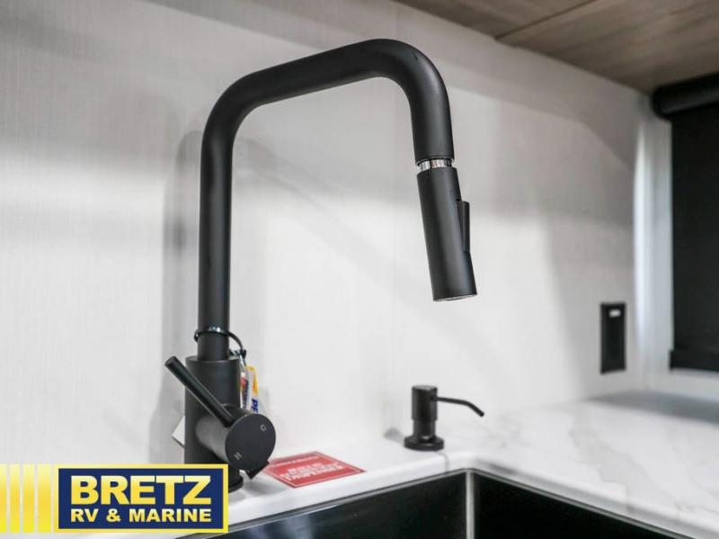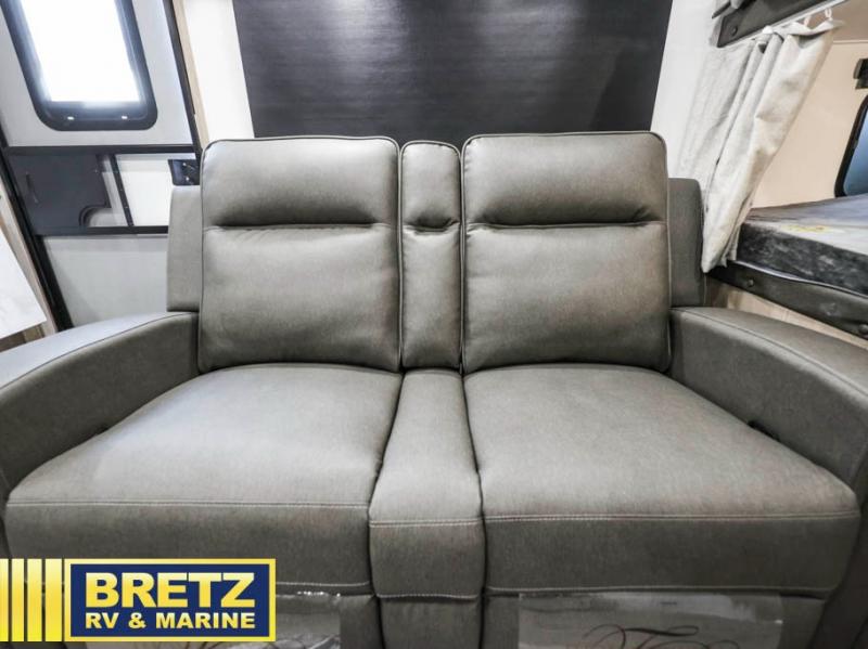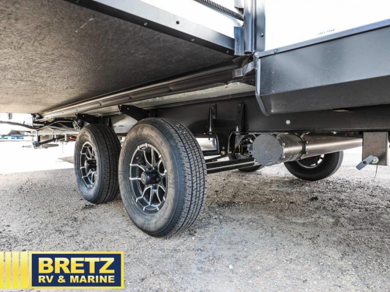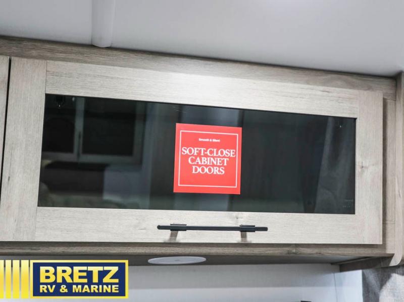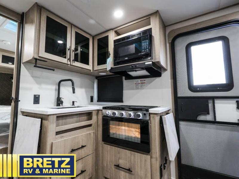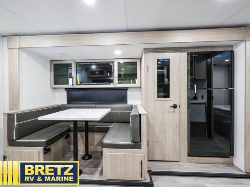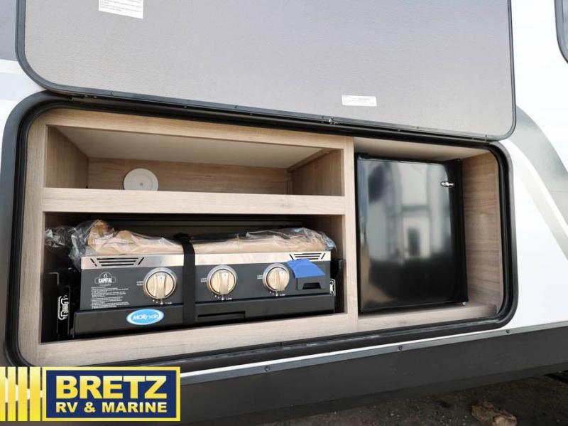 The dual entry doors make it easy to enter and exit this travel trailer! You will find a walk-around queen-size bed up front in the private bedroom, and one of the entry/exit doors to the unit so you can quietly slip out for an early morning fishing trip. The U-shaped dinette is right next to the window, so you can look out at your surroundings while you enjoy breakfast. The double-size bunks have some privacy curtains, and the bunks are right next to the full bathroom for easy access in the middle of the night. The fully equipped kitchen has everything you need to get dinner in the oven, and you can have some more prep space by using the flip-up countertop extension. You even have an outdoor griddle and an outdoor 1.6 cu. ft. refrigerator to enjoy a cold beverage while you cook under the 22' electric awning!