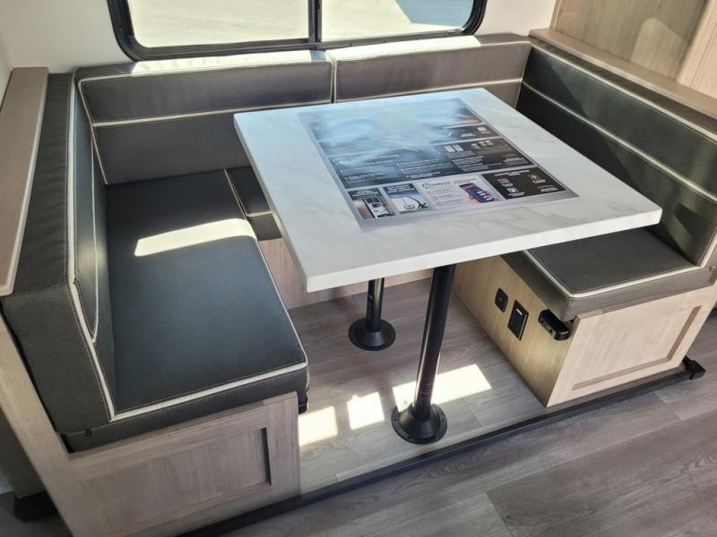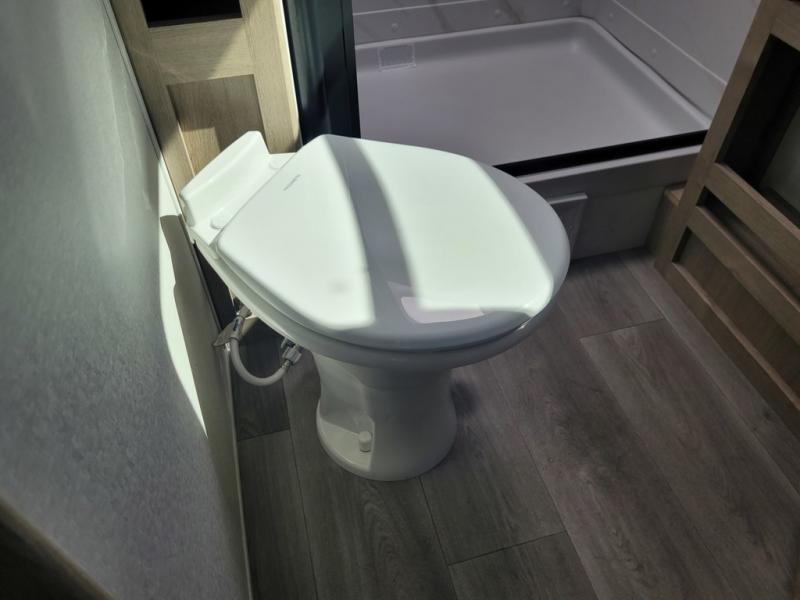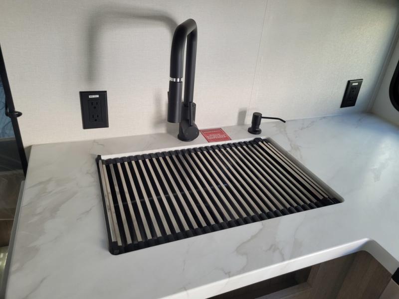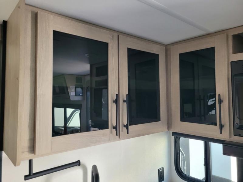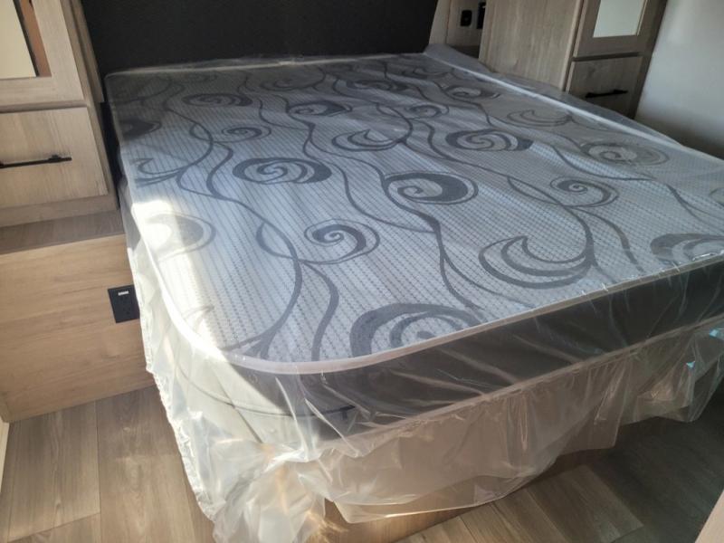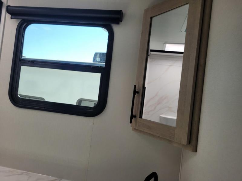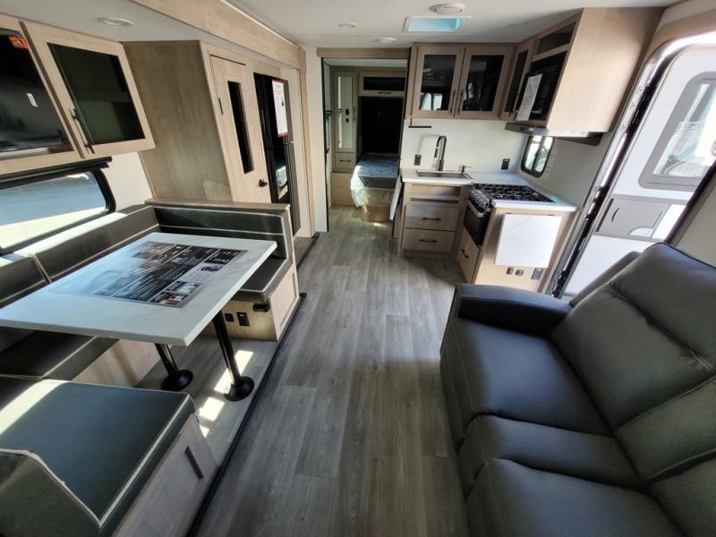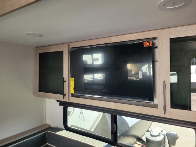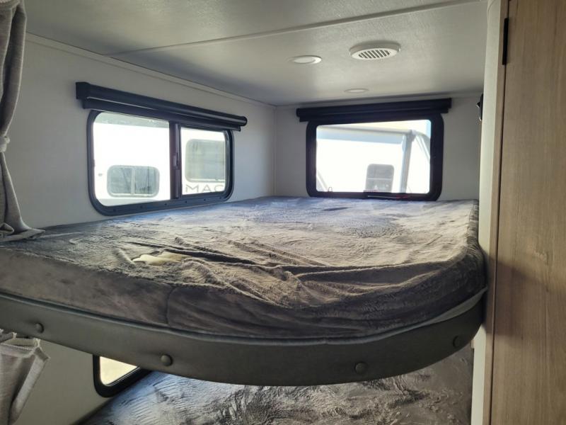 The dual entry doors make it easy to enter and exit this travel trailer! You will find a walk-around queen-size bed up front in the private bedroom, and one of the entry/exit doors to the unit so you can quietly slip out for an early morning fishing trip. The U-shaped dinette is right next to the window, so you can look out at your surroundings while you enjoy breakfast. The double-size bunks have some privacy curtains, and the bunks are right next to the full bathroom for easy access in the middle of the night. The fully equipped kitchen has everything you need to get dinner in the oven, and you can have some more prep space by using the flip-up countertop extension. You even have an outdoor griddle and an outdoor 1.6 cu. ft. refrigerator to enjoy a cold beverage while you cook under the 22' electric awning!