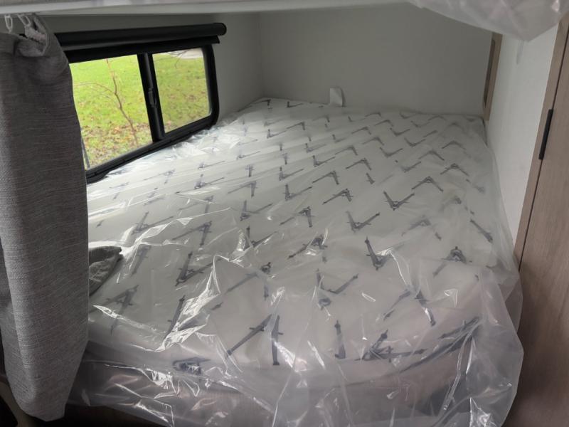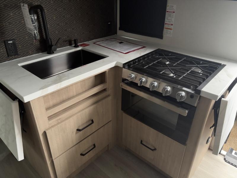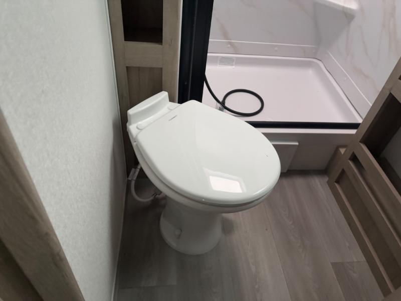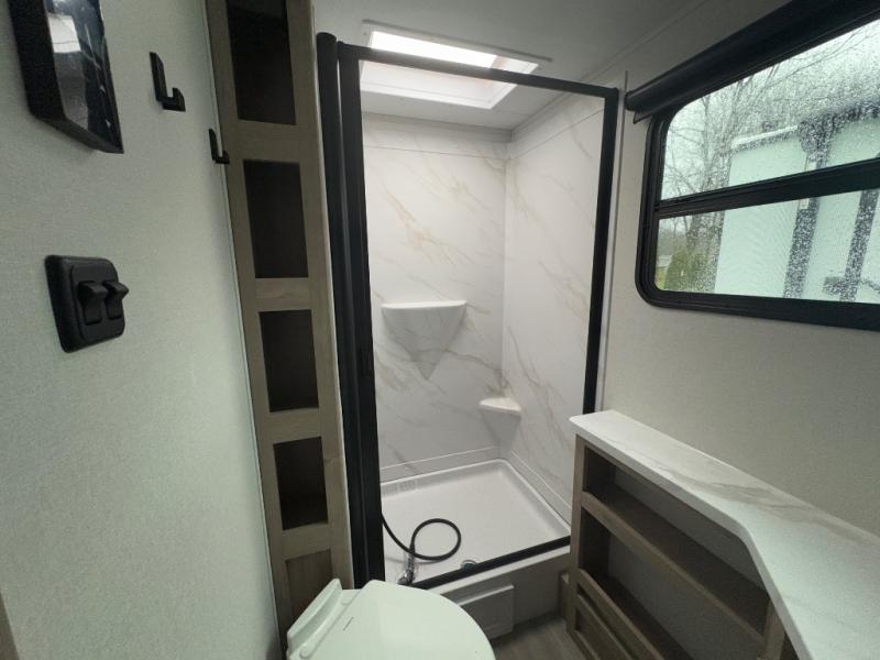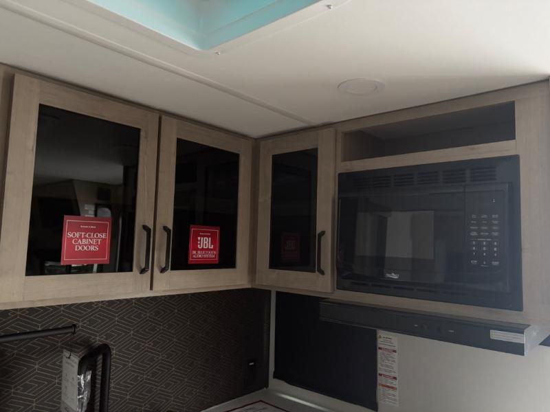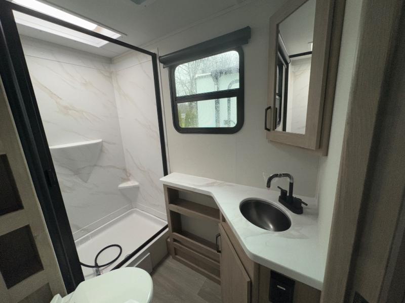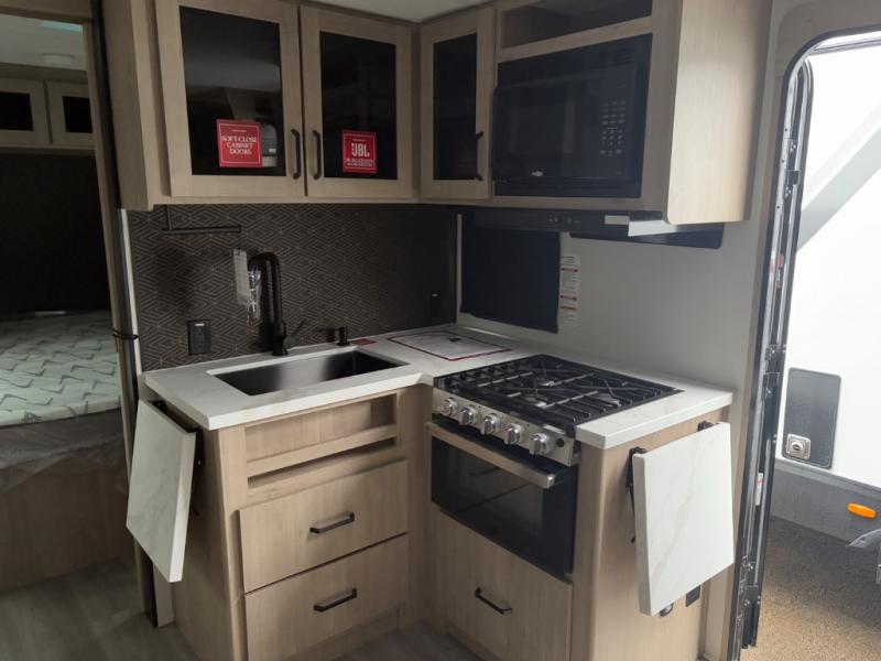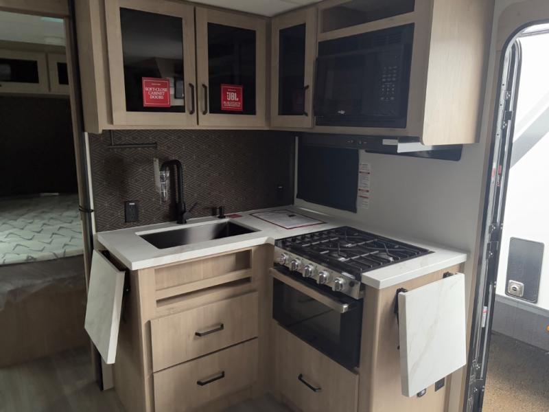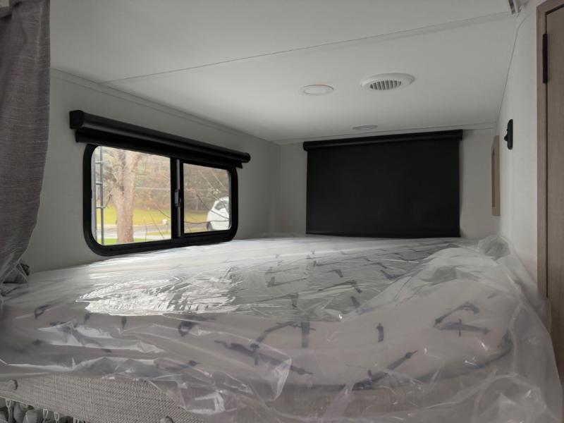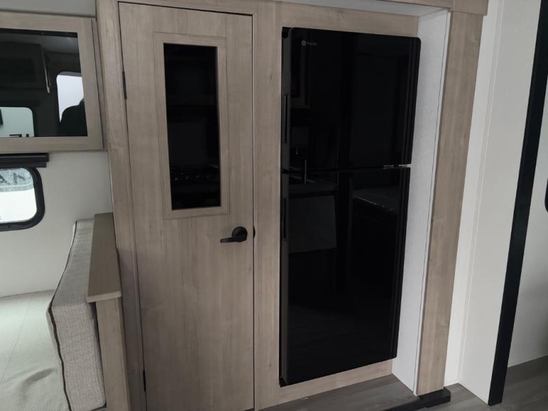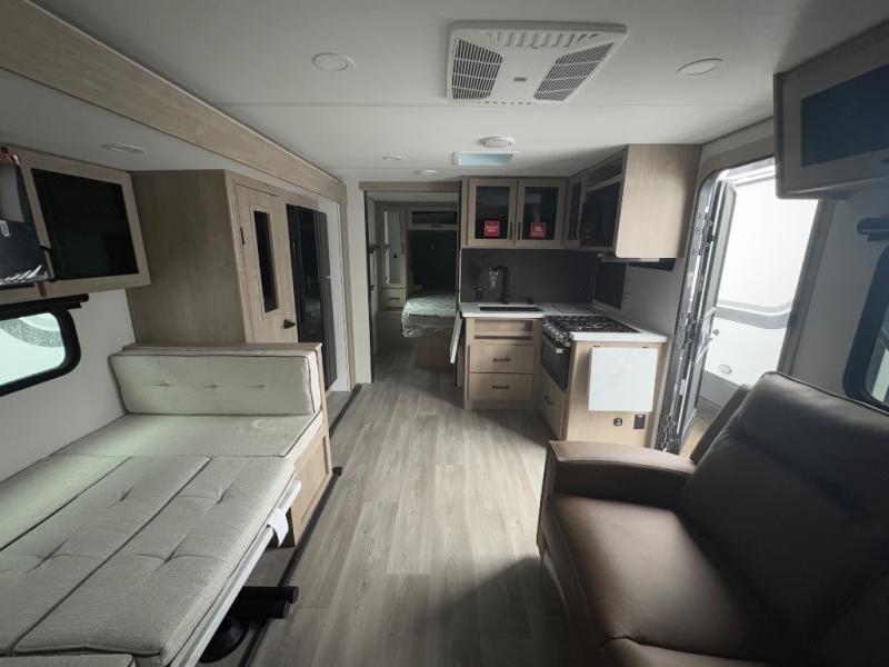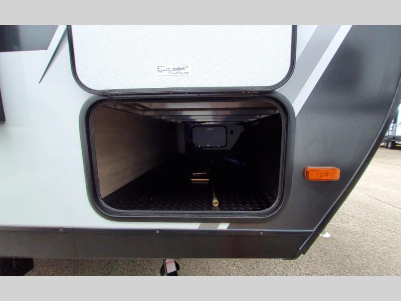 The dual entry doors make it easy to enter and exit this travel trailer! You will find a walk-around queen-size bed up front in the private bedroom, and one of the entry/exit doors to the unit so you can quietly slip out for an early morning fishing trip. The U-shaped dinette is right next to the window, so you can look out at your surroundings while you enjoy breakfast. The double-size bunks have some privacy curtains, and the bunks are right next to the full bathroom for easy access in the middle of the night. The fully equipped kitchen has everything you need to get dinner in the oven, and you can have some more prep space by using the flip-up countertop extension. You even have an outdoor griddle and an outdoor 1.6 cu. ft. refrigerator to enjoy a cold beverage while you cook under the 22' electric awning!