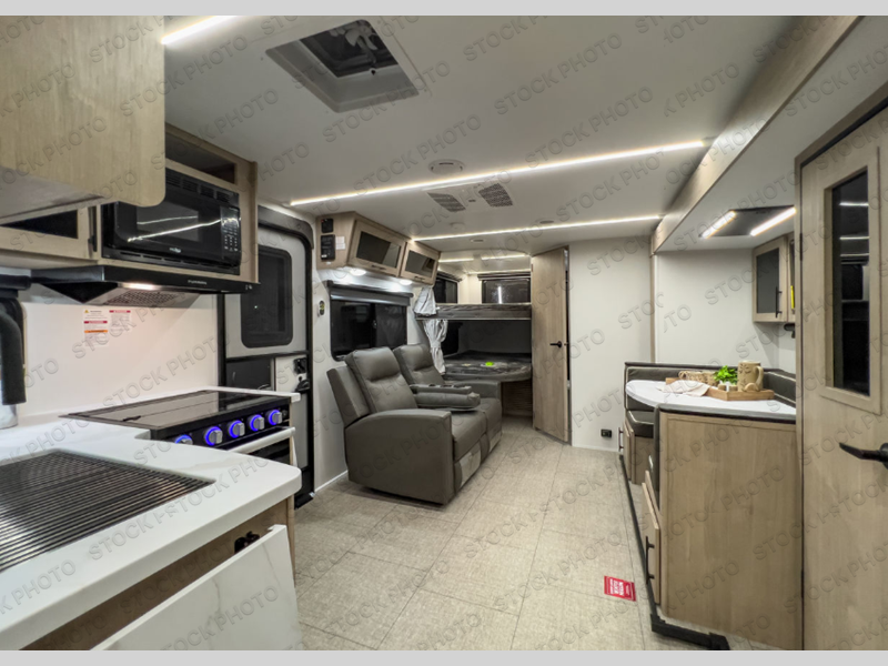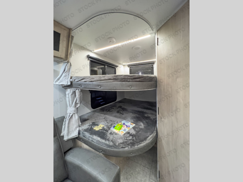 The dual entry doors make it easy to enter and exit this travel trailer! You will find a walk-around queen-size bed up front in the private bedroom, and one of the entry/exit doors to the unit so you can quietly slip out for an early morning fishing trip. The U-shaped dinette is right next to the window, so you can look out at your surroundings while you enjoy breakfast. The double-size bunks have some privacy curtains, and the bunks are right next to the full bathroom for easy access in the middle of the night. The fully equipped kitchen has everything you need to get dinner in the oven, and you can have some more prep space by using the flip-up countertop extension. You even have an outdoor griddle and an outdoor 1.6 cu. ft. refrigerator to enjoy a cold beverage while you cook under the 22' electric awning!