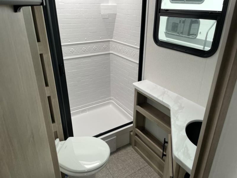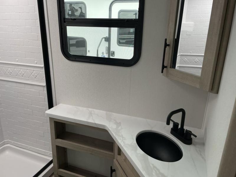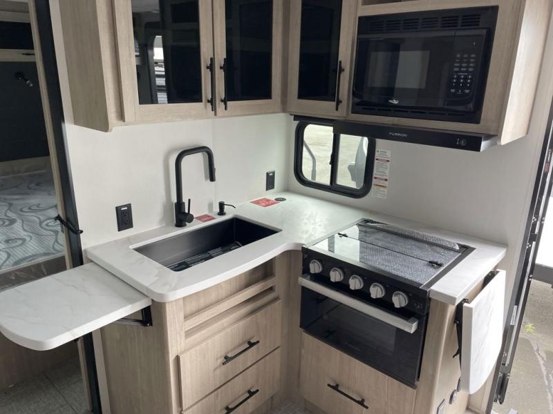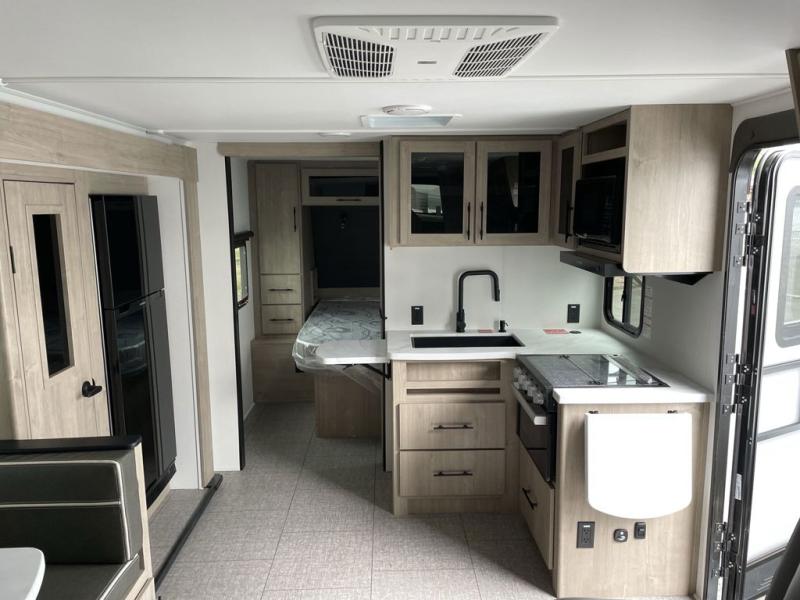 The dual entry doors make it easy to enter and exit this travel trailer! You will find a walk-around queen-size bed up front in the private bedroom, and one of the entry/exit doors to the unit so you can quietly slip out for an early morning fishing trip. The U-shaped dinette is right next to the window, so you can look out at your surroundings while you enjoy breakfast. The double-size bunks have some privacy curtains, and the bunks are right next to the full bathroom for easy access in the middle of the night. The fully equipped kitchen has everything you need to get dinner like a 3 burner range with oven and microwave, and you can have some more prep space by using the flip-up countertop extension. You even have an outdoor griddle and an outdoor 1.6 cu. ft. refrigerator to enjoy a cold beverage while you cook under the 22' electric awning!