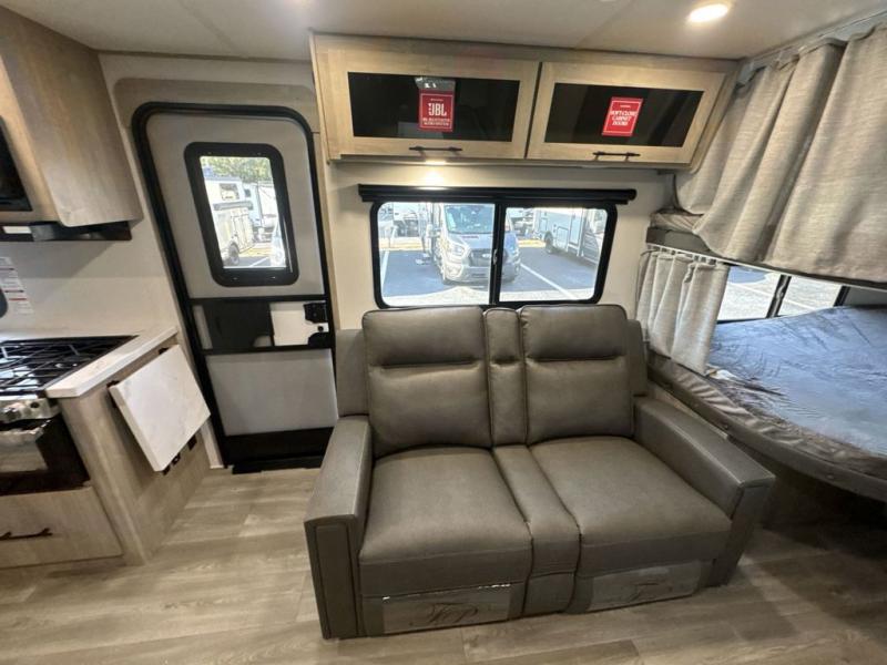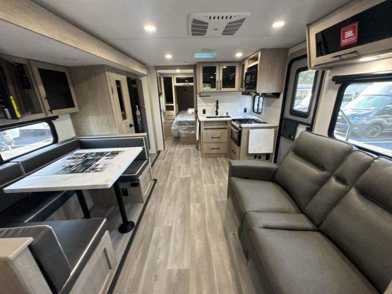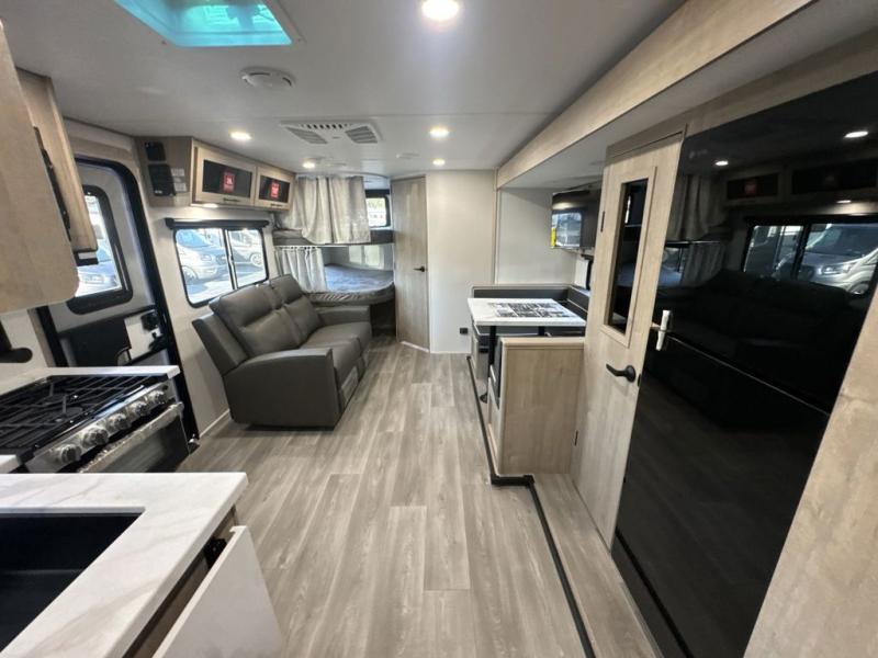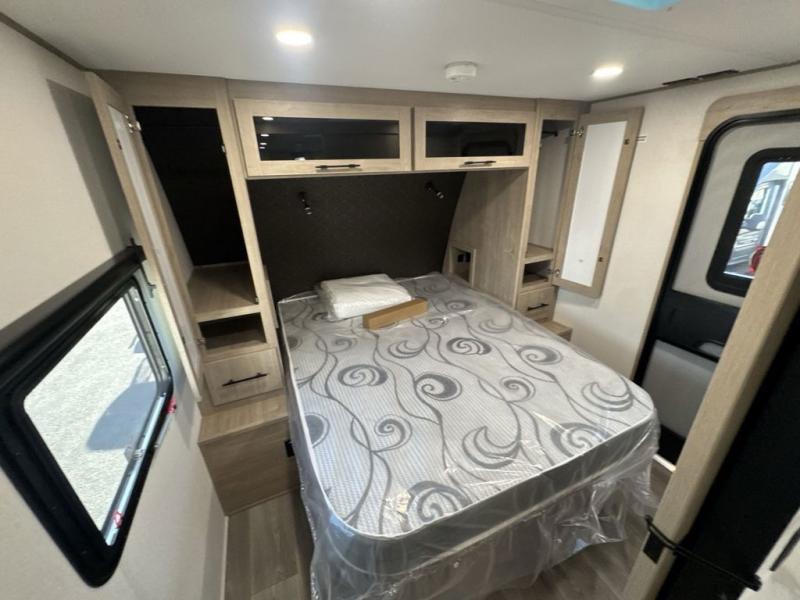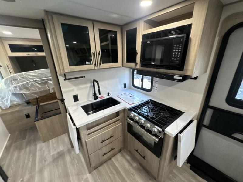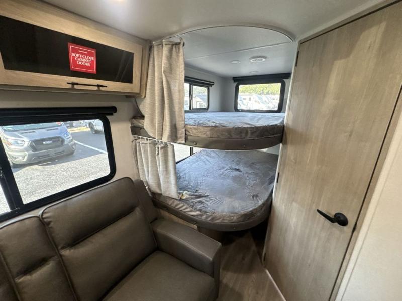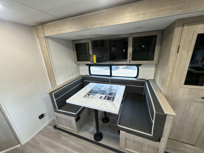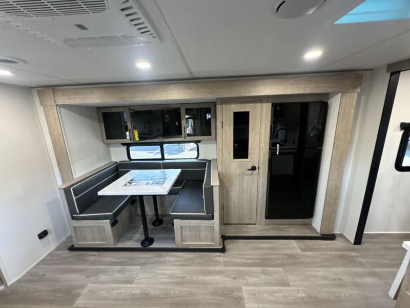 The dual entry doors make it easy to enter and exit this travel trailer! You will find a walk-around queen-size bed up front in the private bedroom, and one of the entry/exit doors to the unit so you can quietly slip out for an early morning fishing trip. The U-shaped dinette is right next to the window, so you can look out at your surroundings while you enjoy breakfast. The double-size bunks have some privacy curtains, and the bunks are right next to the full bathroom for easy access in the middle of the night. The fully equipped kitchen has everything you need to get dinner like a 3 burner range with oven and microwave, and you can have some more prep space by using the flip-up countertop extension. You even have an outdoor griddle and an outdoor 1.6 cu. ft. refrigerator to enjoy a cold beverage while you cook under the 22' electric awning!