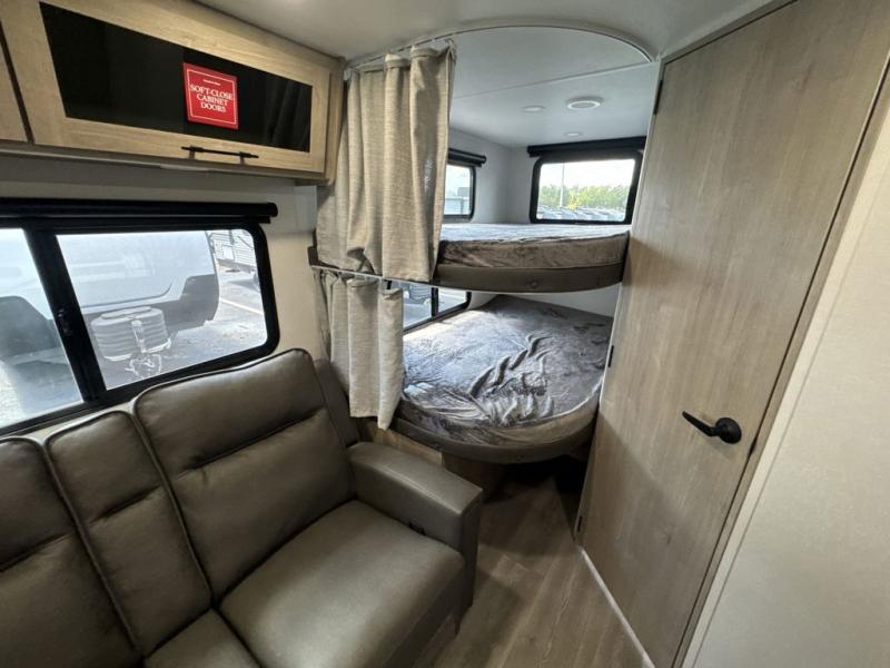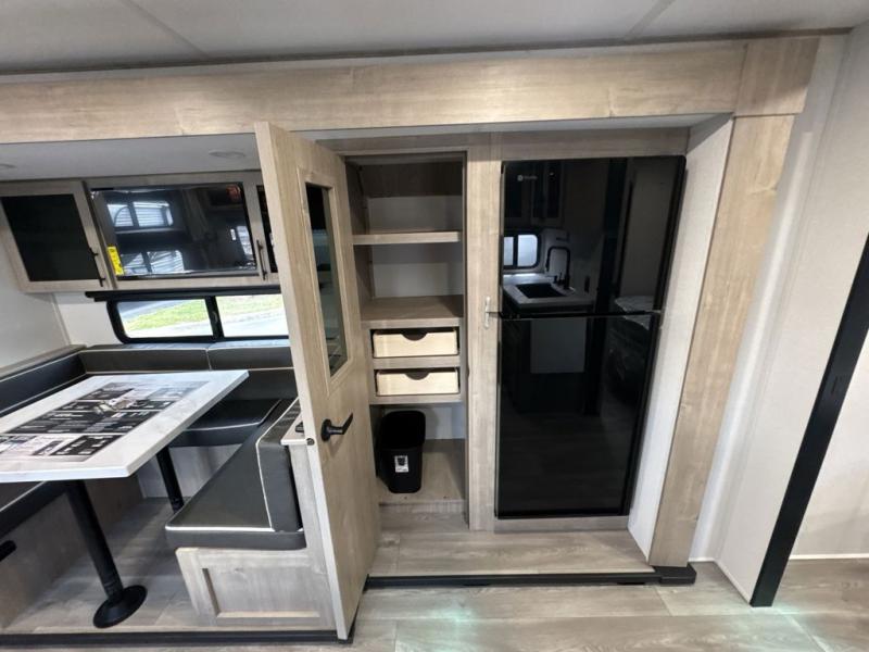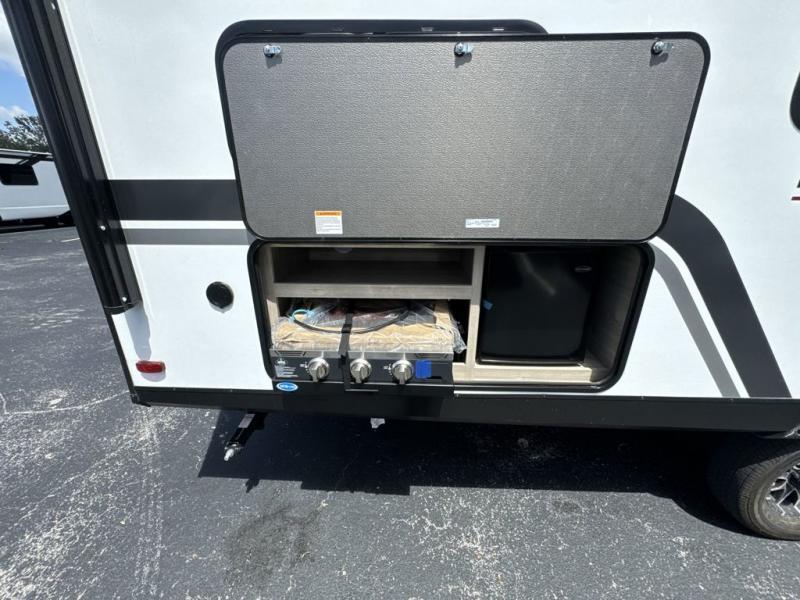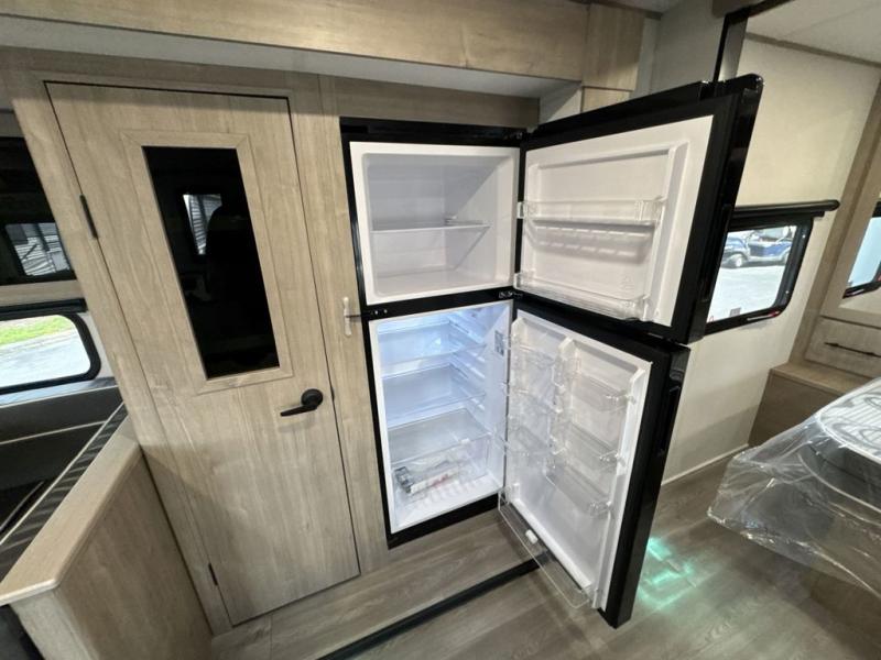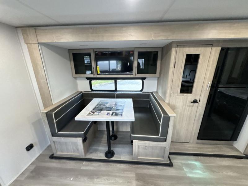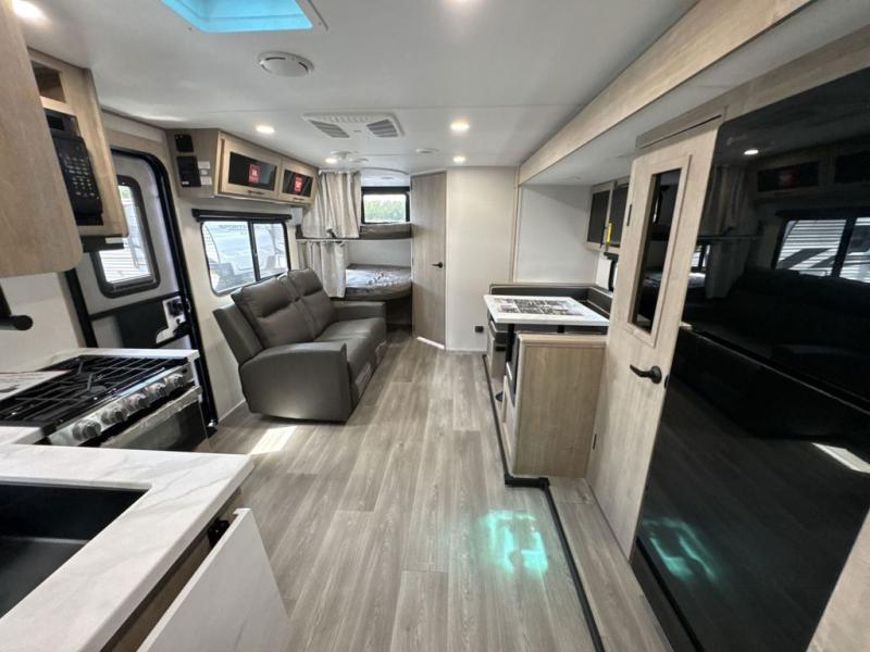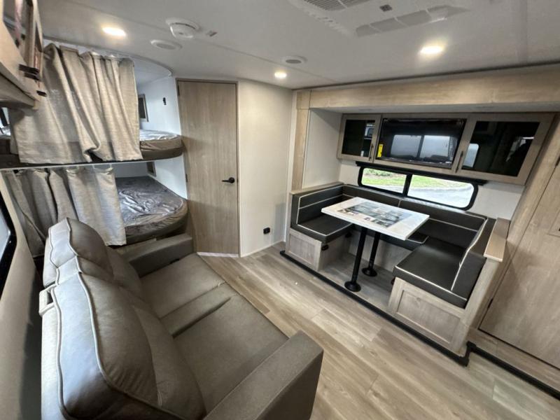 The dual entry doors make it easy to enter and exit this travel trailer! You will find a walk-around queen-size bed up front in the private bedroom, and one of the entry/exit doors to the unit so you can quietly slip out for an early morning fishing trip. The U-shaped dinette is right next to the window, so you can look out at your surroundings while you enjoy breakfast. The double-size bunks have some privacy curtains, and the bunks are right next to the full bathroom for easy access in the middle of the night. The fully equipped kitchen has everything you need to get dinner like a 3 burner range with oven and microwave, and you can have some more prep space by using the flip-up countertop extension. You even have an outdoor griddle and an outdoor 1.6 cu. ft. refrigerator to enjoy a cold beverage while you cook under the 22' electric awning!