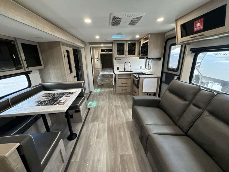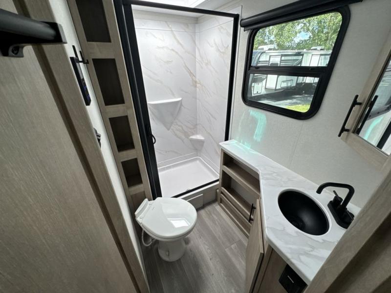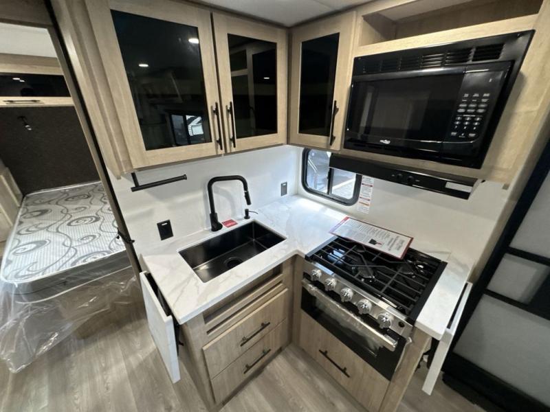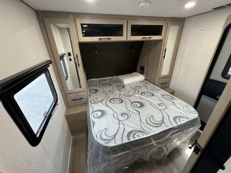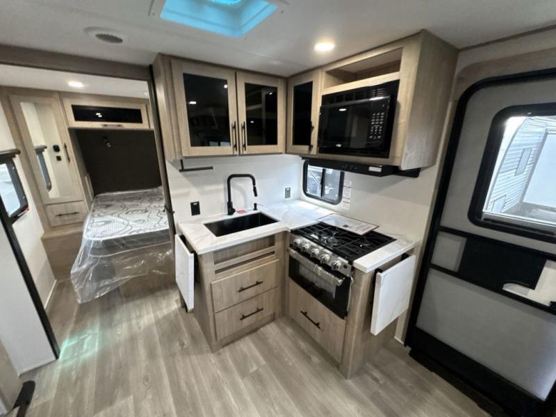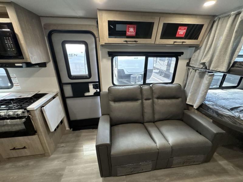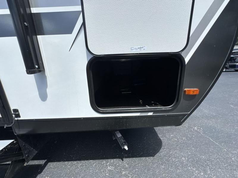 The dual entry doors make it easy to enter and exit this travel trailer! You will find a walk-around queen-size bed up front in the private bedroom, and one of the entry/exit doors to the unit so you can quietly slip out for an early morning fishing trip. The U-shaped dinette is right next to the window, so you can look out at your surroundings while you enjoy breakfast. The double-size bunks have some privacy curtains, and the bunks are right next to the full bathroom for easy access in the middle of the night. The fully equipped kitchen has everything you need to get dinner like a 3 burner range with oven and microwave, and you can have some more prep space by using the flip-up countertop extension. You even have an outdoor griddle and an outdoor 1.6 cu. ft. refrigerator to enjoy a cold beverage while you cook under the 22' electric awning!
