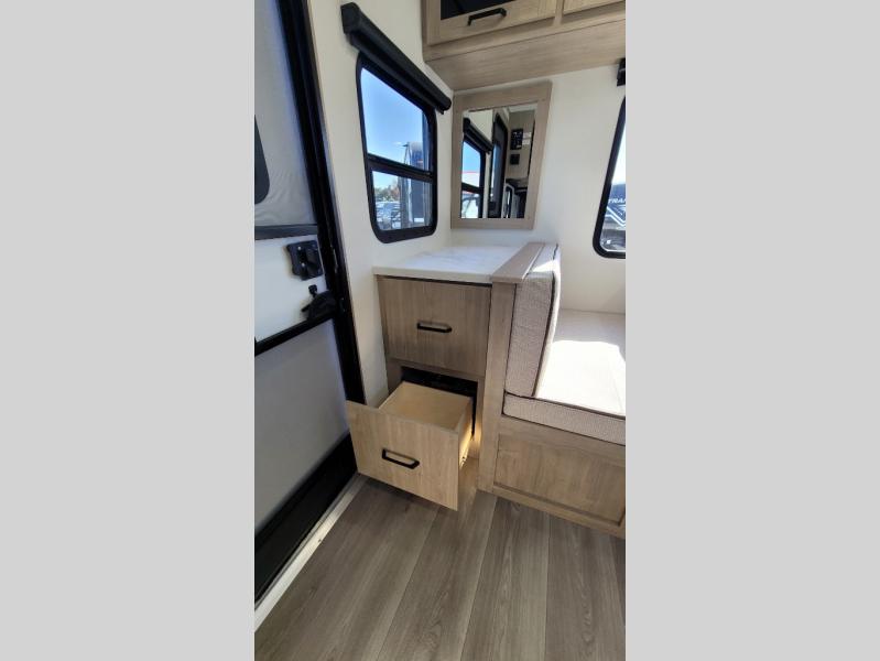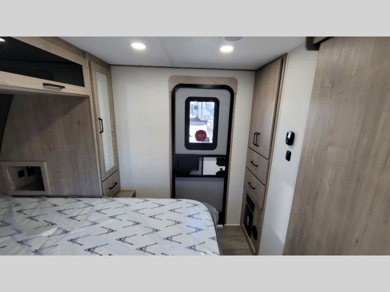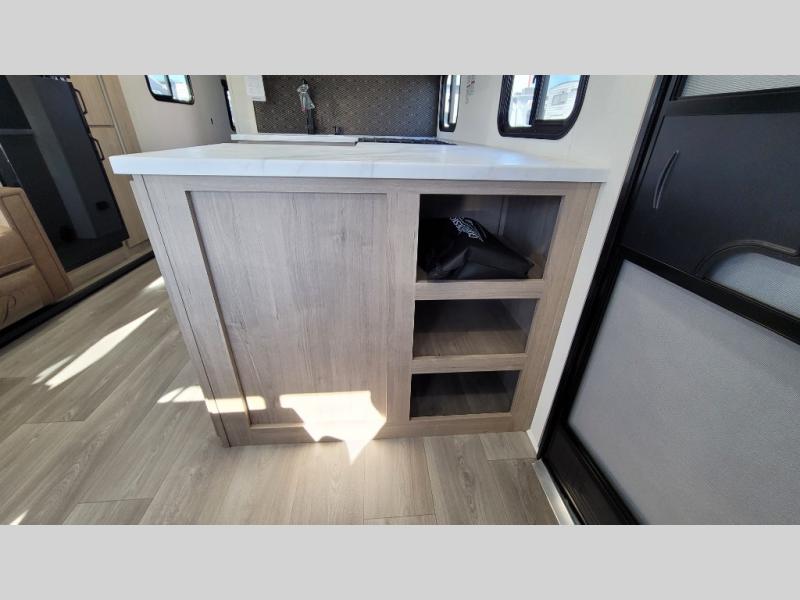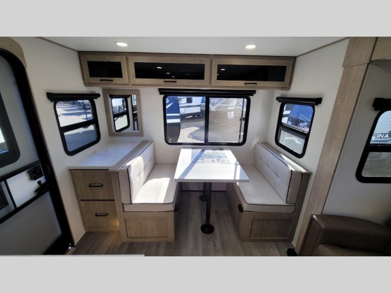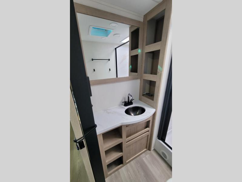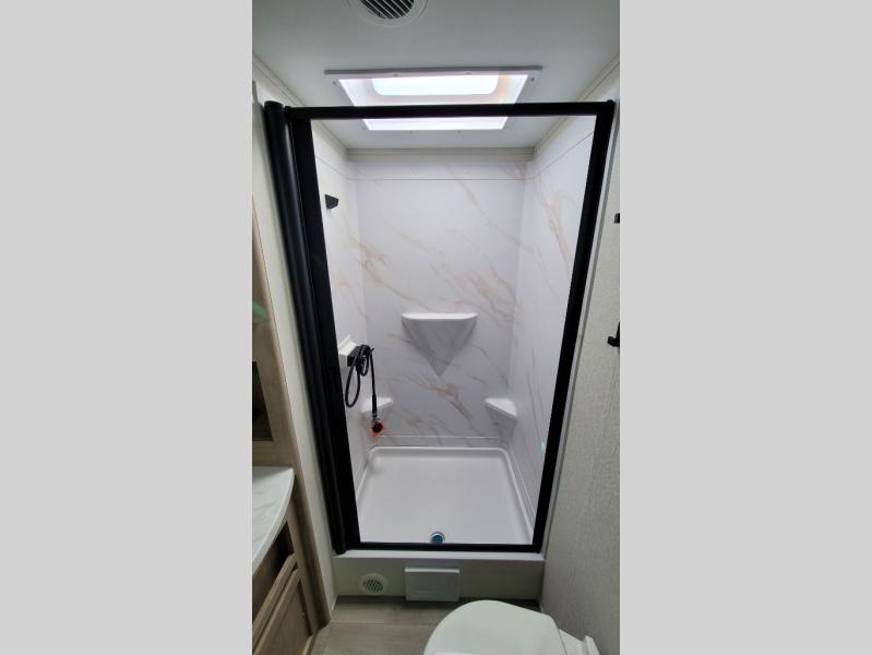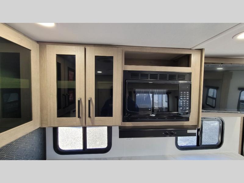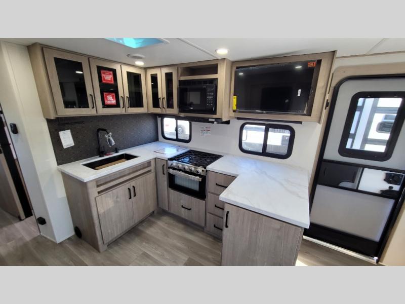 This 25RLE model travel trailer is designed for both comfort and convenience from front to back. At the front, the private bedroom features a spacious 60" x 80" queen bed with built-in wardrobe cubby storage and one of two entry doors for easy access. Moving down the hall, the full bathroom offers a residential-style walk-in shower with a skylight that adds both light and headroom, along with a mirrored medicine cabinet and linen shelves for towels and toiletries. The main living area opens up with a large slide out that houses 60" theater seating and a 10-cu. ft. refrigerator for all your fresh groceries, while a nearby pantry keeps your dry goods organized. Across from the slide, the U-shaped kitchen provides ample counter space, a three-burner range with oven, stainless steel sink, and microwave, everything you need to cook in comfort. At the rear, the booth dinette creates the perfect spot for meals or games and easily converts into an extra-sleeping area when needed.